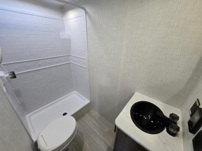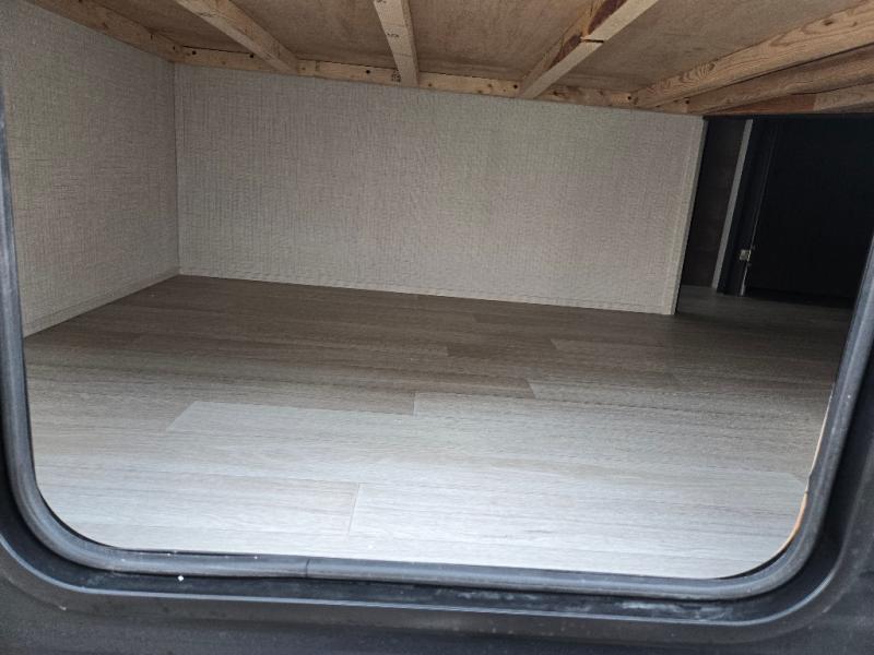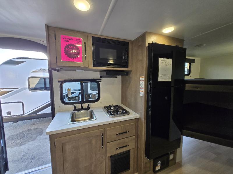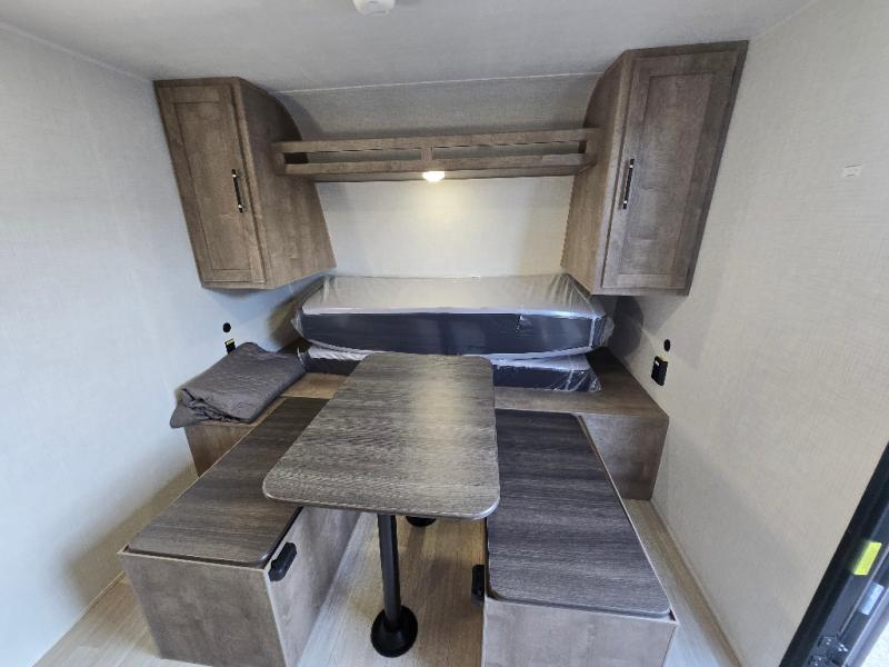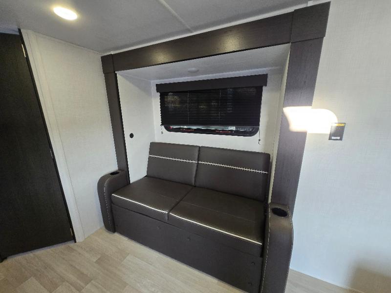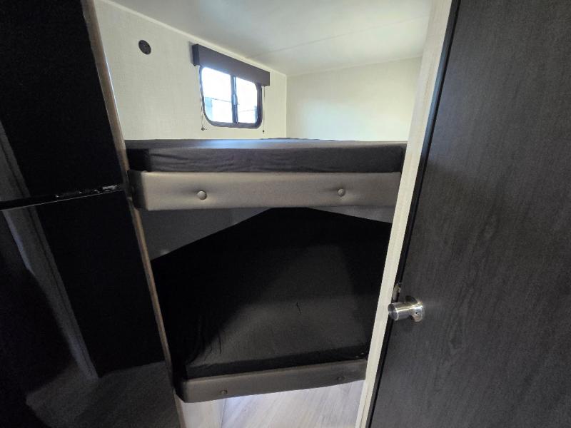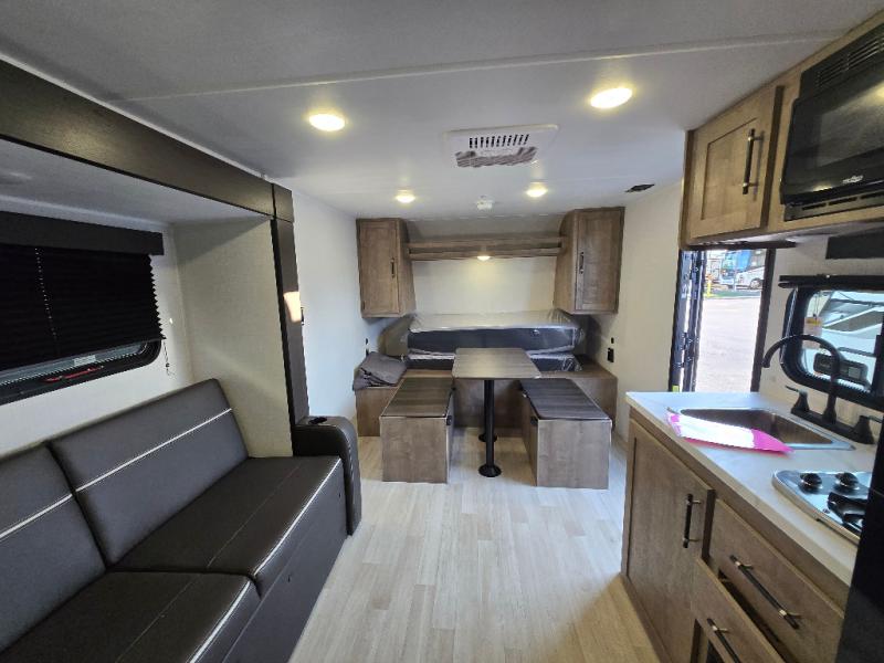 Camping trips just got easier travel trailer with double-size bunks and a sofa slide out for more sleeping and floor space! There is a two-burner cooktop and microwave oven to cook meals each day, plus a 10-cu. ft. 12V refrigerator for food storage. Up front, you'll find a picnic table to dine at, plus a Murphy style pull-out Olympic RV queen-size bed, giving you both seating and sleeping space. Dual bedside wardrobes will let you keep your clothes organized, and an exterior pass-through storage will be perfect for fishing poles, camp chairs and more!