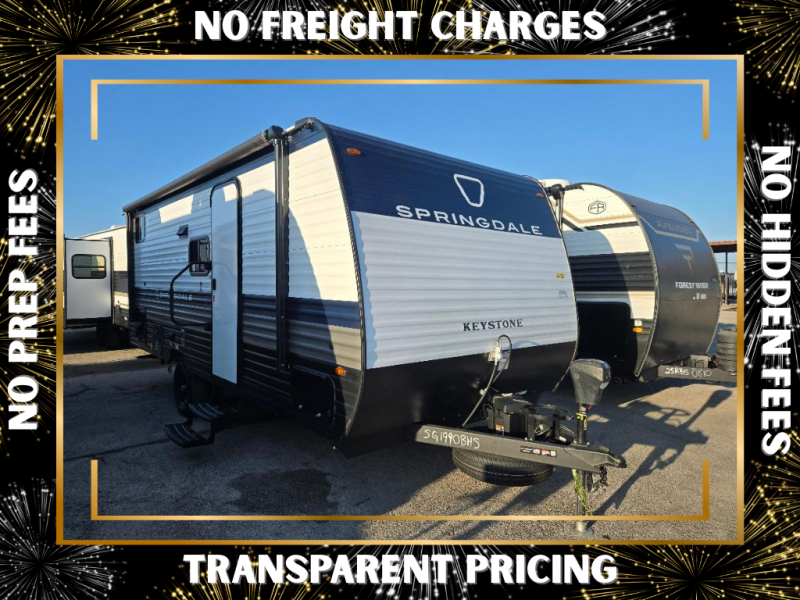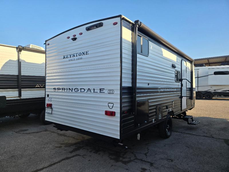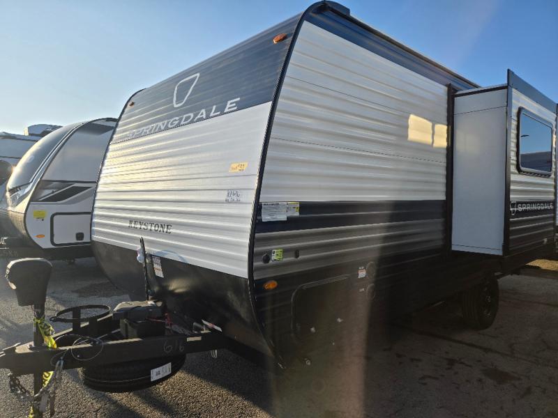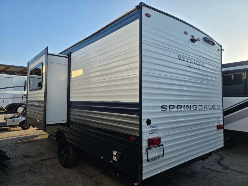 With any Springdale Mini travel trailer by Keystone, you will enjoy lightweight towing thanks to their single axle! The XL tinted safety glass windows are ultra durable, and the power awning will provide protection from the sun as you relax in your camp chairs outside. Each model includes blackout night shades, LED lighting, plus many more interior comforts. There is also a 20K BTU furnace to keep you comfortable, plus a tankless water heater for endless hot showers!