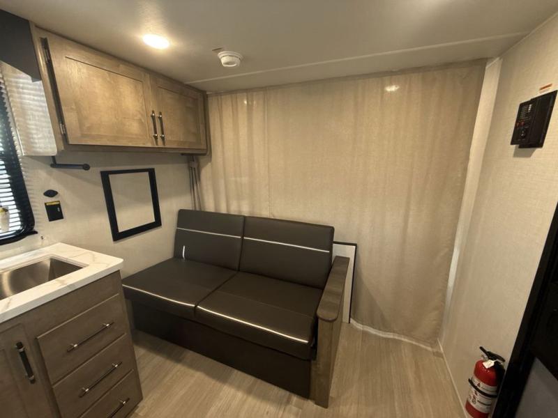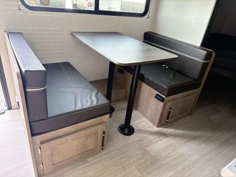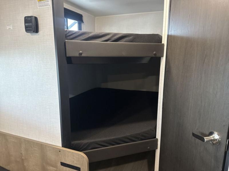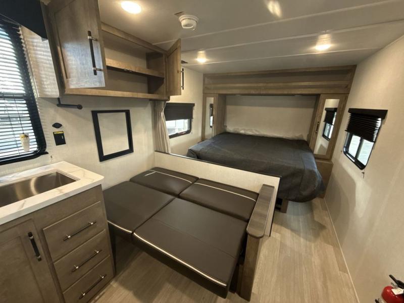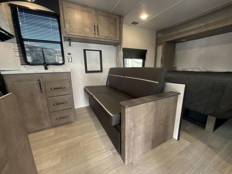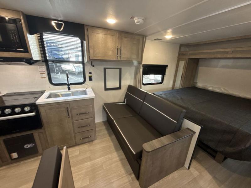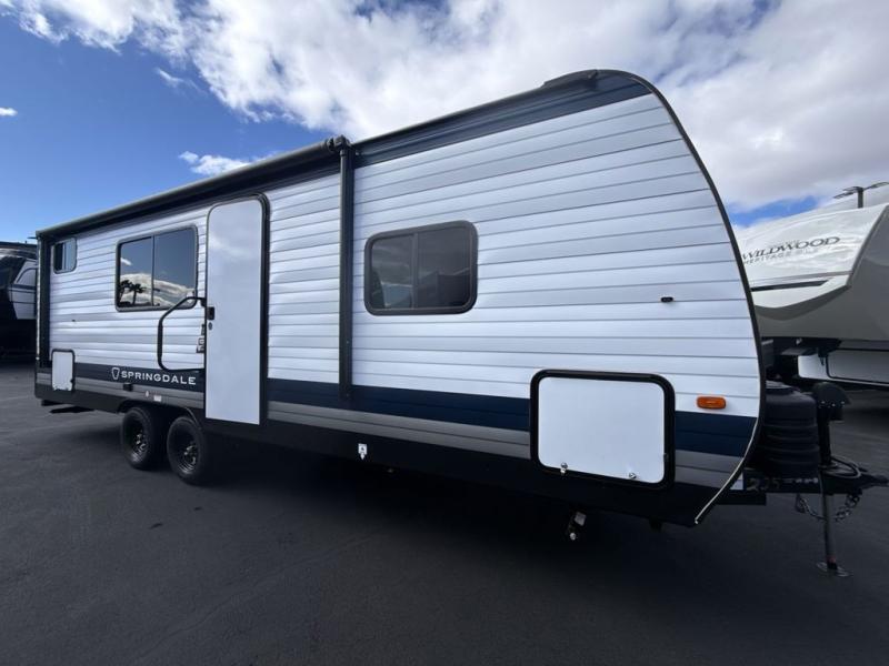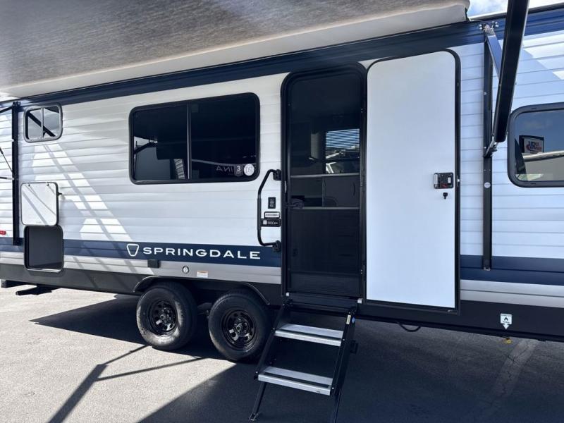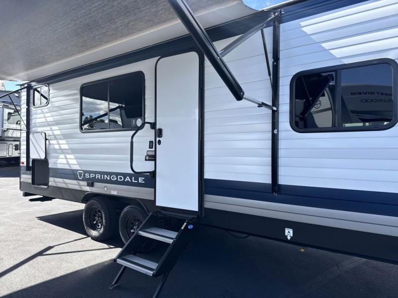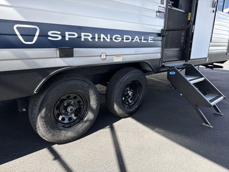 This cute Springdale Mini bunk model will easily sleep seven with the double-size bunks, booth dinette, and queen Murphy bed which features a fold-down sofa at the end. During the daytime, you can have the seating you need and want, and at night the sofa folds to become part of the front bed. The rear corner bath is convenient and features a tub, toilet, and sink. The kitchen is fully equipped to allow you to cook as you travel, and you can enjoy meals while under the 15' power awning.