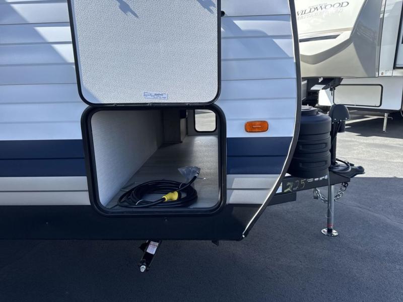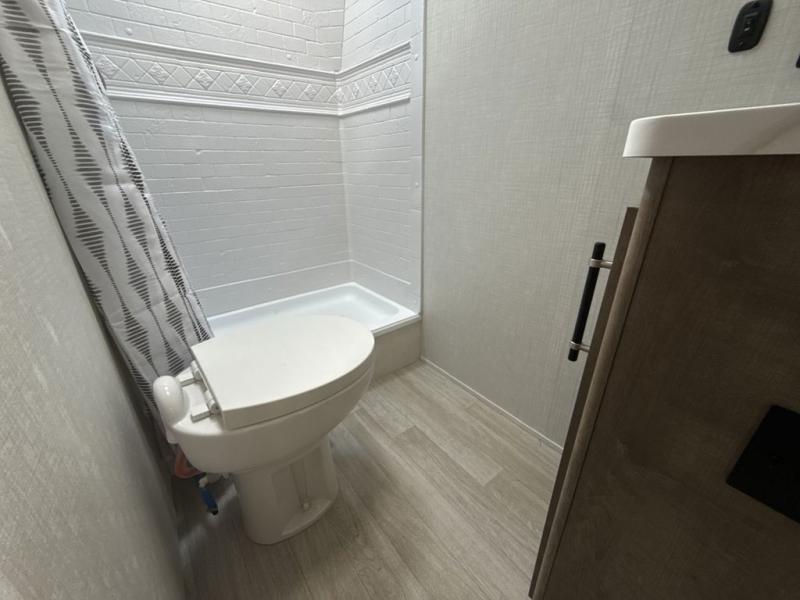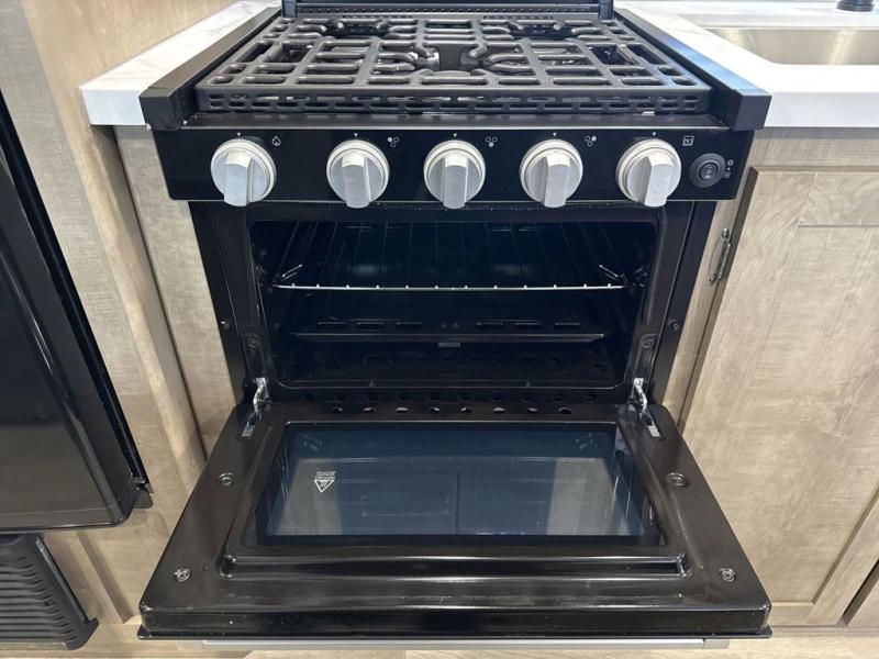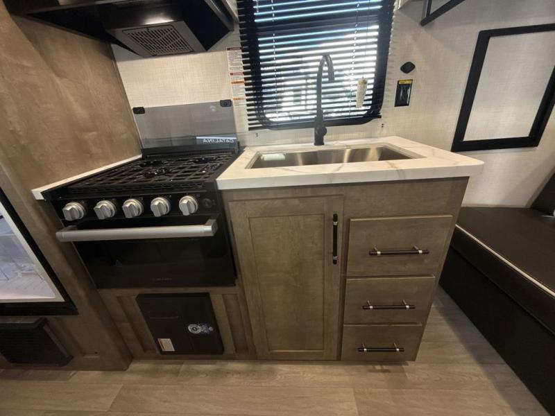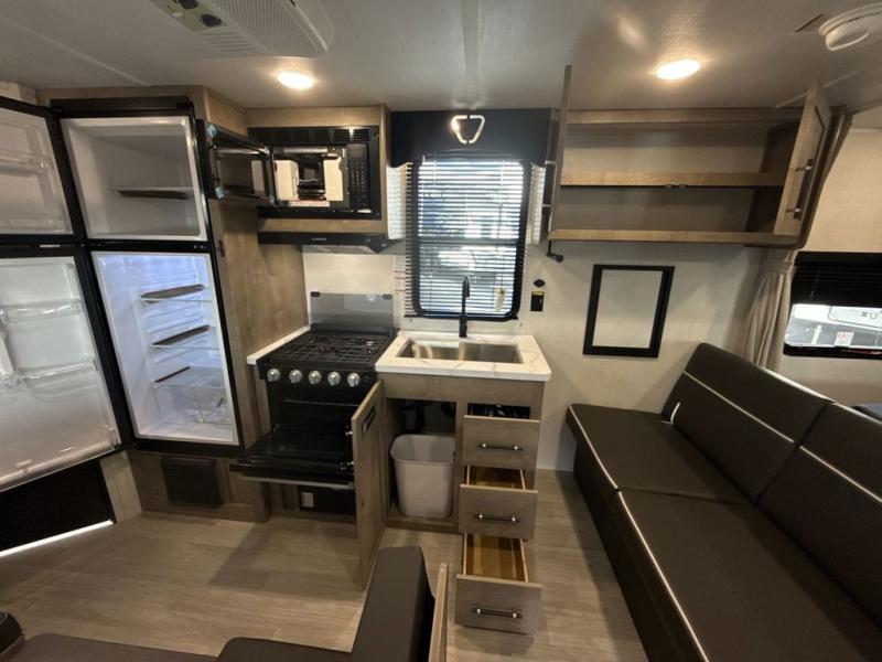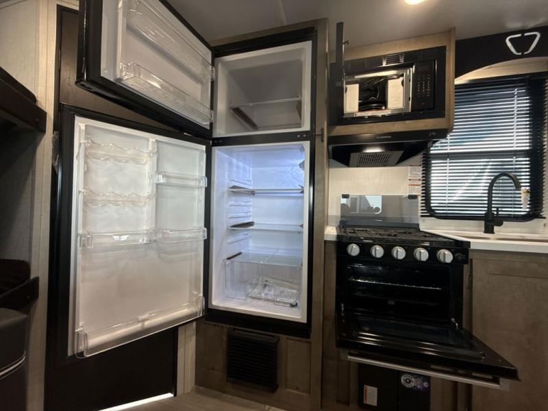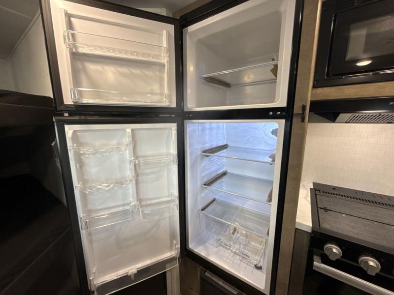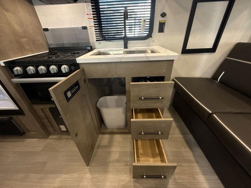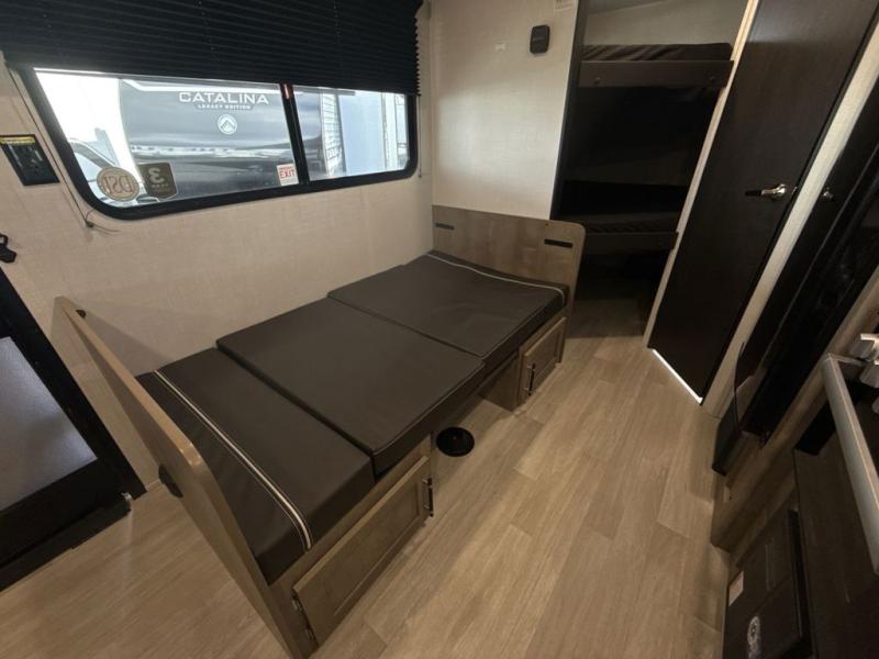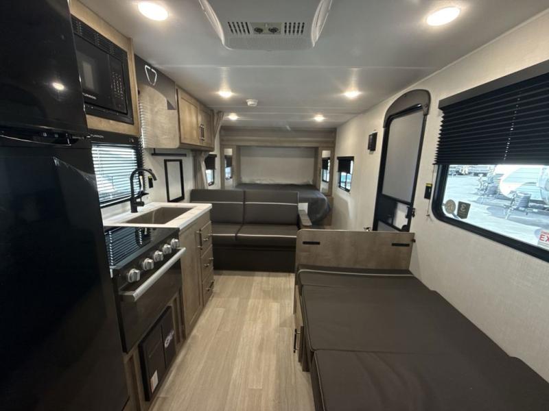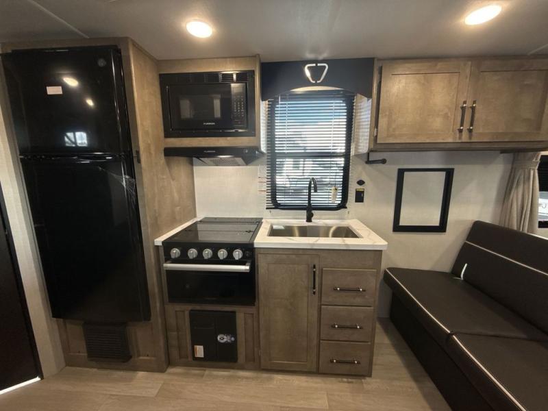 This cute Springdale Mini bunk model will easily sleep seven with the double-size bunks, booth dinette, and queen Murphy bed which features a fold-down sofa at the end. During the daytime, you can have the seating you need and want, and at night the sofa folds to become part of the front bed. The rear corner bath is convenient and features a tub, toilet, and sink. The kitchen is fully equipped to allow you to cook as you travel, and you can enjoy meals while under the 15' power awning.