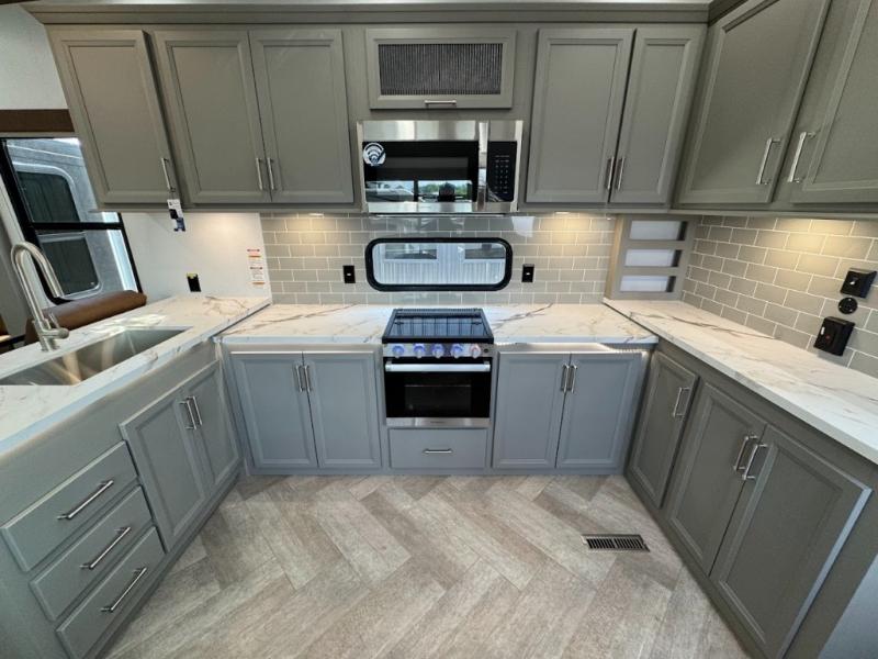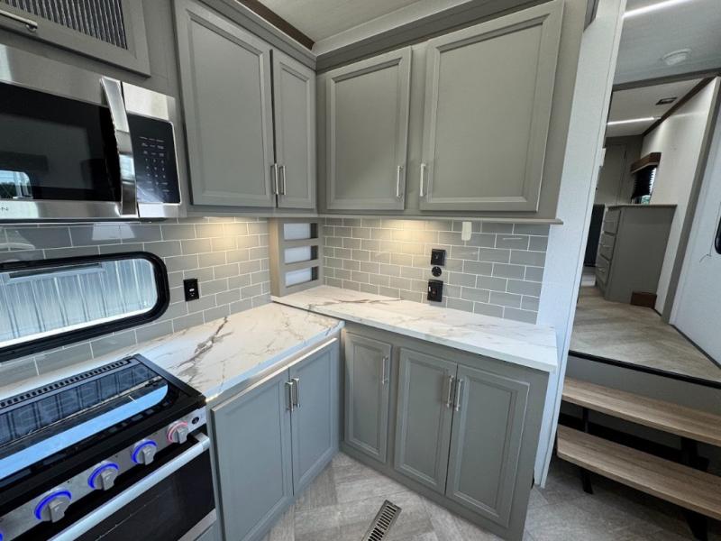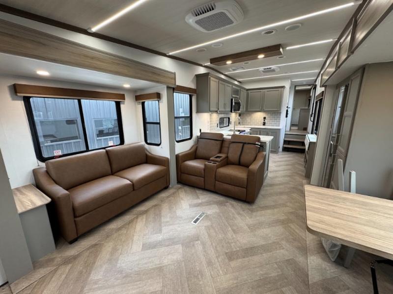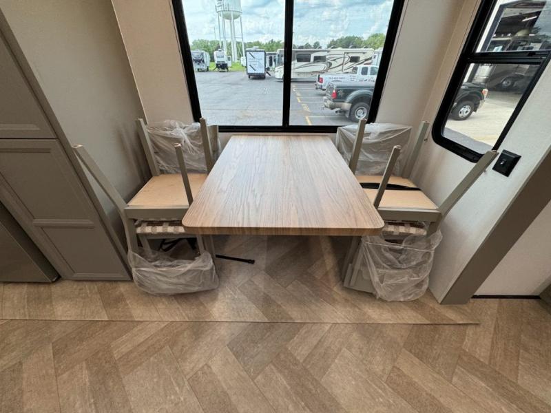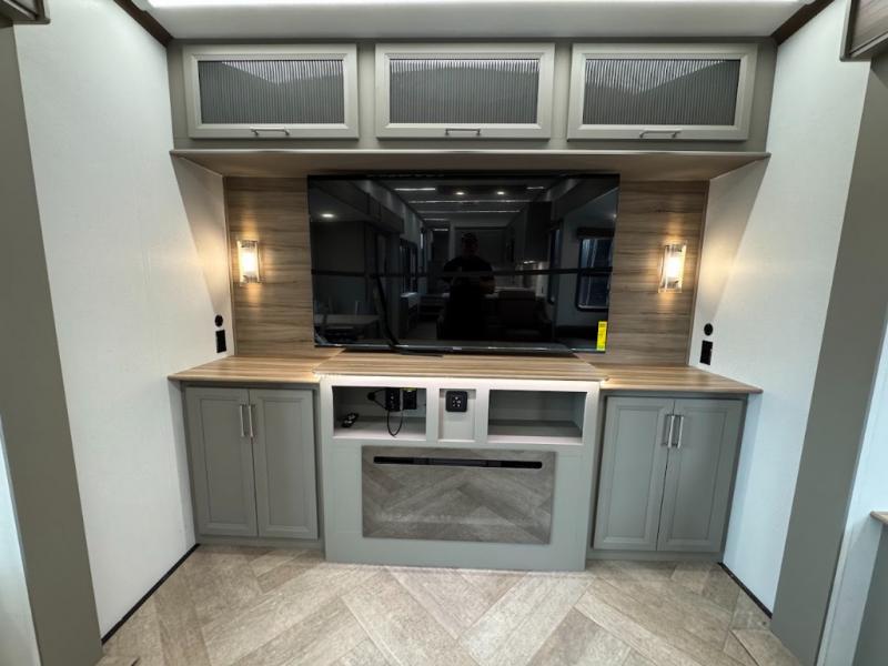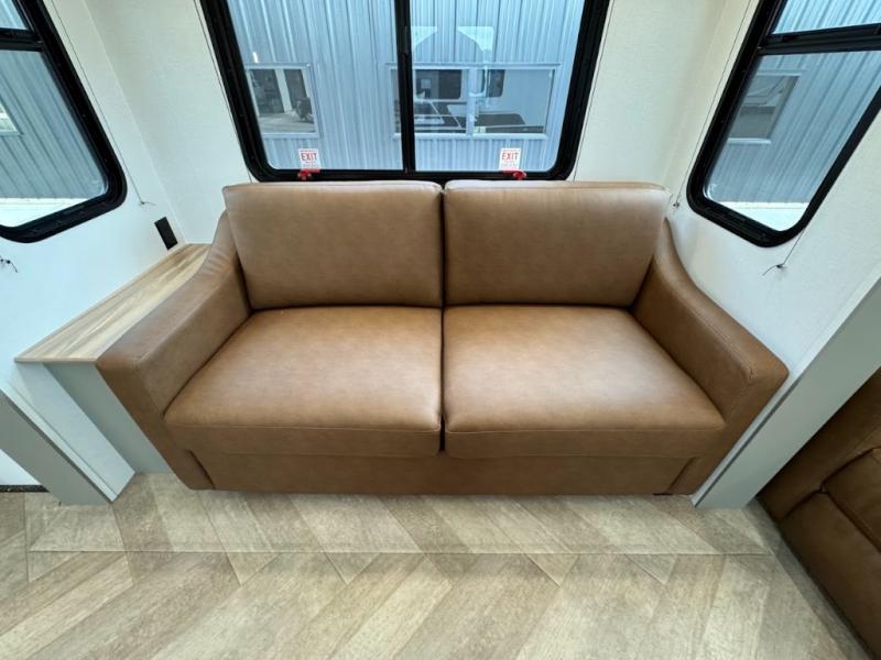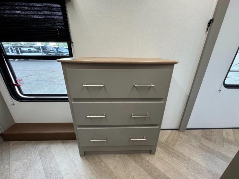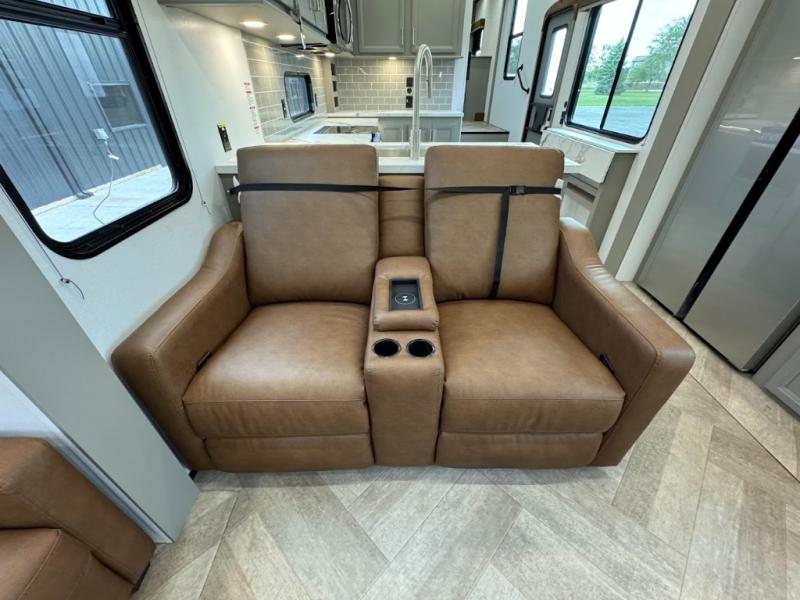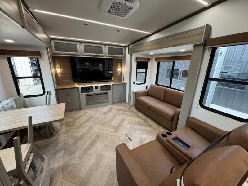 This fifth wheel with a rear den/living room is sure to be a big hit! You can relax on the full reclining theater seating, dine at the free-standing dinette with two chairs, and let guests sleep over on the queen-size tri-fold sofa. There is also a fireplace/heater and an HDTV for movie nights. The middle kitchen includes U-shaped counter space, a 30" stainless steel microwave, and flip-up storage to keep your space tidy. A front private bedroom with a king bed slide out will have you feeling right at home, and there is plenty of storage under the bed, in the wardrobe and dresser, and in the closet with stackable washer and dryer prep.