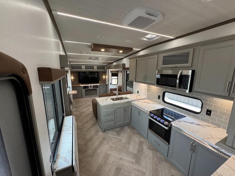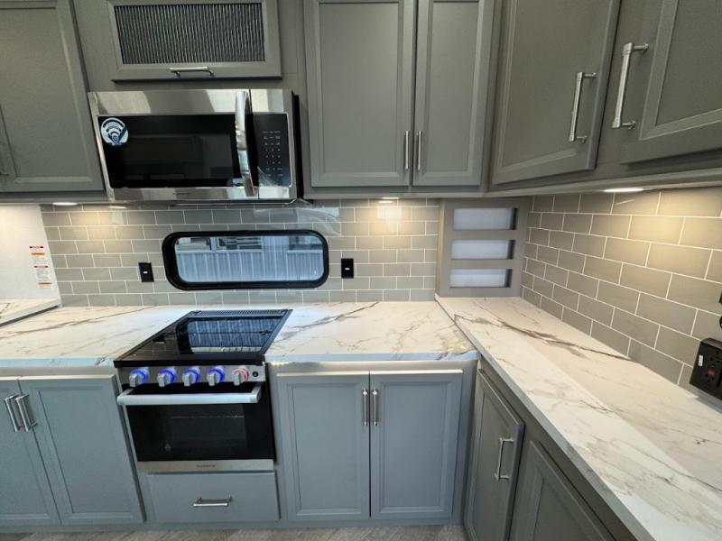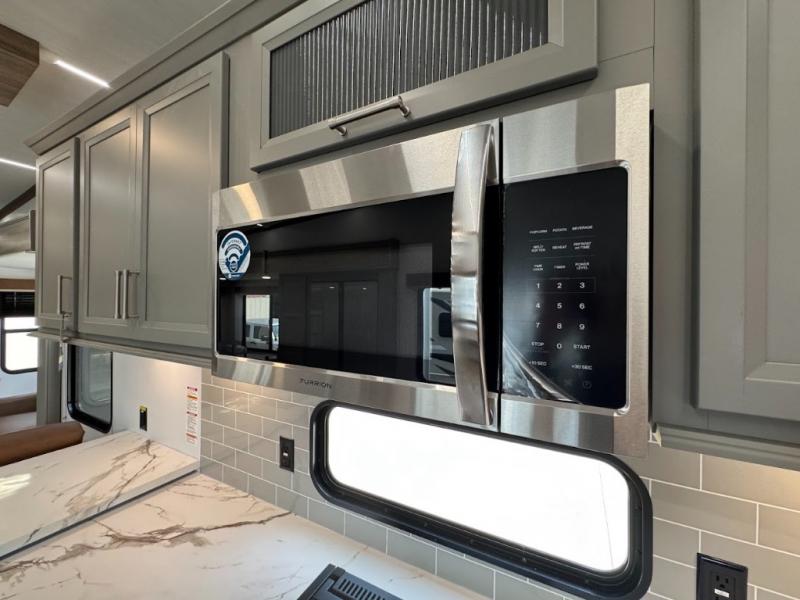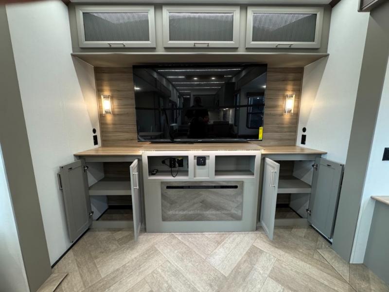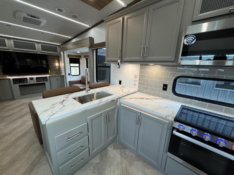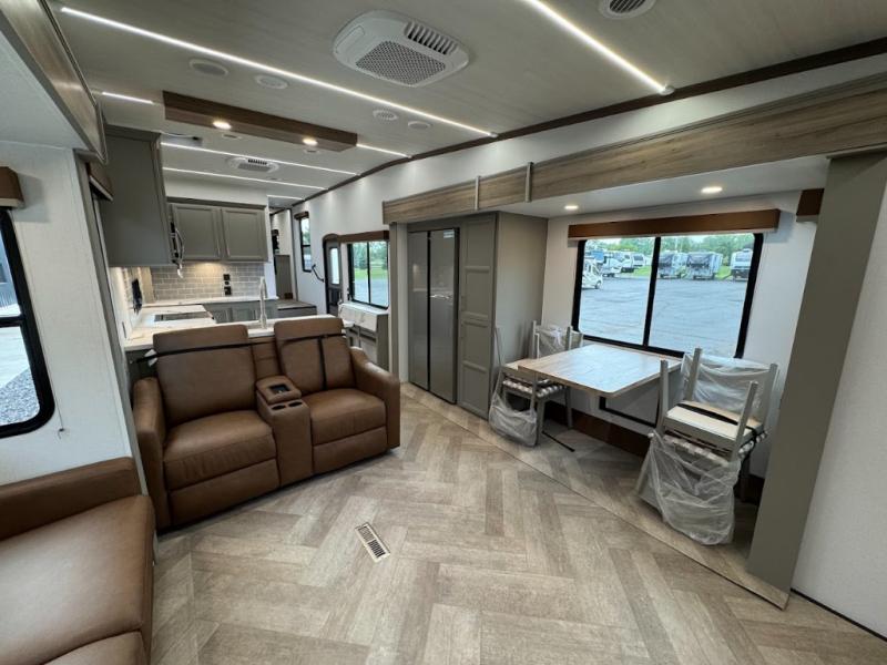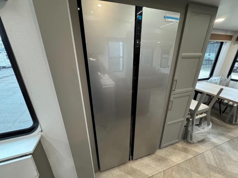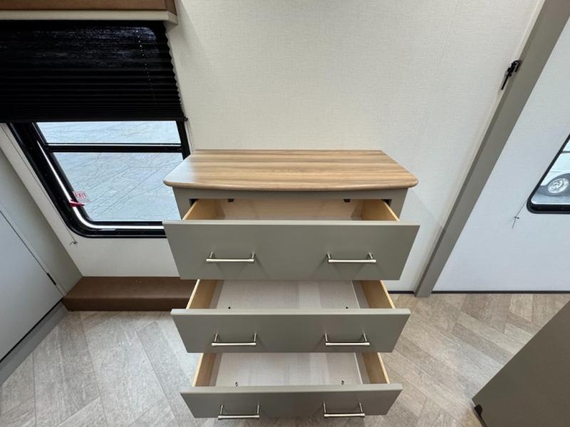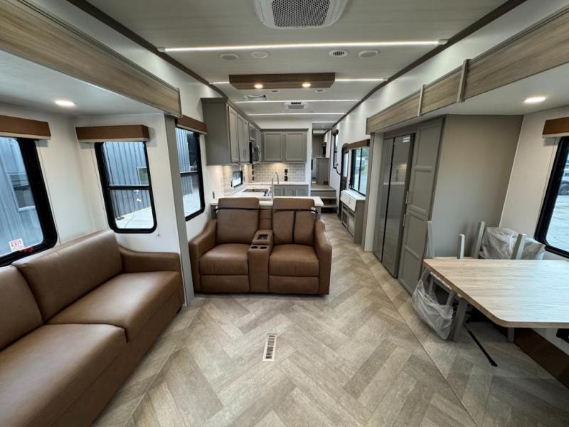 This fifth wheel with a rear den/living room is sure to be a big hit! You can relax on the full reclining theater seating, dine at the free-standing dinette with two chairs, and let guests sleep over on the queen-size tri-fold sofa. There is also a fireplace/heater and an HDTV for movie nights. The middle kitchen includes U-shaped counter space, a 30" stainless steel microwave, and flip-up storage to keep your space tidy. A front private bedroom with a king bed slide out will have you feeling right at home, and there is plenty of storage under the bed, in the wardrobe and dresser, and in the closet with stackable washer and dryer prep.