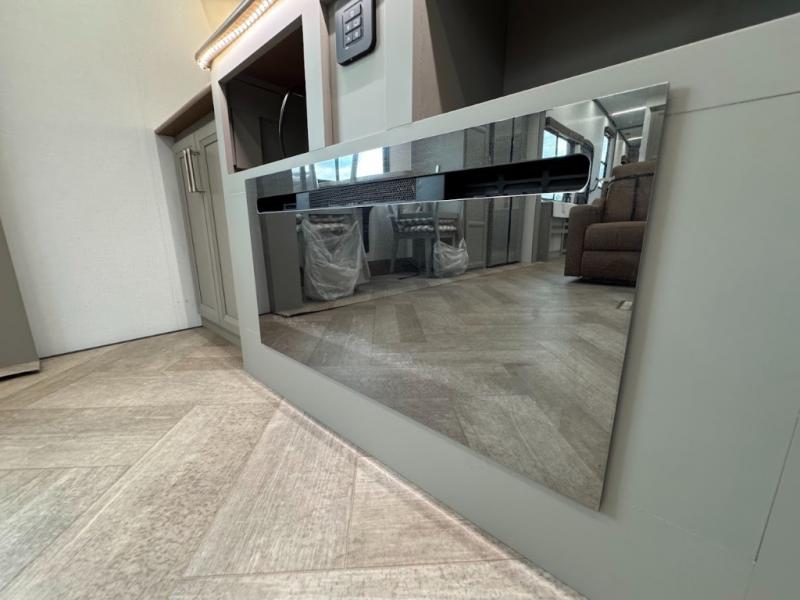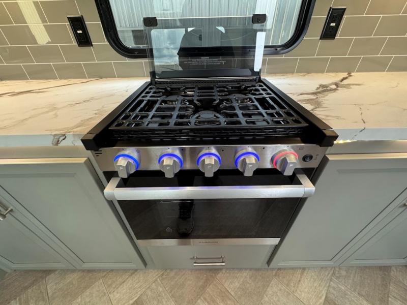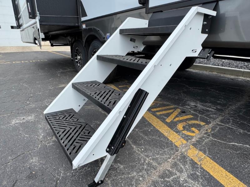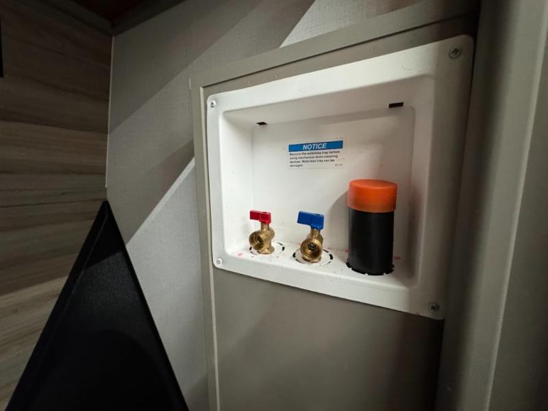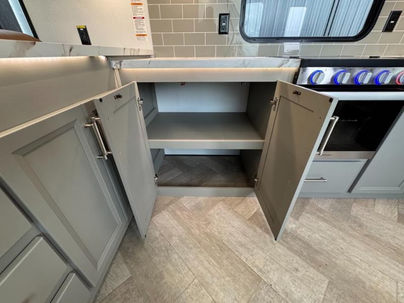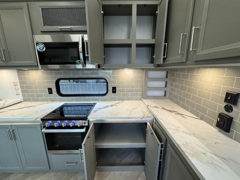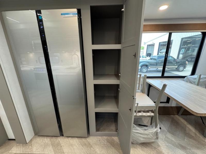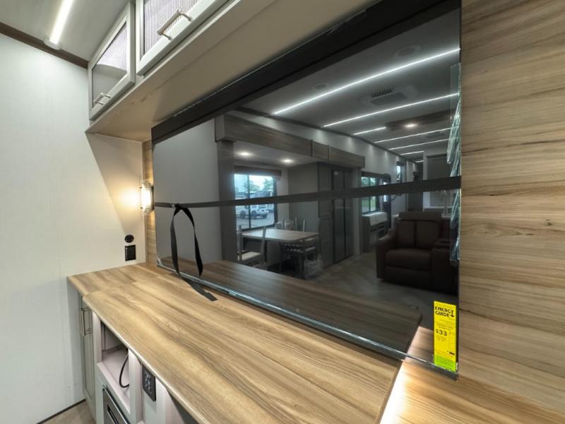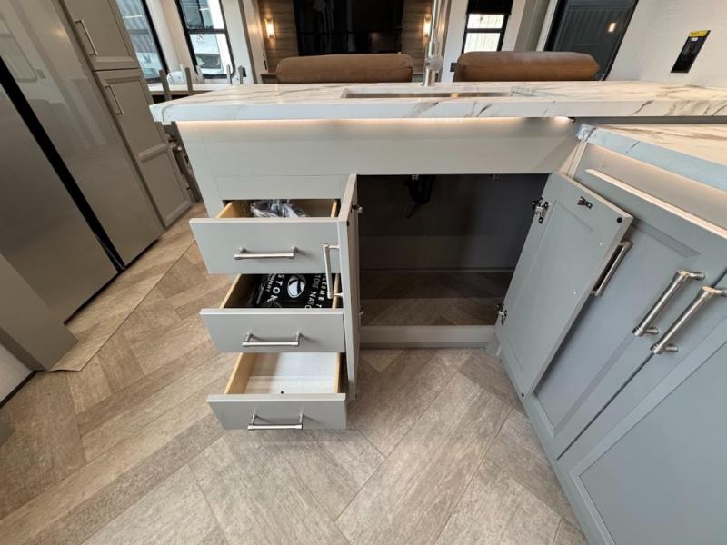 This fifth wheel with a rear den/living room is sure to be a big hit! You can relax on the full reclining theater seating, dine at the free-standing dinette with two chairs, and let guests sleep over on the queen-size tri-fold sofa. There is also a fireplace/heater and an HDTV for movie nights. The middle kitchen includes U-shaped counter space, a 30" stainless steel microwave, and flip-up storage to keep your space tidy. A front private bedroom with a king bed slide out will have you feeling right at home, and there is plenty of storage under the bed, in the wardrobe and dresser, and in the closet with stackable washer and dryer prep.