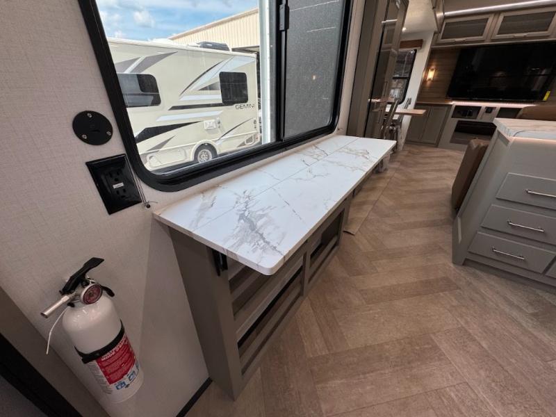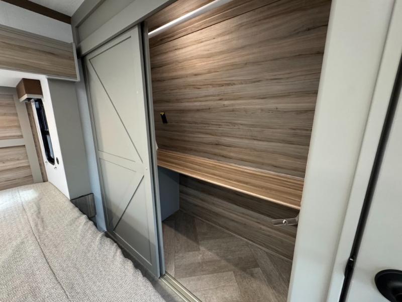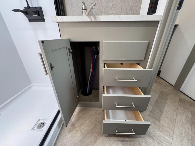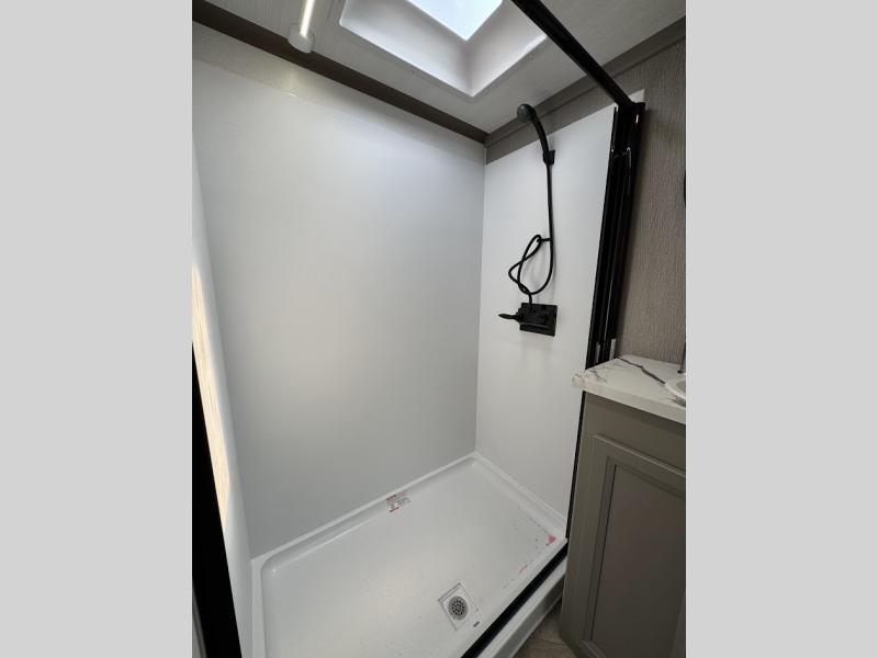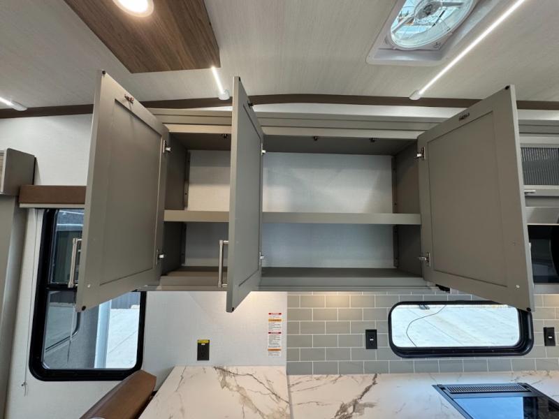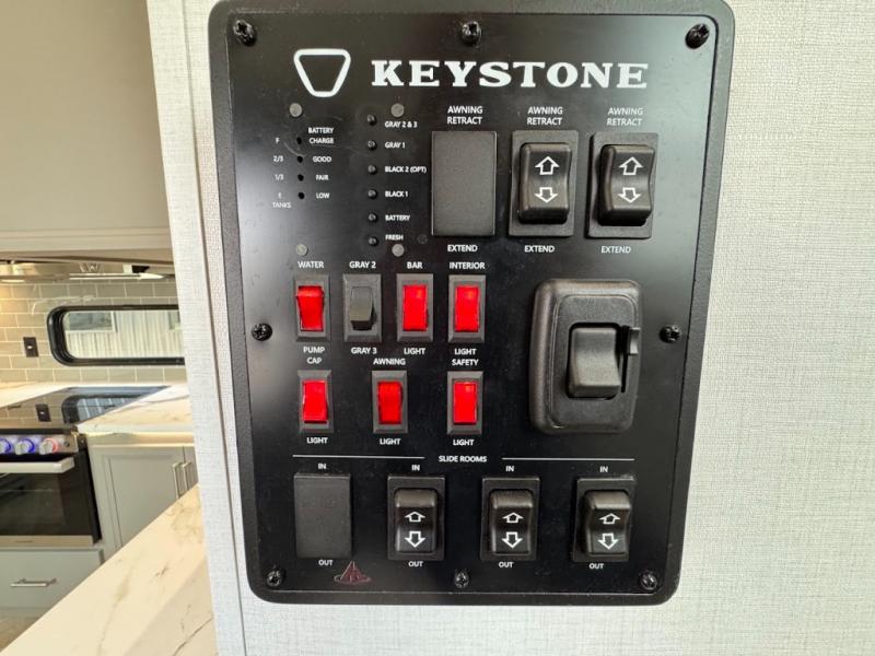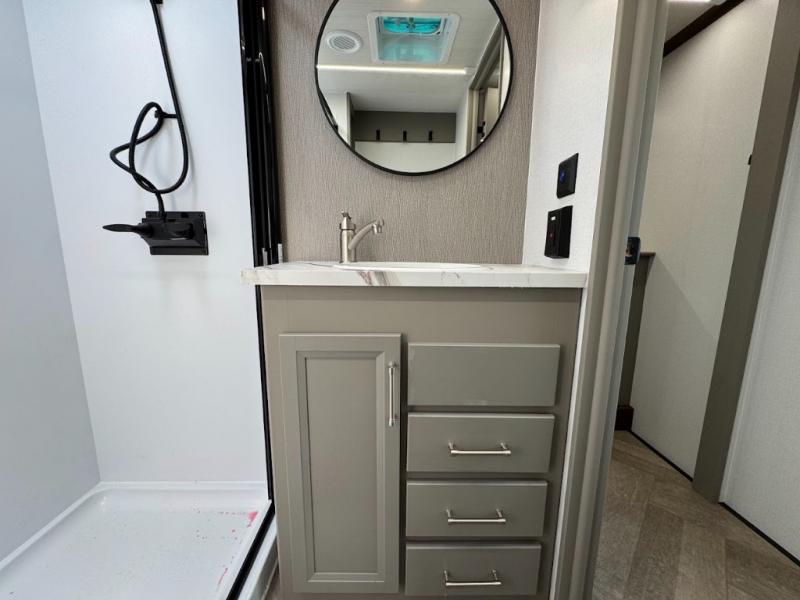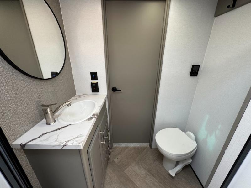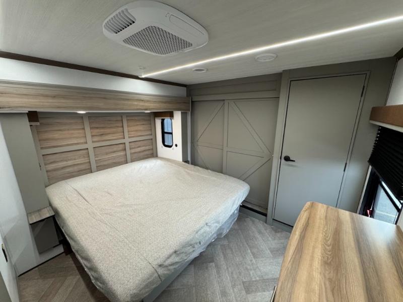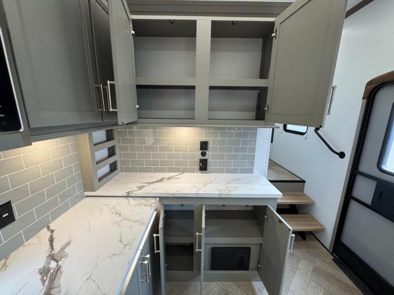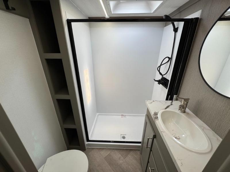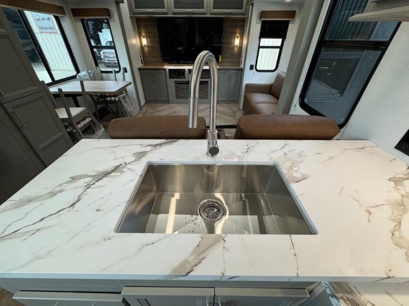 The Sprinter fifth wheels by Keystone feature spacious living areas, plenty of storage, and outstanding towability. Each unit is constructed with 2" aluminum framed and laminated sidewalls, a fully walkable roof, and dual layer insulation to help extend your camping season. The heated pass-through storage includes lockable slam latch baggage doors so you can easily pack your gear, and the one-touch 4-point leveling system features return hookup memory to have you set up in no-time. Head inside to find Congoleum vinyl flooring, Thomas Payne luxury collection furniture, residential style seamless marbled countertops, and an upgraded bedspread to name a few comforts. The Sprinter also includes a Girard tankless on-demand water heater, a central command center, plus a 30k BTU furnace and two A/C units to ensure your comfort!