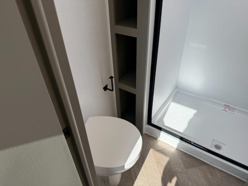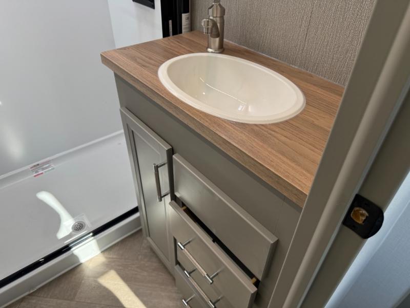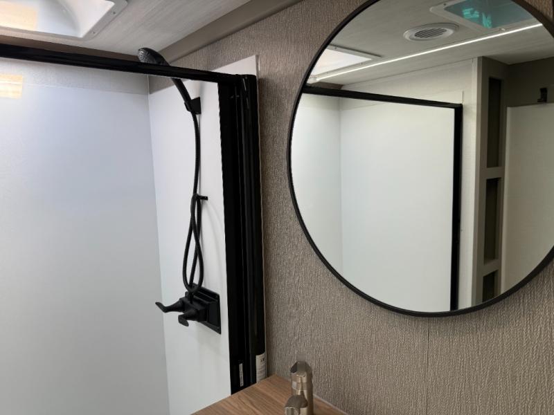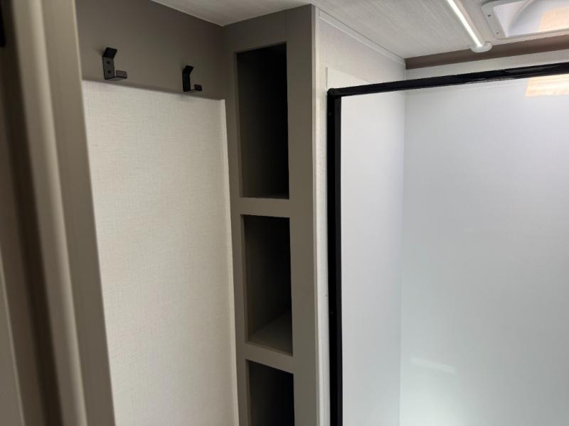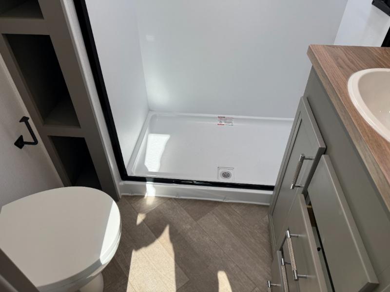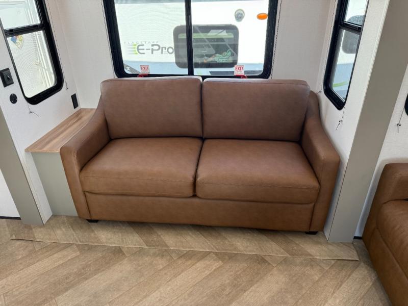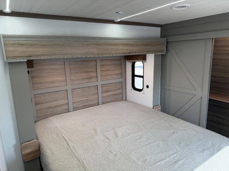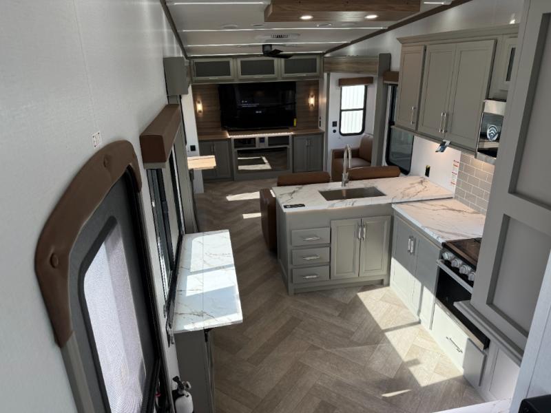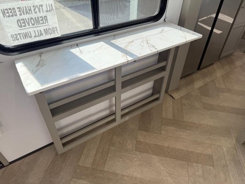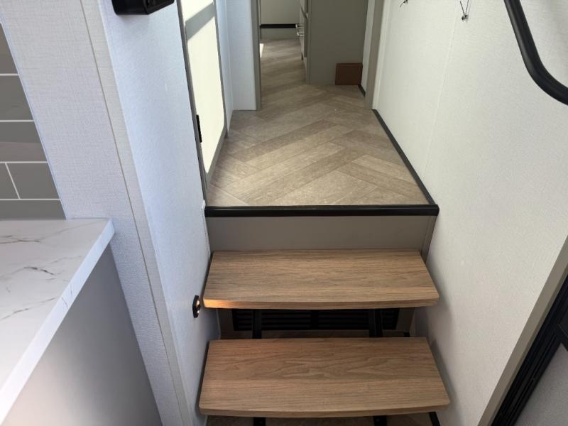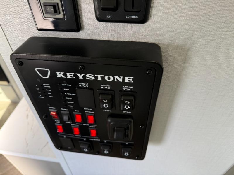 The Sprinter fifth wheels by Keystone feature spacious living areas, plenty of storage, and outstanding towability. Each unit is constructed with 2" aluminum framed and laminated sidewalls, a fully walkable roof, and dual layer insulation to help extend your camping season. The heated pass-through storage includes lockable slam latch baggage doors so you can easily pack your gear, and the one-touch 4-point leveling system features return hookup memory to have you set up in no-time. Head inside to find Congoleum vinyl flooring, Thomas Payne luxury collection furniture, residential style seamless marbled countertops, and an upgraded bedspread to name a few comforts. The Sprinter also includes a Girard tankless on-demand water heater, a central command center, plus a 30k BTU furnace and two A/C units to ensure your comfort!