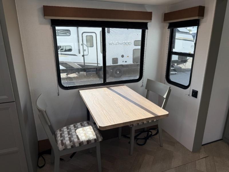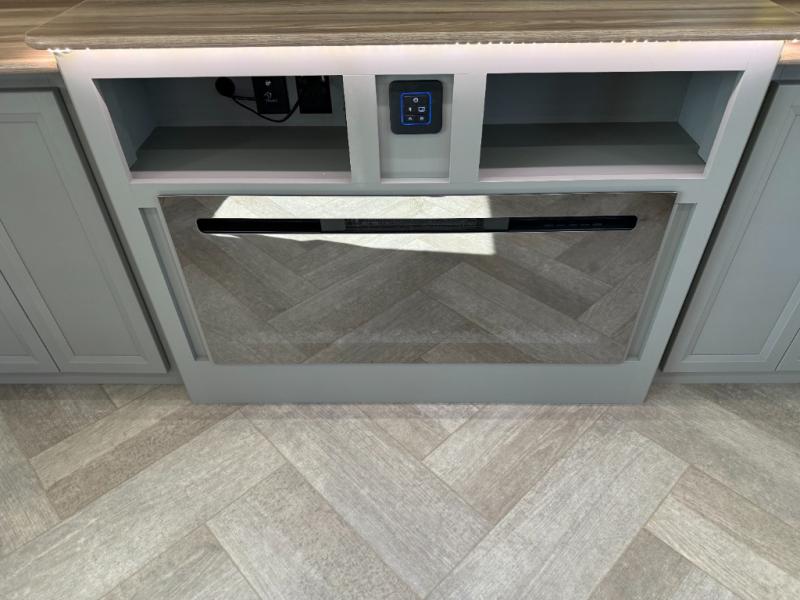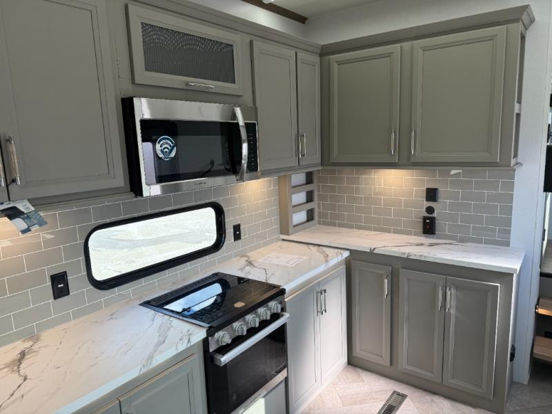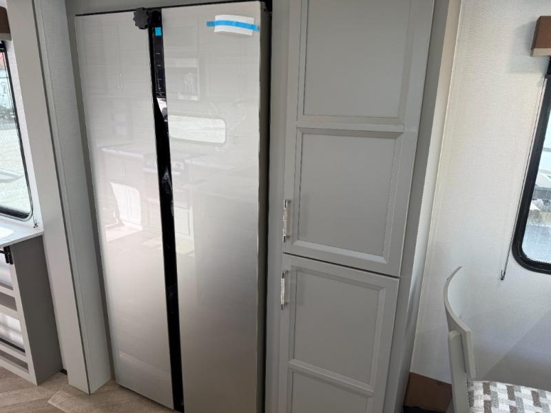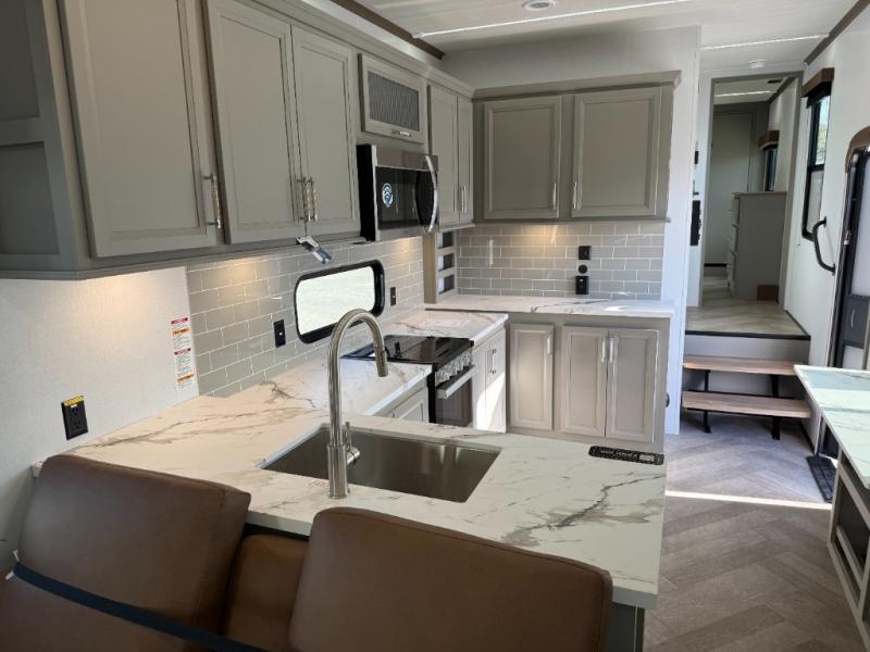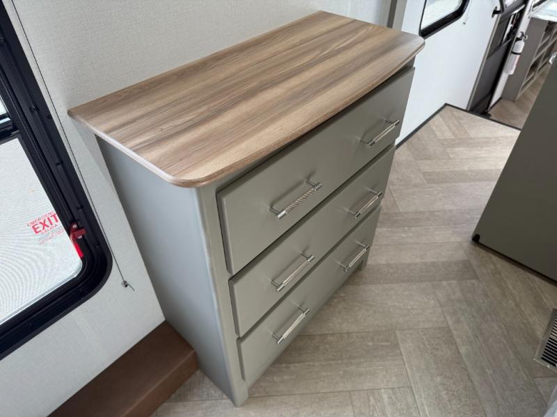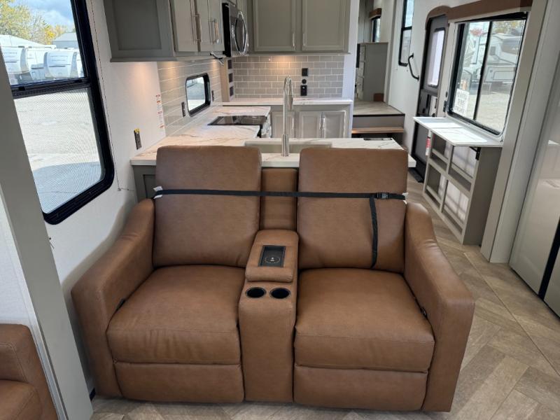 This fifth wheel with a rear den/living room is sure to be a big hit! You can relax on the full reclining theater seating, dine at the free-standing dinette with two chairs, and let guests sleep over on the queen-size tri-fold sofa. There is also a fireplace/heater and an HDTV for movie nights. The middle kitchen includes U-shaped counter space, a 30" stainless steel microwave, and flip-up storage to keep your space tidy. A front private bedroom with a king bed slide out will have you feeling right at home, and there is plenty of storage under the bed, in the wardrobe and dresser, and in the closet with stackable washer and dryer prep.