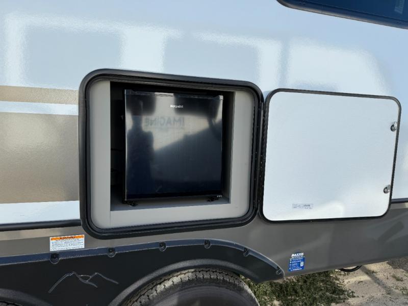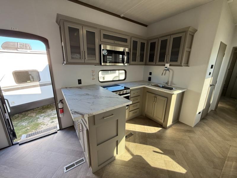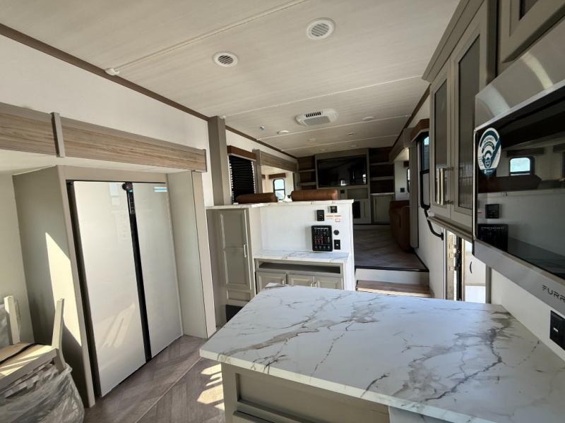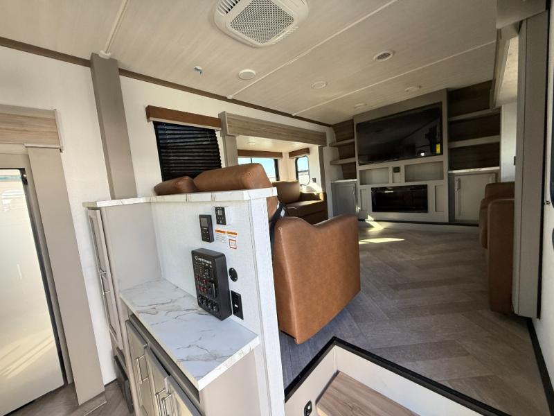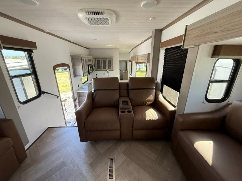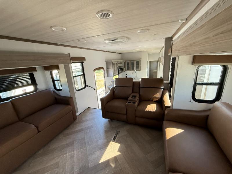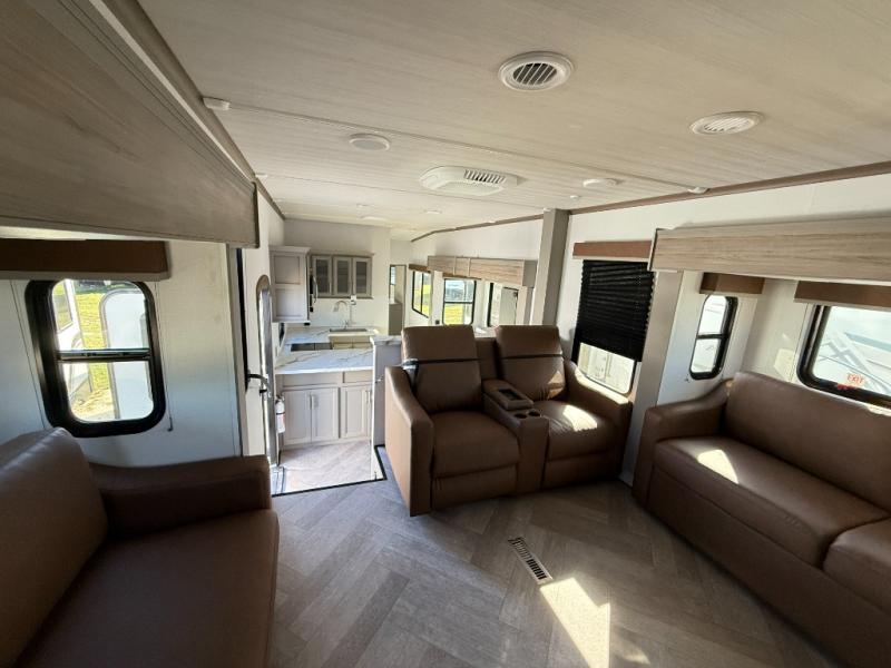 This Sprinter fifth wheel is yours for the taking! You can enter through an XL 30" friction-hinge entry door to find a great kitchen decked out with a range with a glass top, a 30" microwave, a breakfast bar, a 16 cu. ft. refrigerator, a pantry, and a coffee bar. After you whip up dinner and a fabulous dessert, you can enjoy them at the wall-mounted dinette with four chairs. The separate living room has a residential feel with its fireplace, 50" LED HDTV, two queen-size tri-fold sofas, and full-reclining theater seating with massage, lights, and USB. If you find yourself tired out from the day's travels, you can head straight to the rear private bedroom to fall asleep on the king-size bed after taking a hot shower in the residential shower.