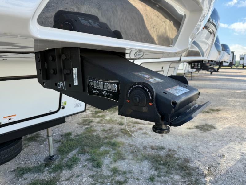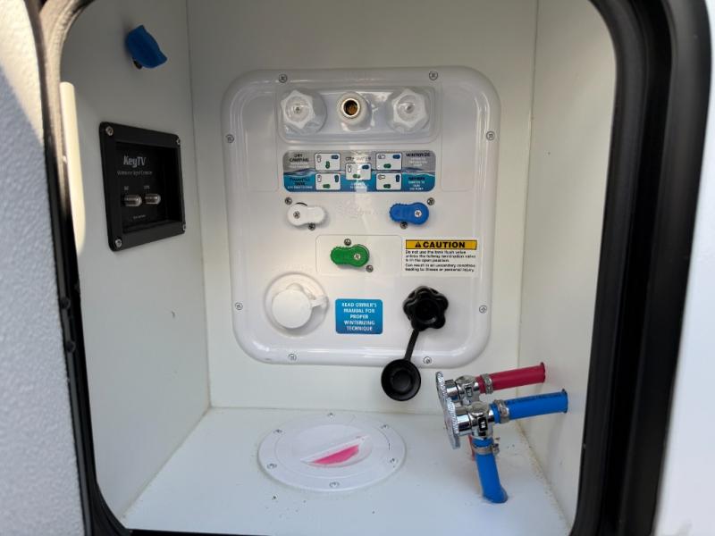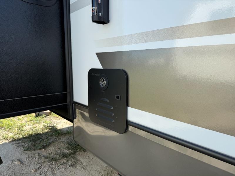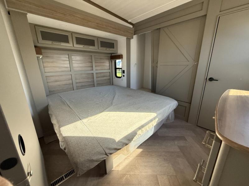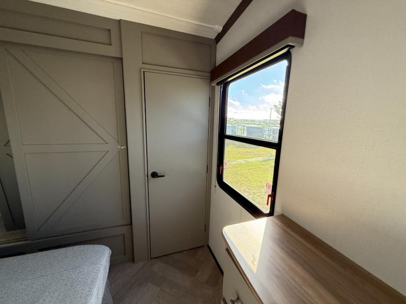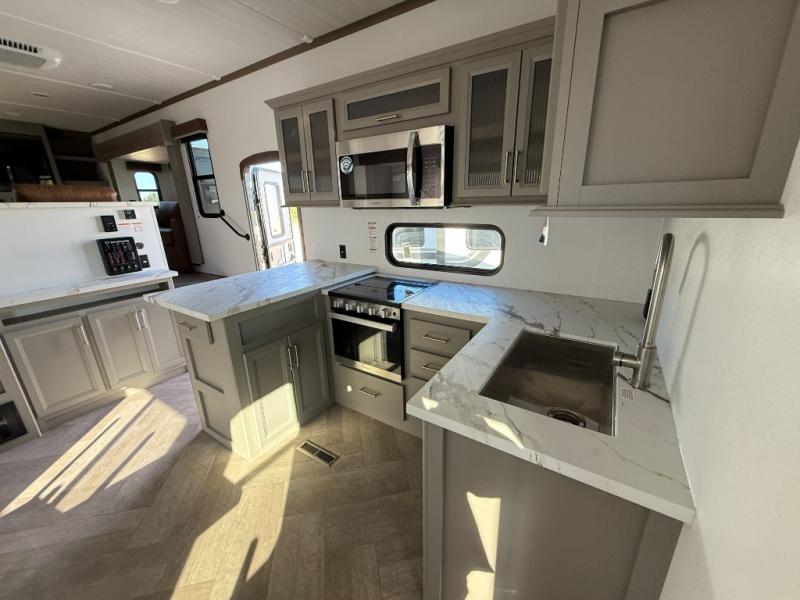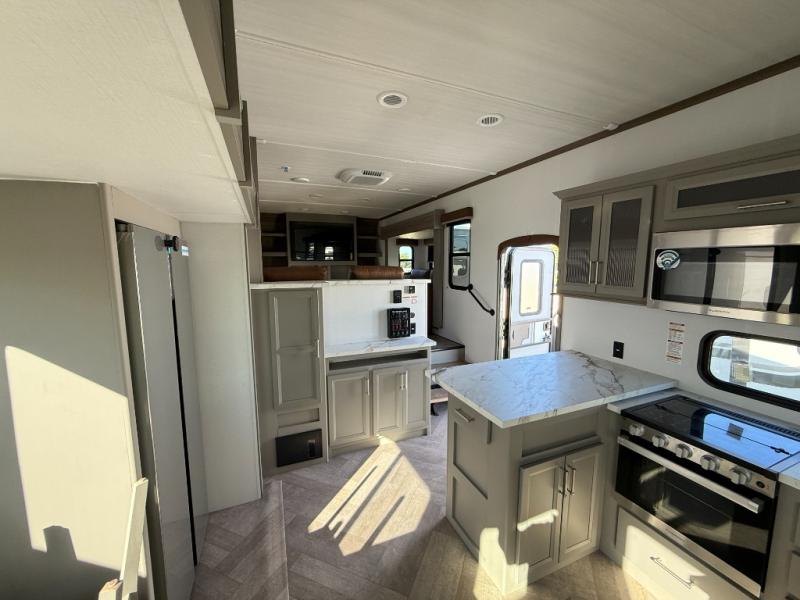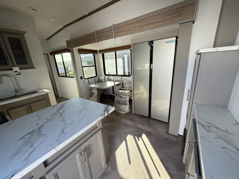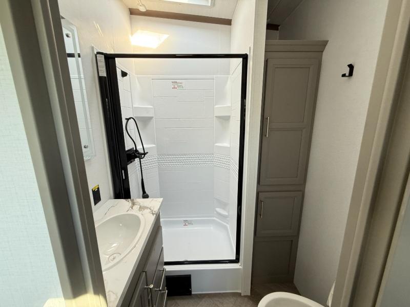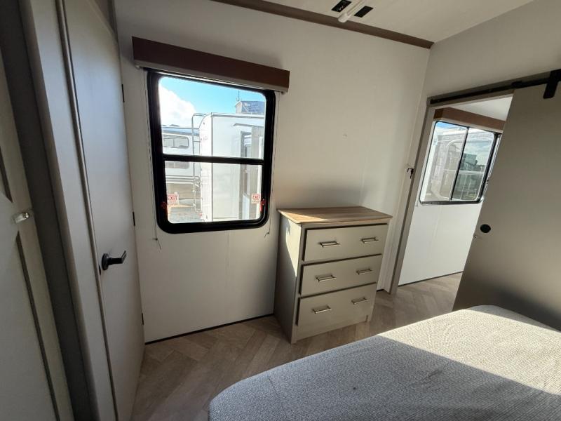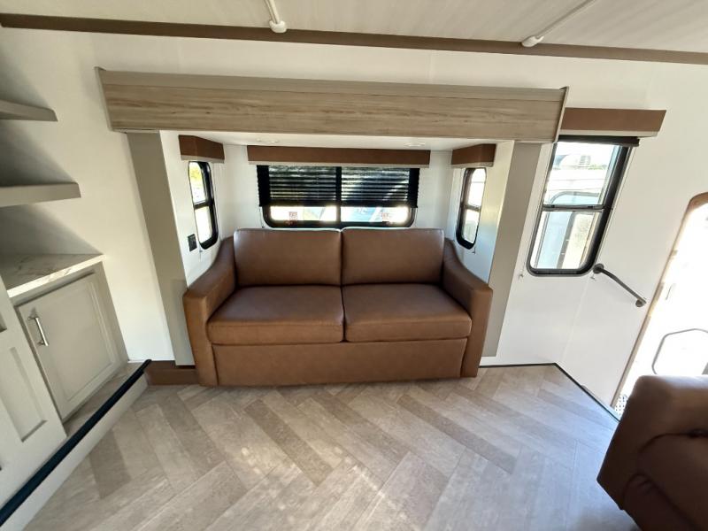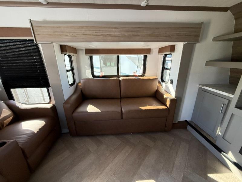 The Sprinter fifth wheels by Keystone feature spacious living areas, plenty of storage, and outstanding towability. Each unit is constructed with 2" aluminum framed and laminated sidewalls, a fully walkable roof, and dual layer insulation to help extend your camping season. The heated pass-through storage includes lockable slam latch baggage doors so you can easily pack your gear, and the one-touch 4-point leveling system features return hookup memory to have you set up in no-time. Head inside to find Congoleum vinyl flooring, Thomas Payne luxury collection furniture, residential style seamless marbled countertops, and an upgraded bedspread to name a few comforts. The Sprinter also includes a Girard tankless on-demand water heater, a central command center, plus a 30k BTU furnace and two A/C units to ensure your comfort!