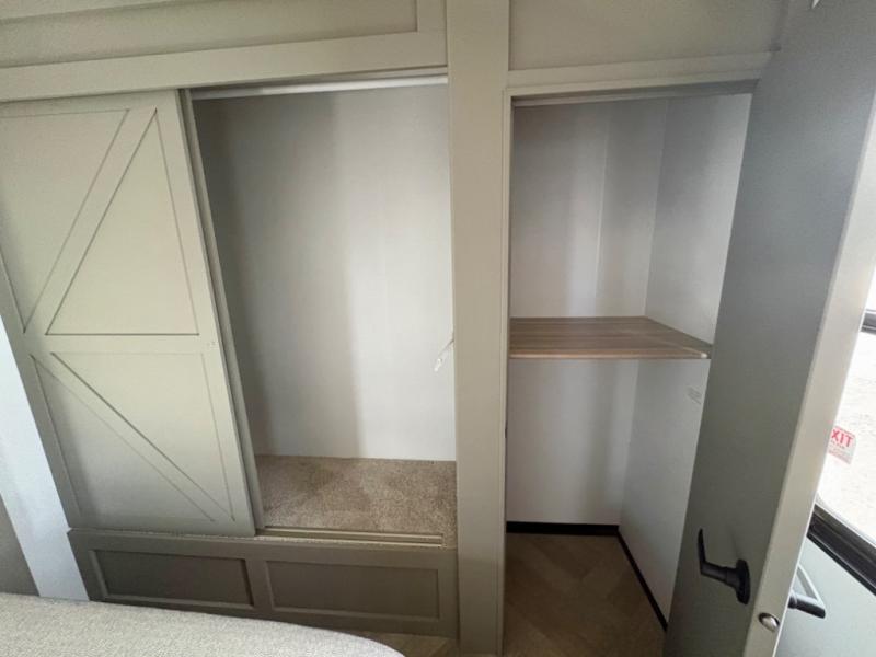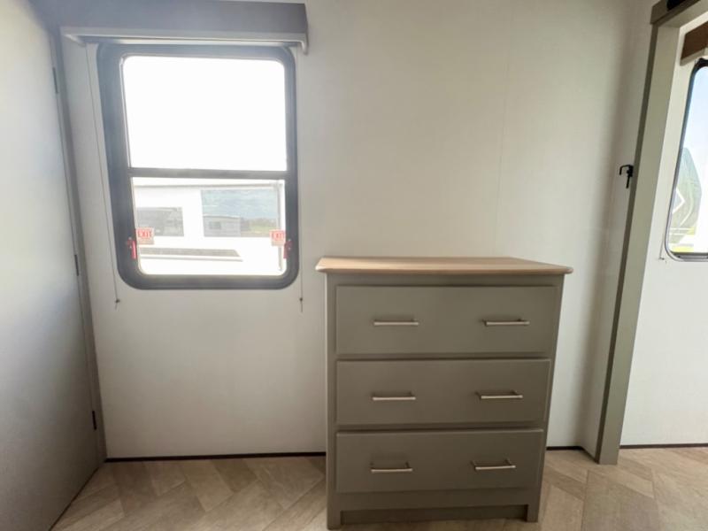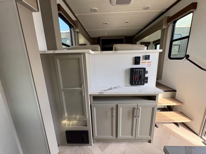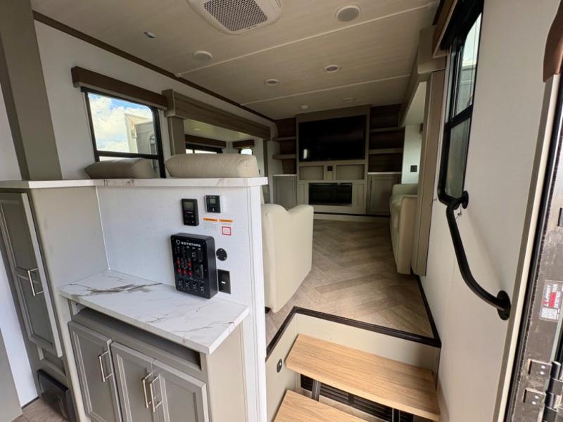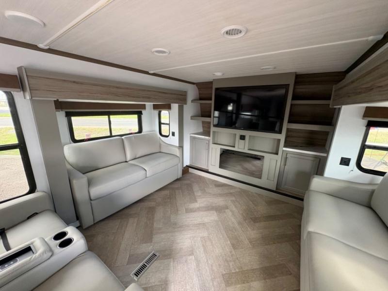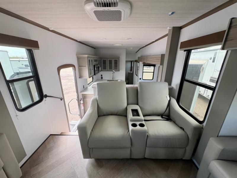 This Sprinter fifth wheel is yours for the taking! You can enter through an XL 30" friction-hinge entry door to find a great kitchen decked out with a range with a glass top, a 30" microwave, a breakfast bar, a 16 cu. ft. refrigerator, a pantry, and a coffee bar. After you whip up dinner and a fabulous dessert, you can enjoy them at the wall-mounted dinette with four chairs. The separate living room has a residential feel with its fireplace, 50" LED HDTV, two queen-size tri-fold sofas, and full-reclining theater seating with massage, lights, and USB. If you find yourself tired out from the day's travels, you can head straight to the rear private bedroom to fall asleep on the 70" x 80" king-size bed after taking a hot shower in the residential shower and change into some comfortable pijamas from the wadrobe and dresser in the bedroom.