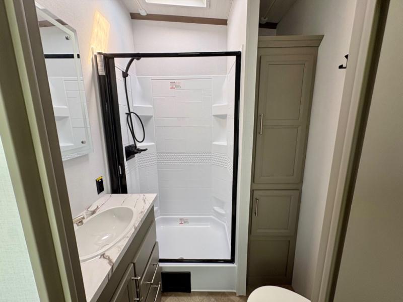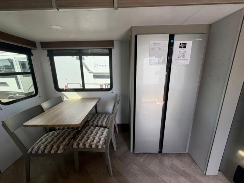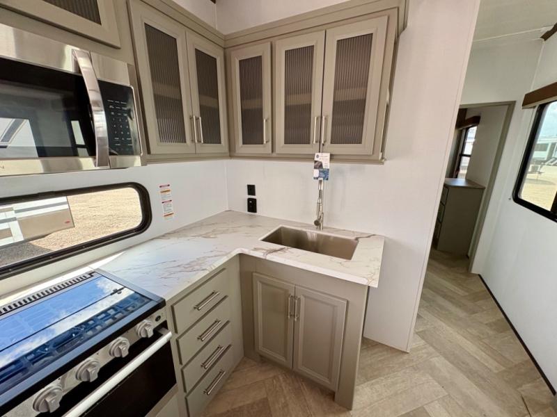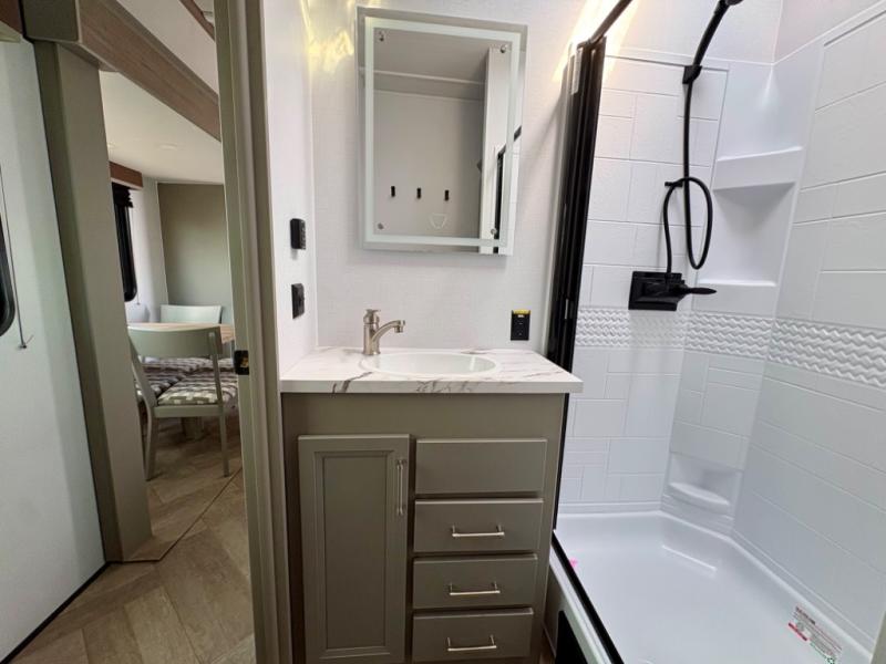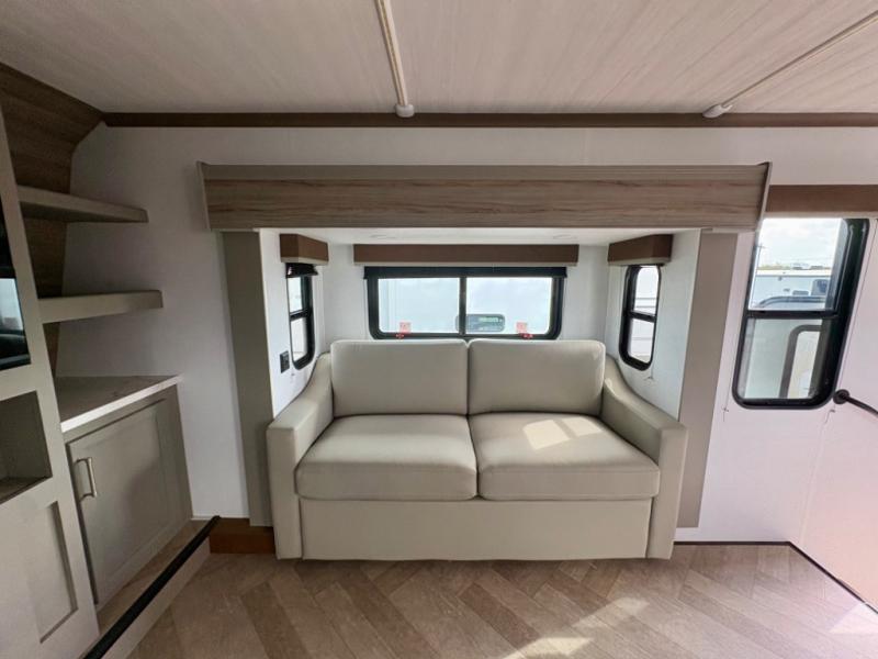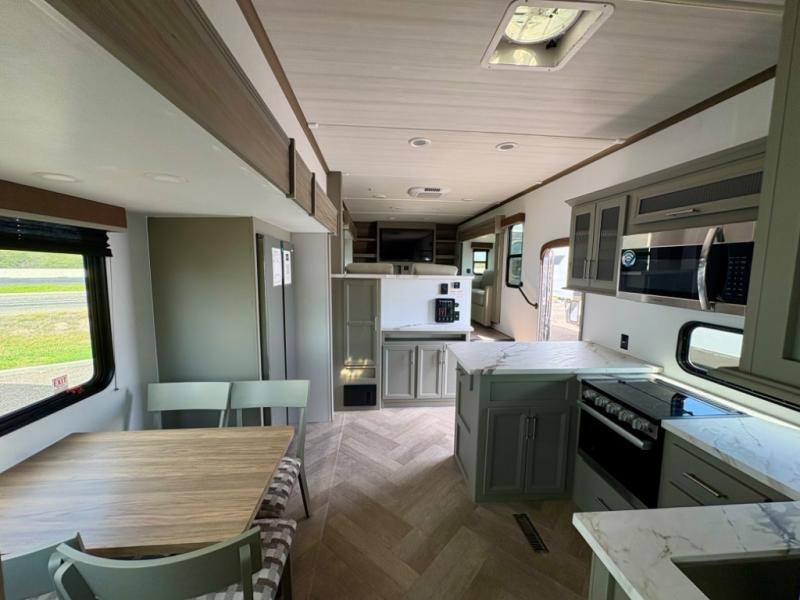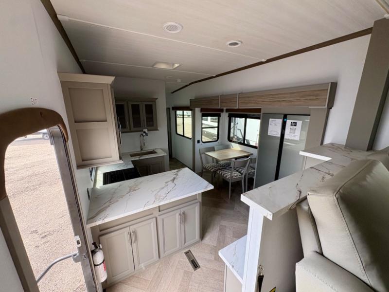 The Sprinter fifth wheels by Keystone feature spacious living areas, plenty of storage, and outstanding towability. Each unit is constructed with 2" thick double welded aluminum frame construction, a fully walkable roof and slide out roof, and dual layer insulation to help extend your camping season. The heated pass-through storage includes lockable slam latch baggage doors so you can easily pack your gear, and the one-touch 4-point leveling system features return hookup memory to have you set up in no-time. Head inside to find DynaSpan Marine Grade floor decking, Thomas Payne luxury collection furniture and residential style seamless marbled countertops to name a few comforts. The Sprinter also includes a Suburban tankless on-demand water heater, black out aluminum wheels, plus a 30k BTU furnace to ensure your comfort!