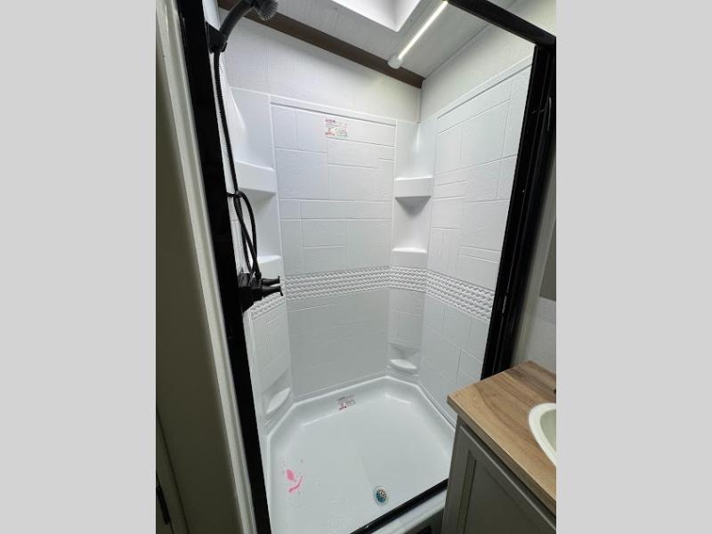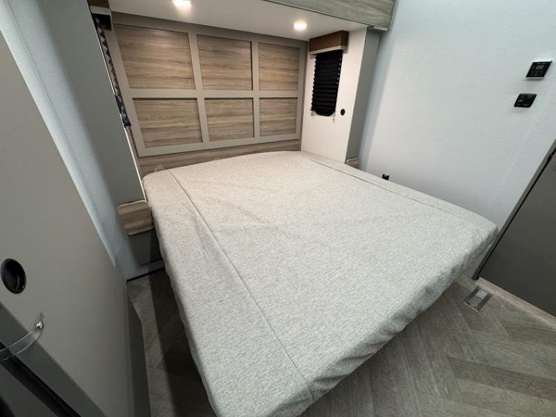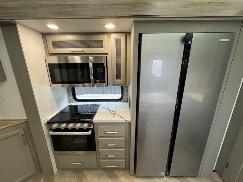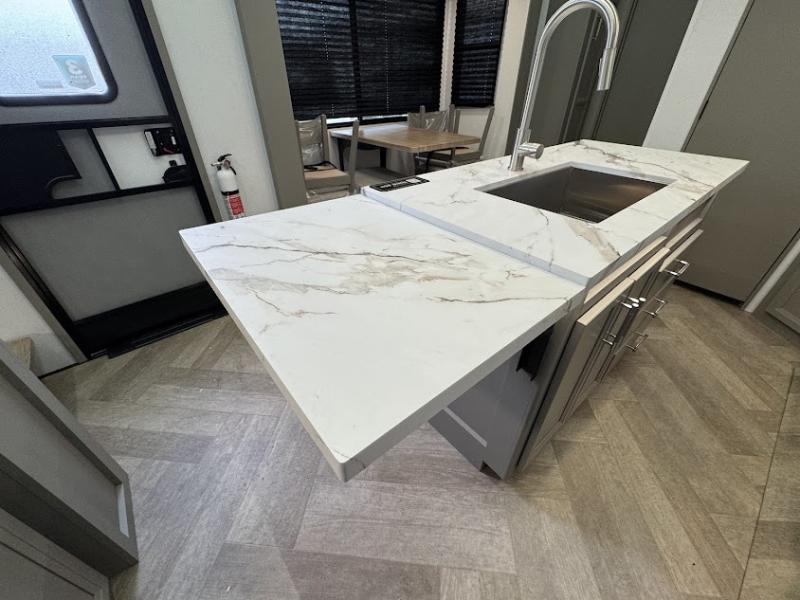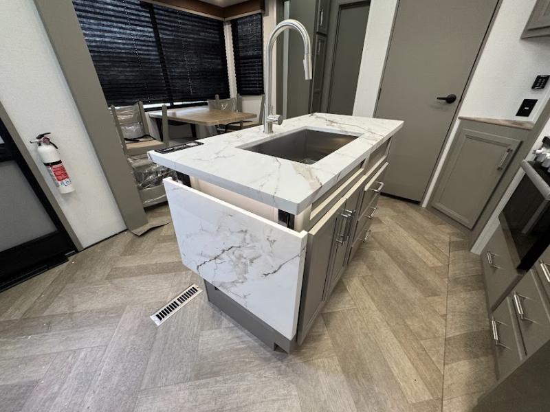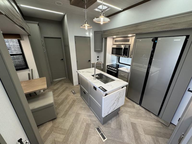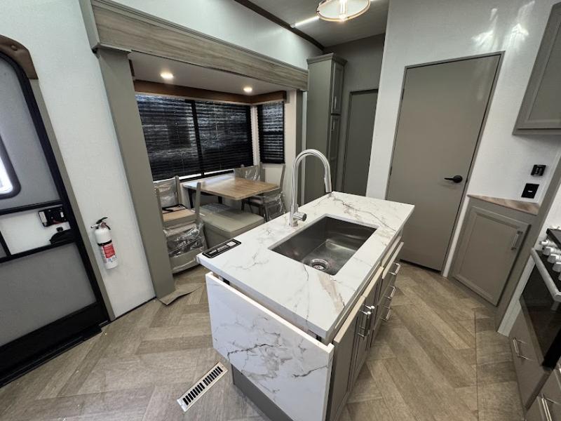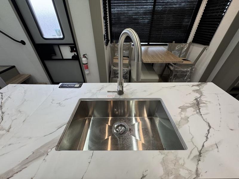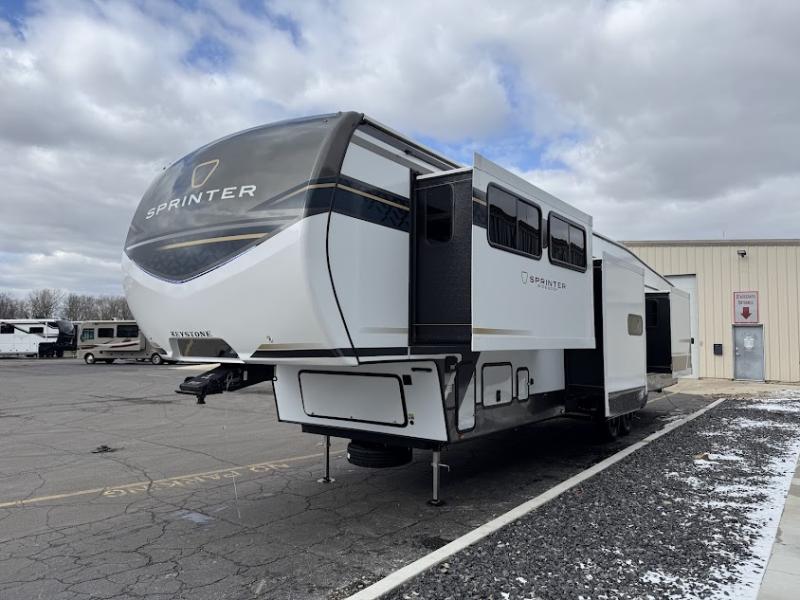 The Sprinter fifth wheels by Keystone feature spacious living areas, plenty of storage, and outstanding towability. Each unit is constructed with 2" thick double welded aluminum frame construction, a fully walkable roof and slide out roof, and dual layer insulation to help extend your camping season. The heated pass-through storage includes lockable slam latch baggage doors so you can easily pack your gear, and the one-touch 4-point leveling system features return hookup memory to have you set up in no-time. Head inside to find DynaSpan Marine Grade floor decking, Thomas Payne luxury collection furniture and residential style seamless marbled countertops to name a few comforts. The Sprinter also includes a Suburban tankless on-demand water heater, black out aluminum wheels, plus a 30k BTU furnace to ensure your comfort!