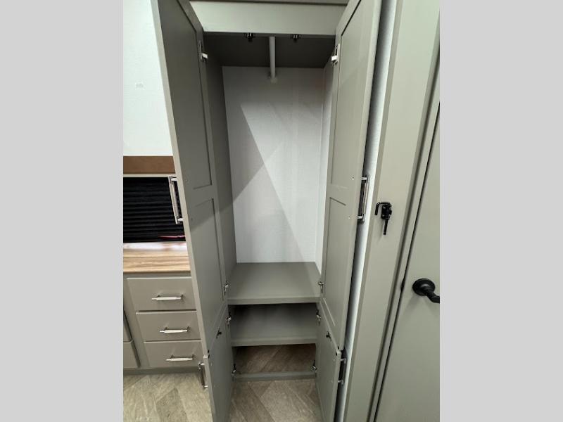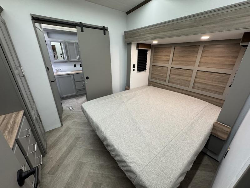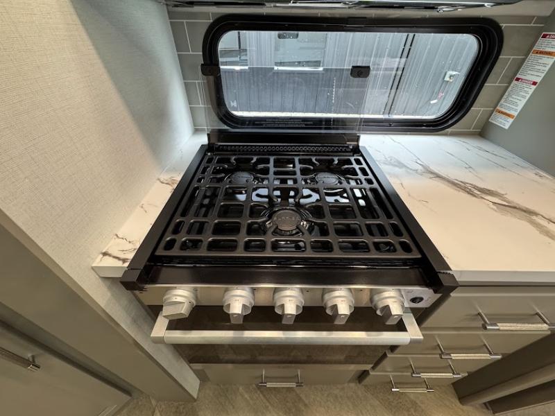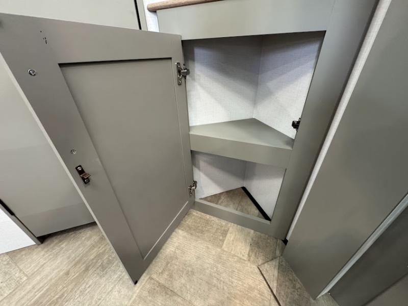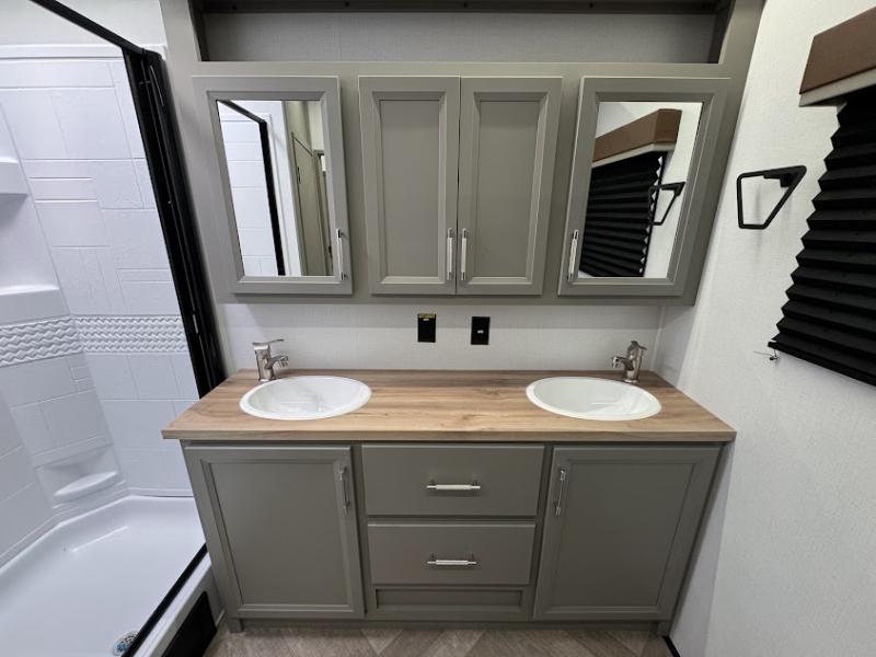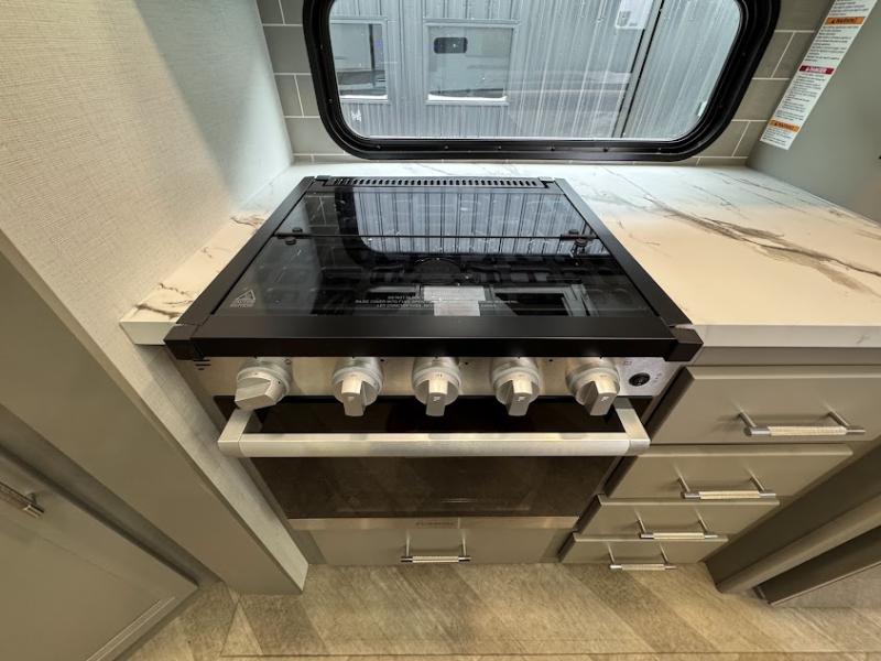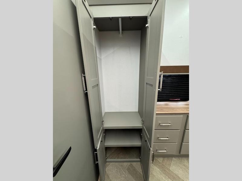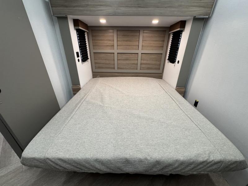 The Sprinter fifth wheels by Keystone feature spacious living areas, plenty of storage, and outstanding towability. Each unit is constructed with 2" thick double welded aluminum frame construction, a fully walkable roof and slide out roof, and dual layer insulation to help extend your camping season. The heated pass-through storage includes lockable slam latch baggage doors so you can easily pack your gear, and the one-touch 4-point leveling system features return hookup memory to have you set up in no-time. Head inside to find DynaSpan Marine Grade floor decking, Thomas Payne luxury collection furniture and residential style seamless marbled countertops to name a few comforts. The Sprinter also includes a Suburban tankless on-demand water heater, black out aluminum wheels, plus a 30k BTU furnace to ensure your comfort!