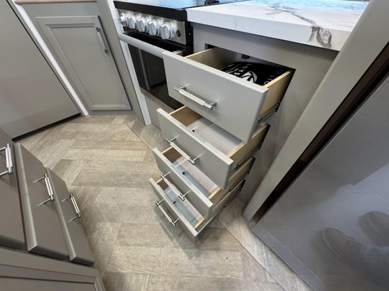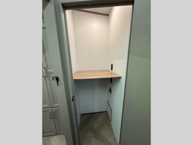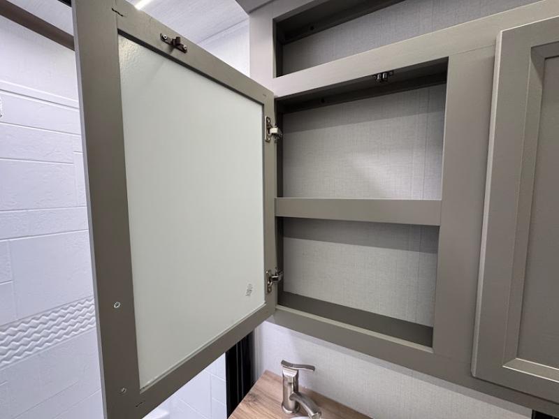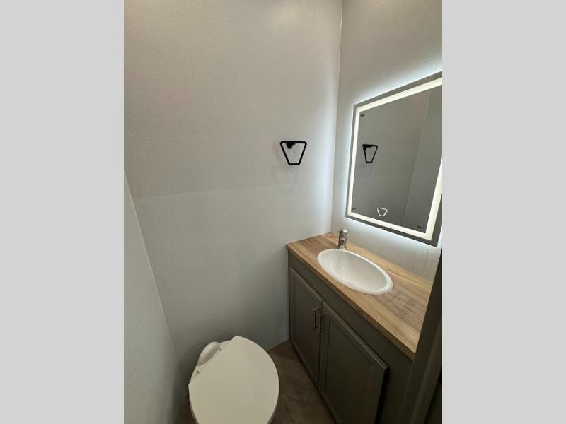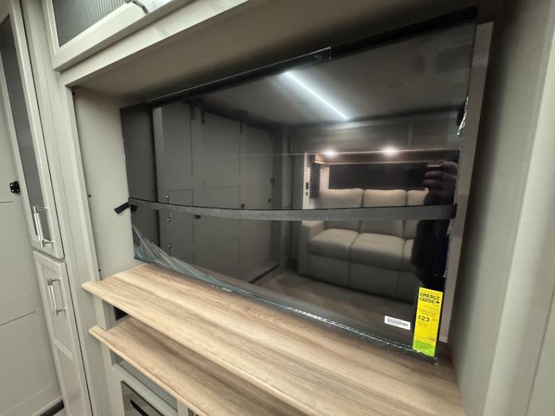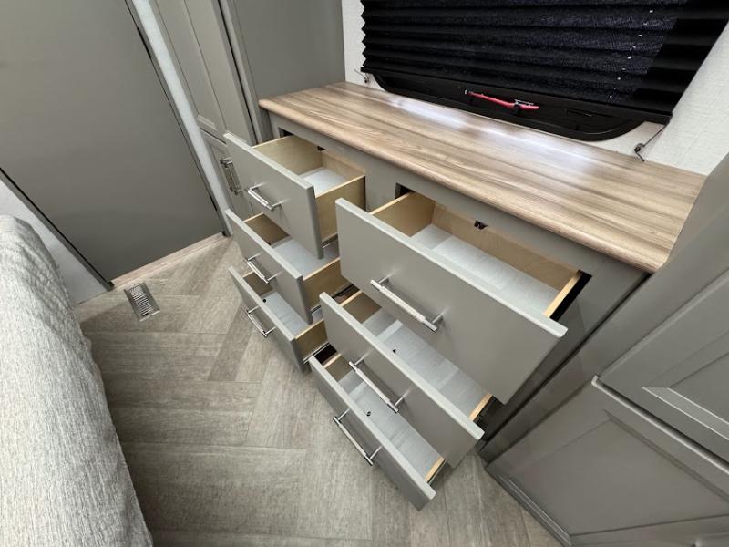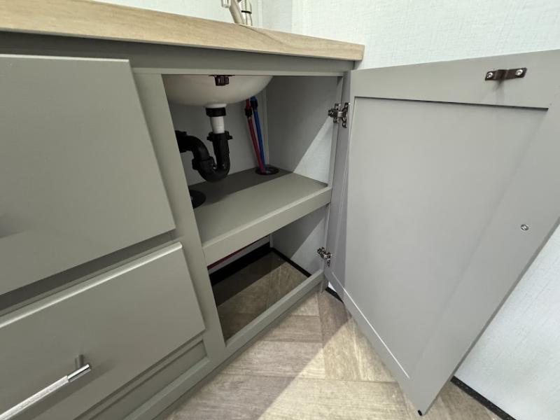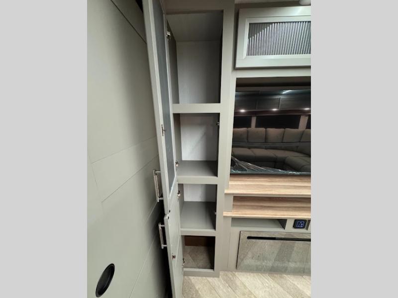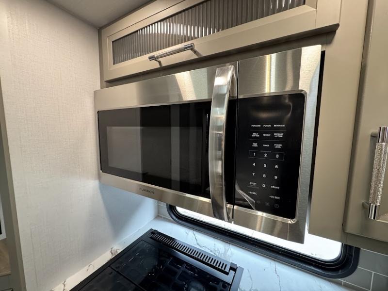 The Sprinter fifth wheels by Keystone feature spacious living areas, plenty of storage, and outstanding towability. Each unit is constructed with 2" thick double welded aluminum frame construction, a fully walkable roof and slide out roof, and dual layer insulation to help extend your camping season. The heated pass-through storage includes lockable slam latch baggage doors so you can easily pack your gear, and the one-touch 4-point leveling system features return hookup memory to have you set up in no-time. Head inside to find DynaSpan Marine Grade floor decking, Thomas Payne luxury collection furniture and residential style seamless marbled countertops to name a few comforts. The Sprinter also includes a Suburban tankless on-demand water heater, black out aluminum wheels, plus a 30k BTU furnace to ensure your comfort!