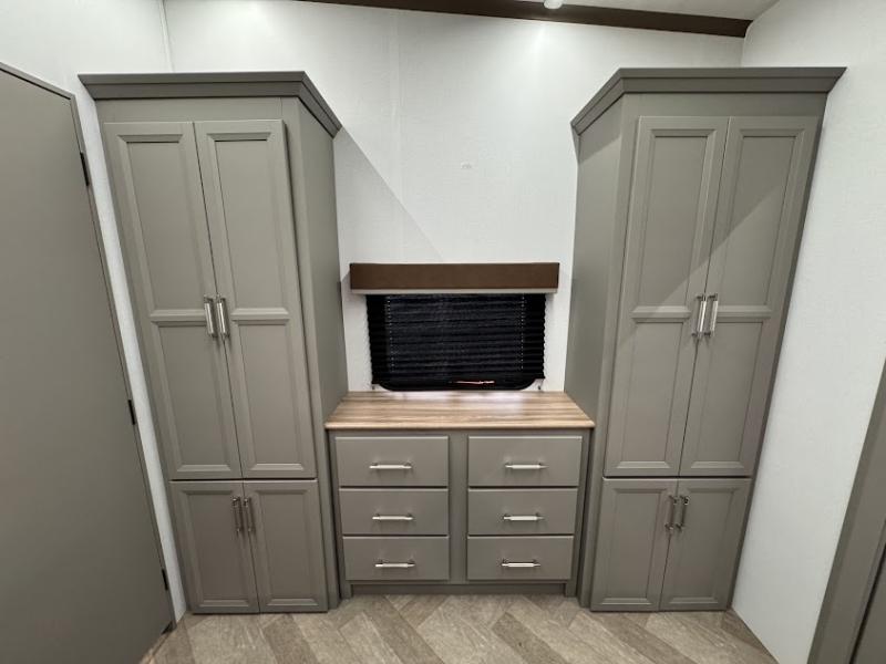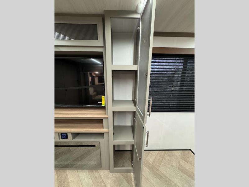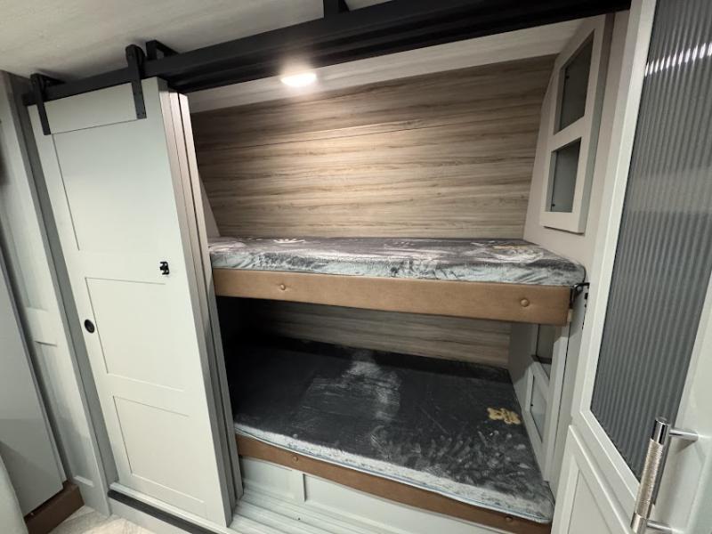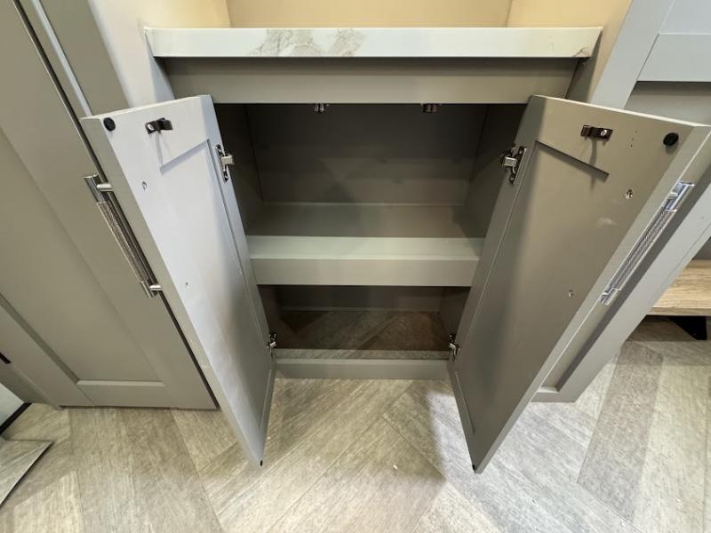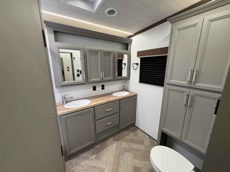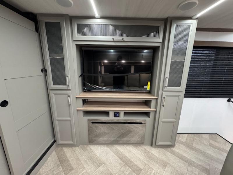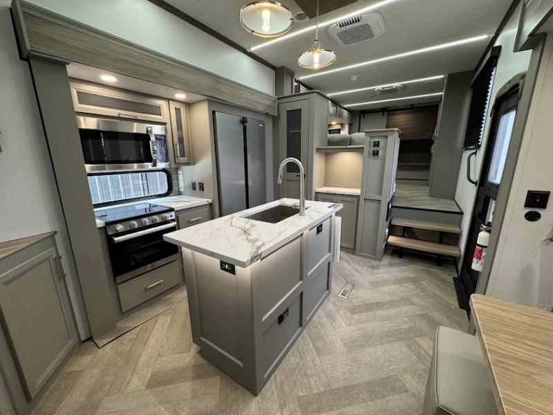 At the front, the inviting living area features a large L-shaped sofa, perfect for relaxing, with a cozy fireplace and 50" TV across from it for enjoyable movie nights. Tucked nearby are hidden bunks and storage cubbies, providing extra sleeping space and convenient organization. In the center of the trailer, the full kitchen opens up with dual slide-outs for added room, including a slide with a Furrion three-burner gas range, overhead cabinetry, and a generous 16 cu. ft. refrigerator for groceries. A nearby pantry and coffee bar keep dry goods organized and make mornings easy. The kitchen island with sink and flip-up counter extension offers ample prep space, while the opposite slide features a free-standing dinette ideal for meals or board games. A conveniently located half bath adds extra practicality. Toward the rear, the private bedroom includes a 70" x 80" king bed in a slide-out, along with wardrobes and a dresser for clothing and essentials. The rear master bathroom completes the layout with dual sinks, making it easy for two to get ready at the same time.