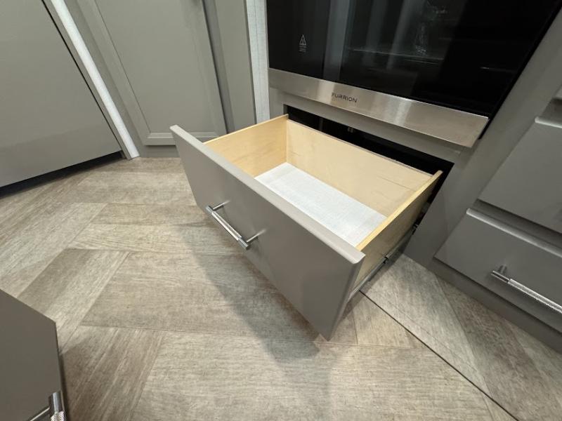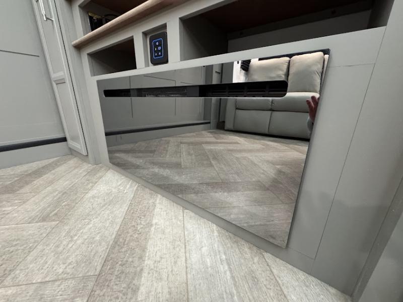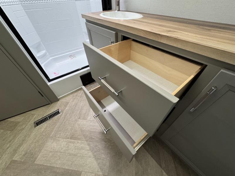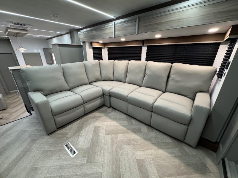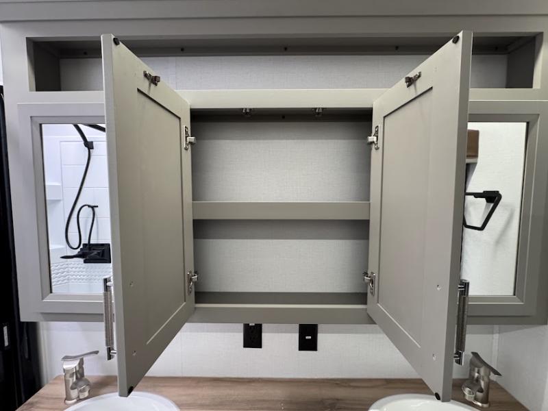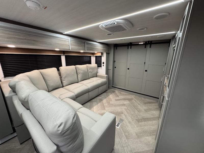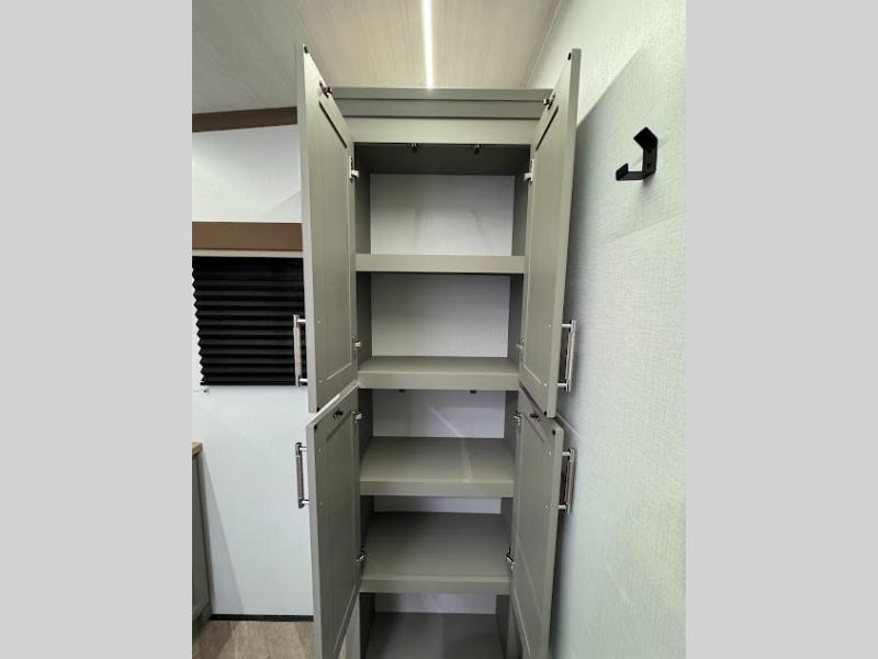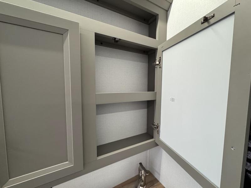 At the front, the inviting living area features a large L-shaped sofa, perfect for relaxing, with a cozy fireplace and 50" TV across from it for enjoyable movie nights. Tucked nearby are hidden bunks and storage cubbies, providing extra sleeping space and convenient organization. In the center of the trailer, the full kitchen opens up with dual slide-outs for added room, including a slide with a Furrion three-burner gas range, overhead cabinetry, and a generous 16 cu. ft. refrigerator for groceries. A nearby pantry and coffee bar keep dry goods organized and make mornings easy. The kitchen island with sink and flip-up counter extension offers ample prep space, while the opposite slide features a free-standing dinette ideal for meals or board games. A conveniently located half bath adds extra practicality. Toward the rear, the private bedroom includes a 70" x 80" king bed in a slide-out, along with wardrobes and a dresser for clothing and essentials. The rear master bathroom completes the layout with dual sinks, making it easy for two to get ready at the same time.