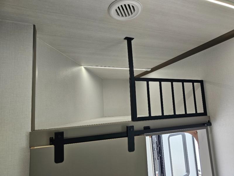 Rear private bunkhouse with two sets of 51" x 74" bunk beds, each with flip-up bottom bunks for added floor space