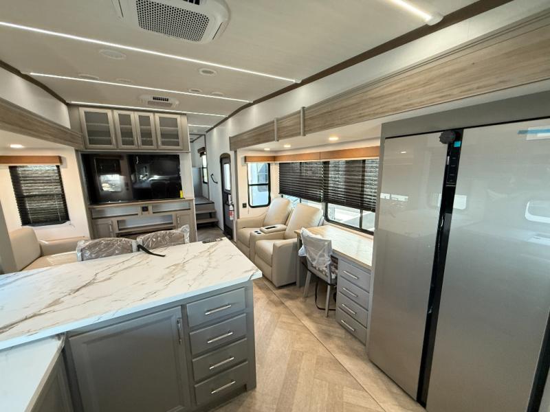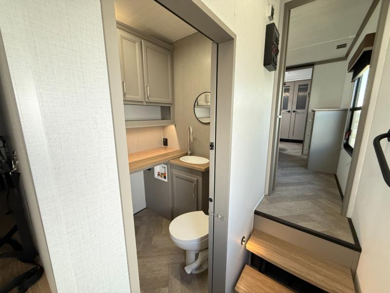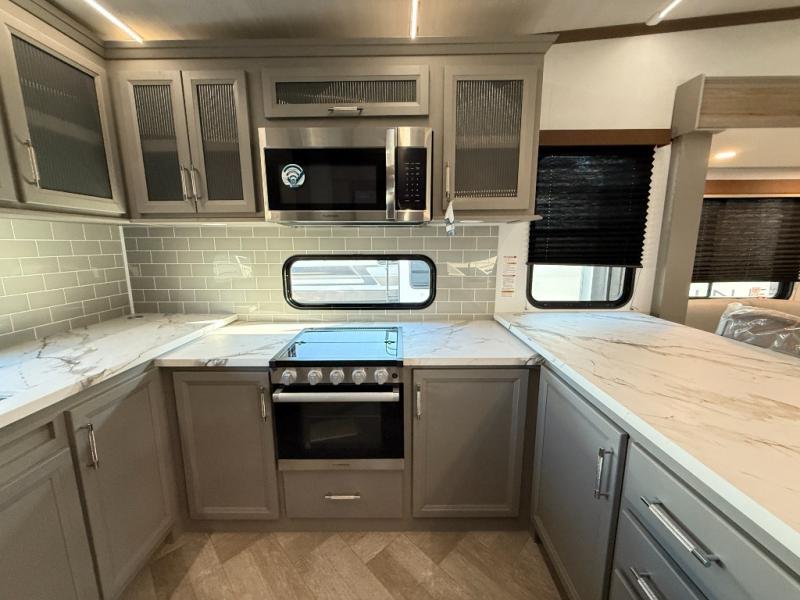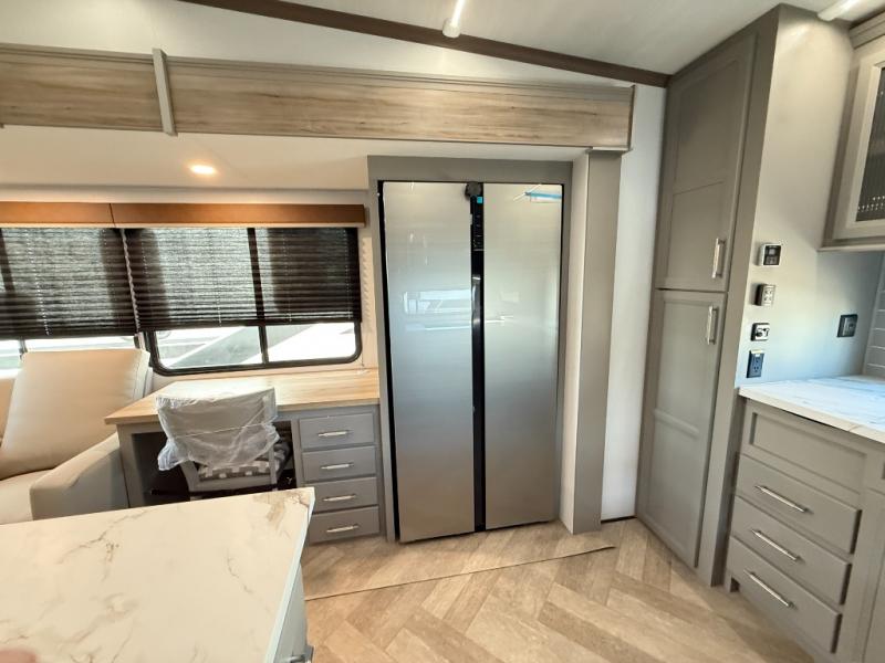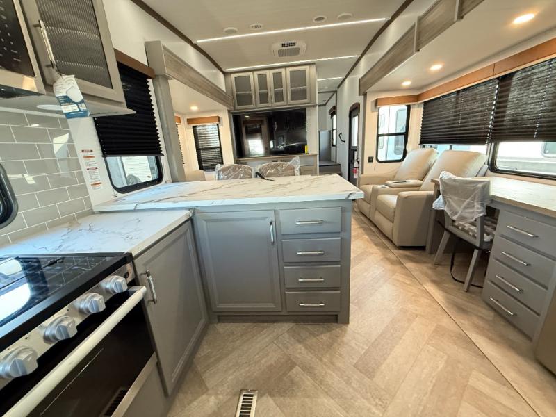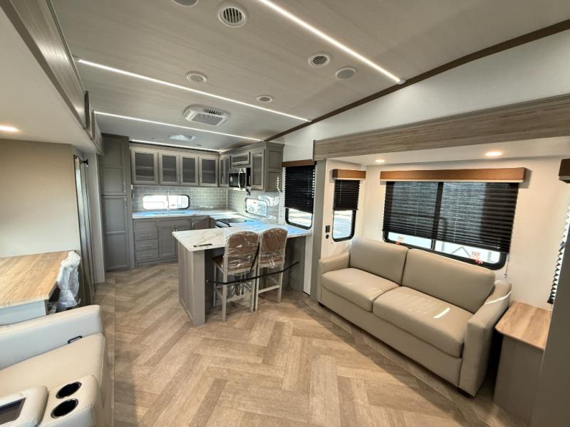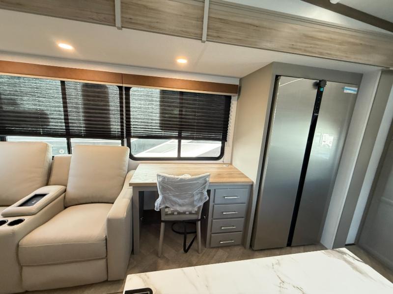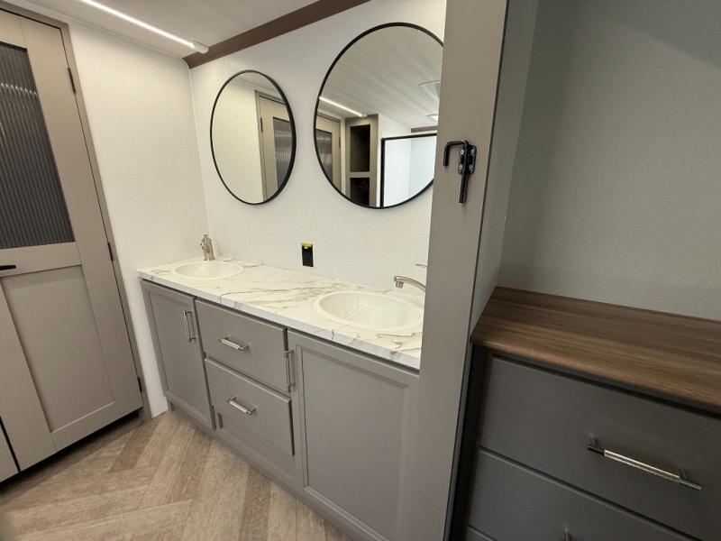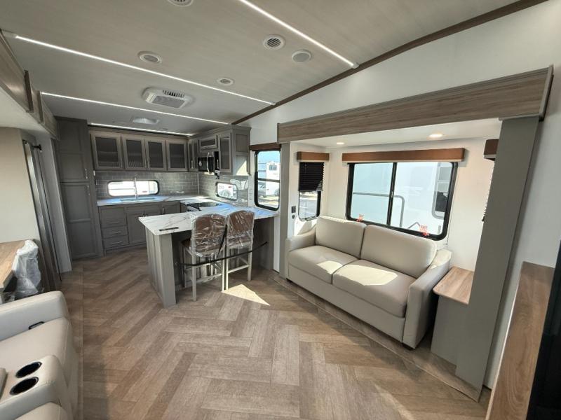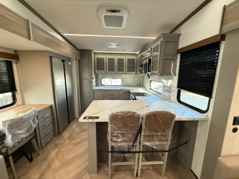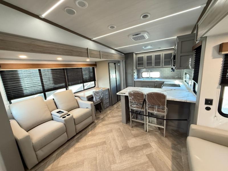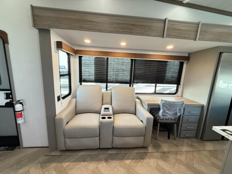 There is much to love about this fifth wheel! Starting with the front full bathroom which has a dual sink vanity for two to get ready at once and heading to the rear kitchen where you will have everything you need to prepare the best home cooked meals. There are also three bar stools at the bar top so guests can socialize with the cook. If you need to get a little work done while you're away, then you can easily get it done at the desk with chair next to the reclining theater seating and the 16 cu. ft. refrigerator for quick access to a snack break. The private bedroom has a king bed slide to lay your head on at night, and if you need an extra sleeping space then you can utilize the sofa slide too. Inside the half bathroom is a countertop with an area prepped for a washer and dryer to be added so you can enjoy clean clothes throughout your entire trip!