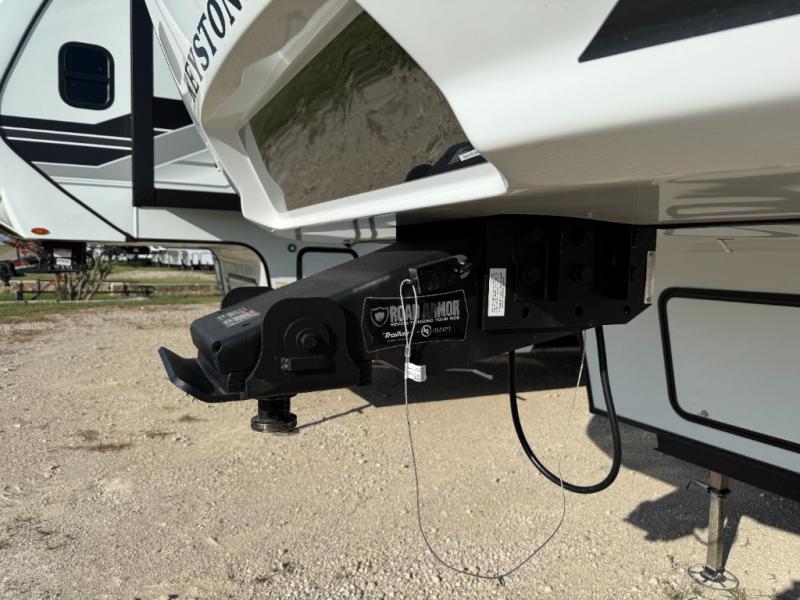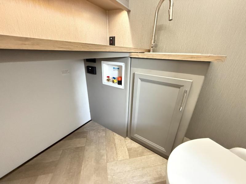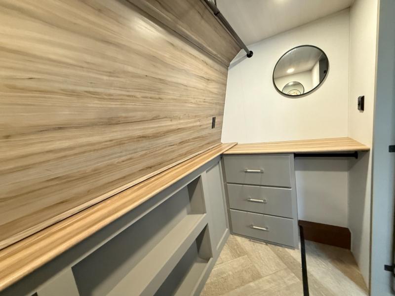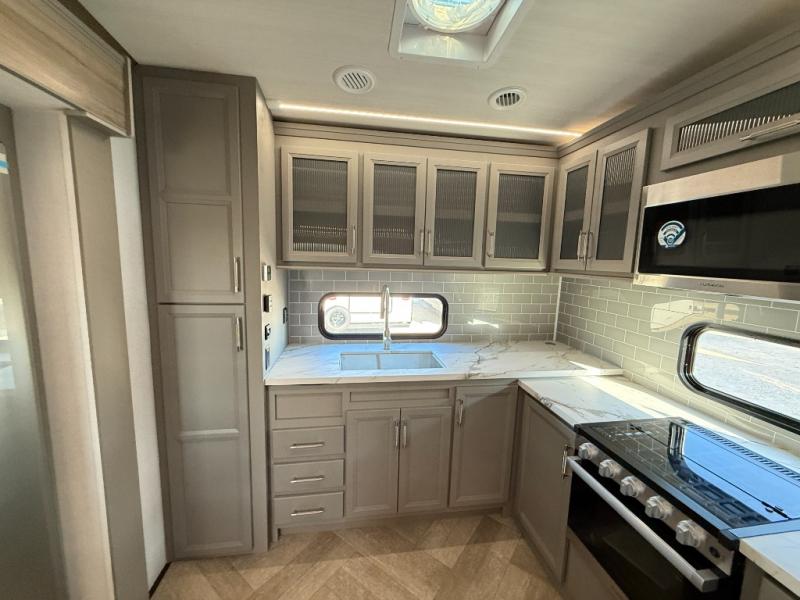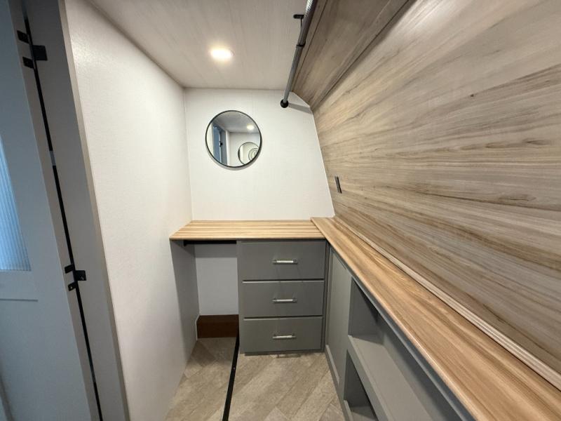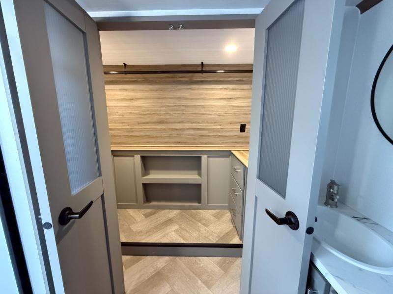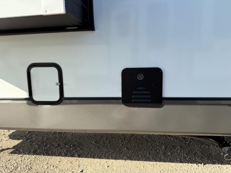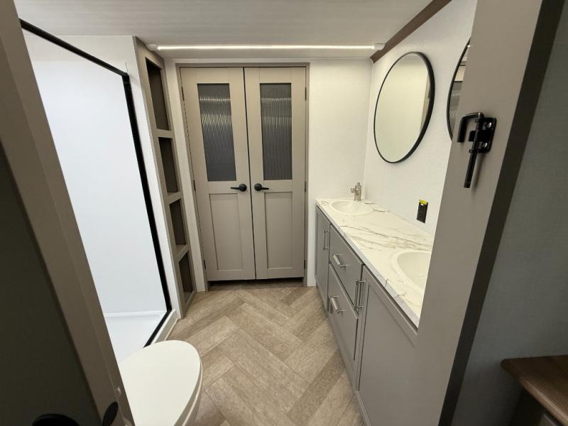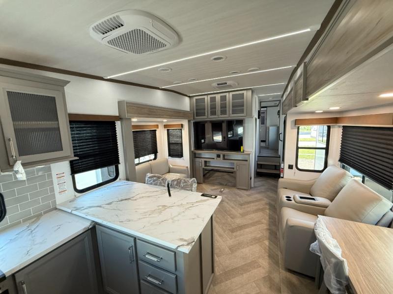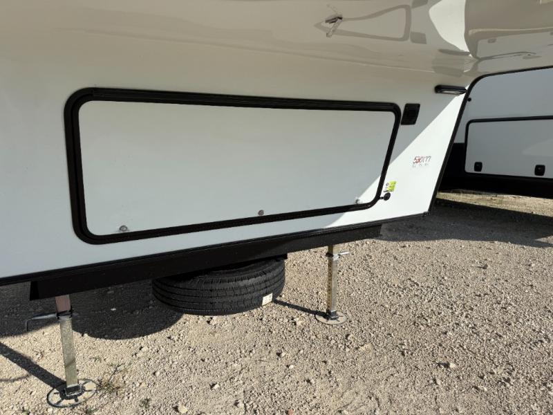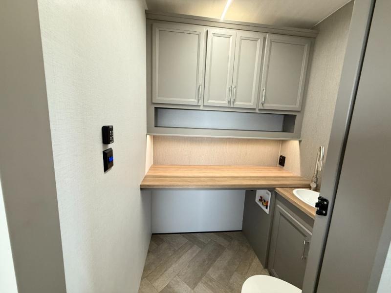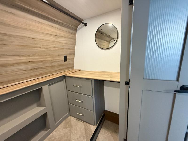There is much to love about this fifth wheel! Starting with the front full bathroom which has a dual sink vanity for two to get ready at once and heading to the rear kitchen where you will have everything you need to prepare the best home cooked meals. There are also three bar stools at the bar top so guests can socialize with the cook. If you need to get a little work done while you're away, then you can easily get it done at the desk with chair next to the reclining theater seating and the 16 cu. ft. refrigerator for quick access to a snack break. The private bedroom has a king bed slide to lay your head on at night, and if you need an extra sleeping space then you can utilize the sofa slide too. Inside the half bathroom is a countertop with an area prepped for a washer and dryer to be added so you can enjoy clean clothes throughout your entire trip!