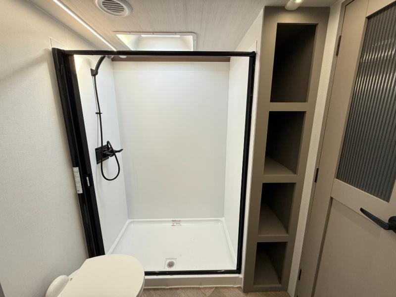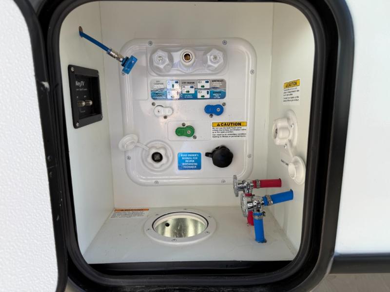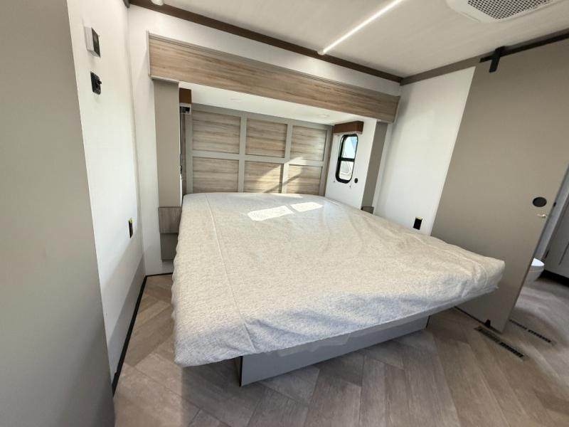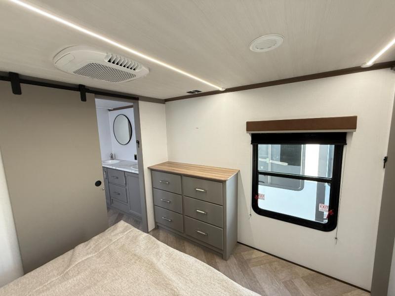 The Sprinter fifth wheels by Keystone feature spacious living areas, plenty of storage, and outstanding towability. Each unit is constructed with 2" aluminum framed and laminated sidewalls, a fully walkable roof, and dual layer insulation to help extend your camping season. The heated pass-through storage includes lockable slam latch baggage doors so you can easily pack your gear, and the one-touch 4-point leveling system features return hookup memory to have you set up in no-time. Head inside to find Congoleum vinyl flooring, Thomas Payne luxury collection furniture, residential style seamless marbled countertops, and an upgraded bedspread to name a few comforts. The Sprinter also includes a Girard tankless on-demand water heater, a central command center, plus a 30k BTU furnace and two A/C units to ensure your comfort!