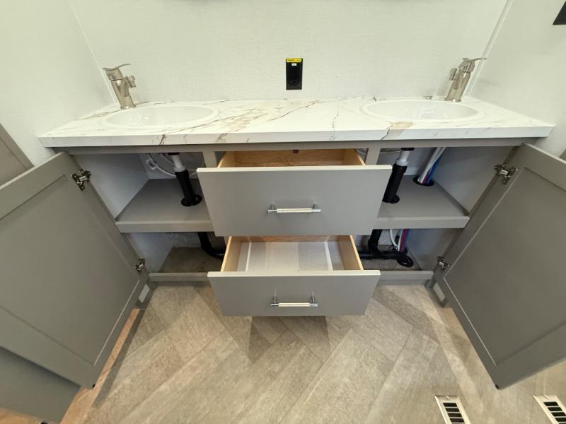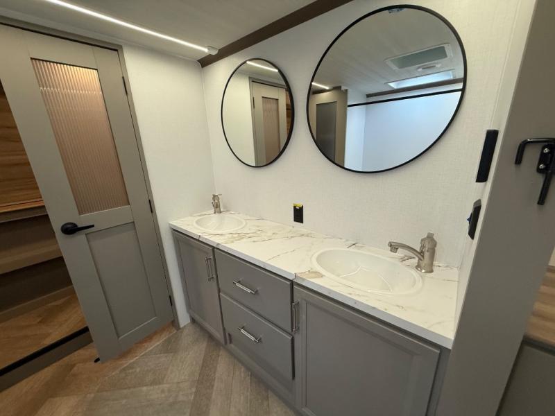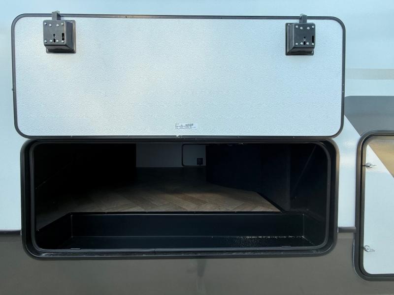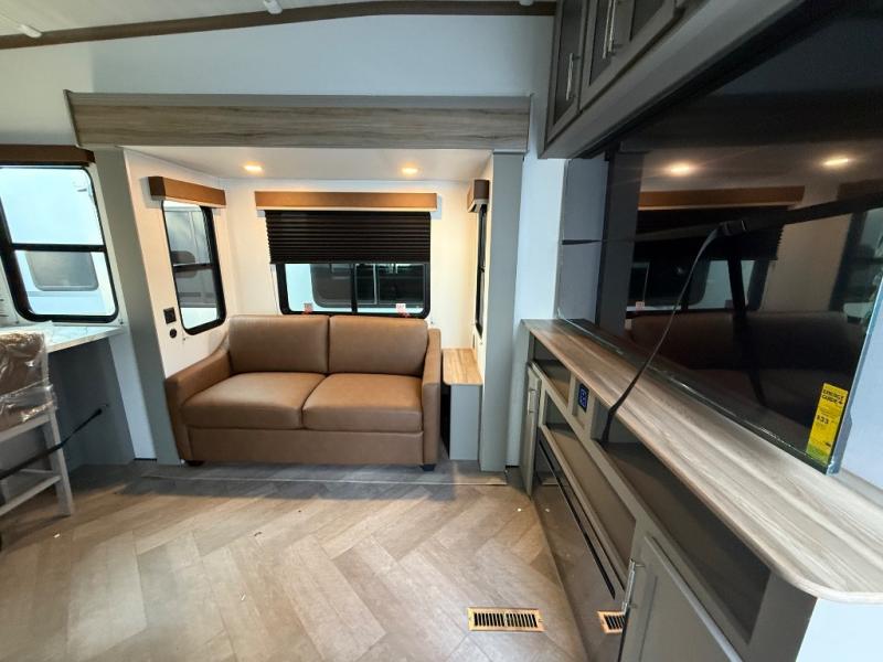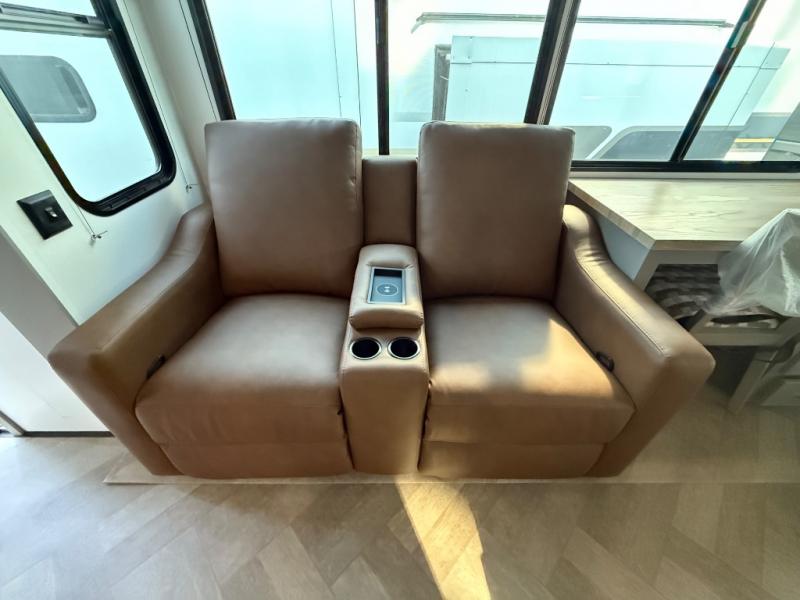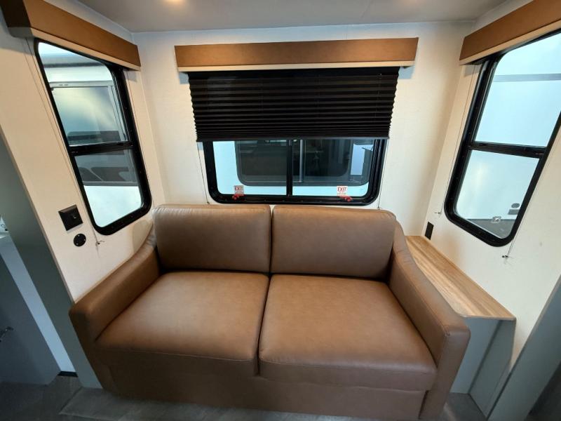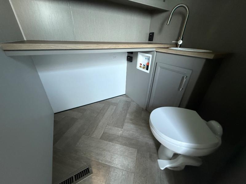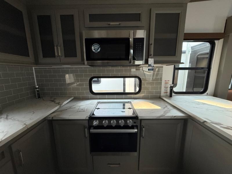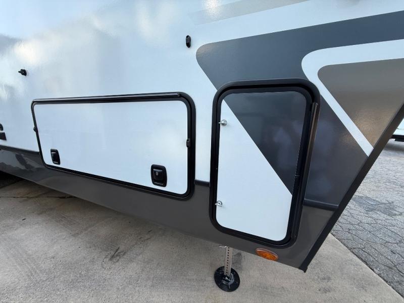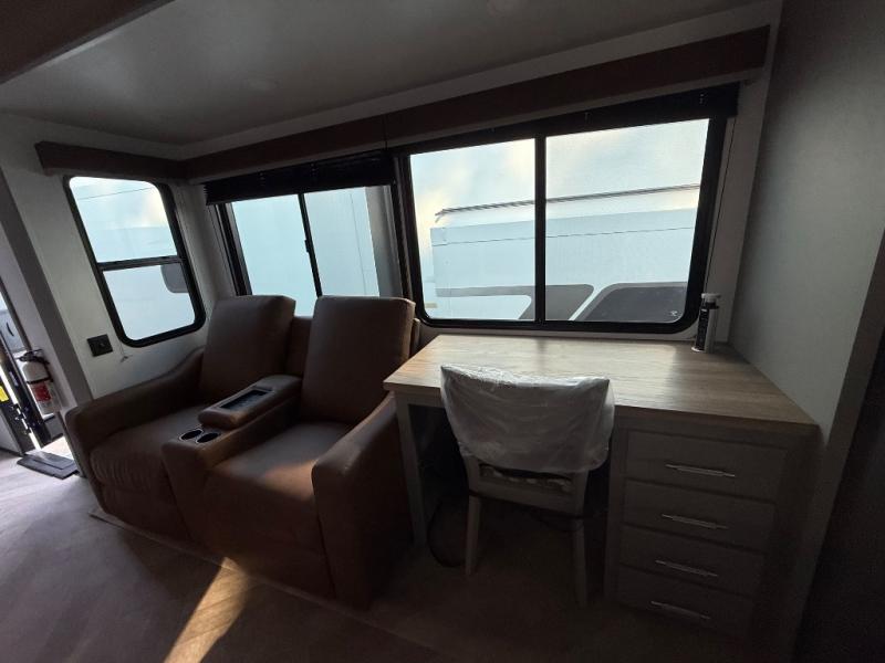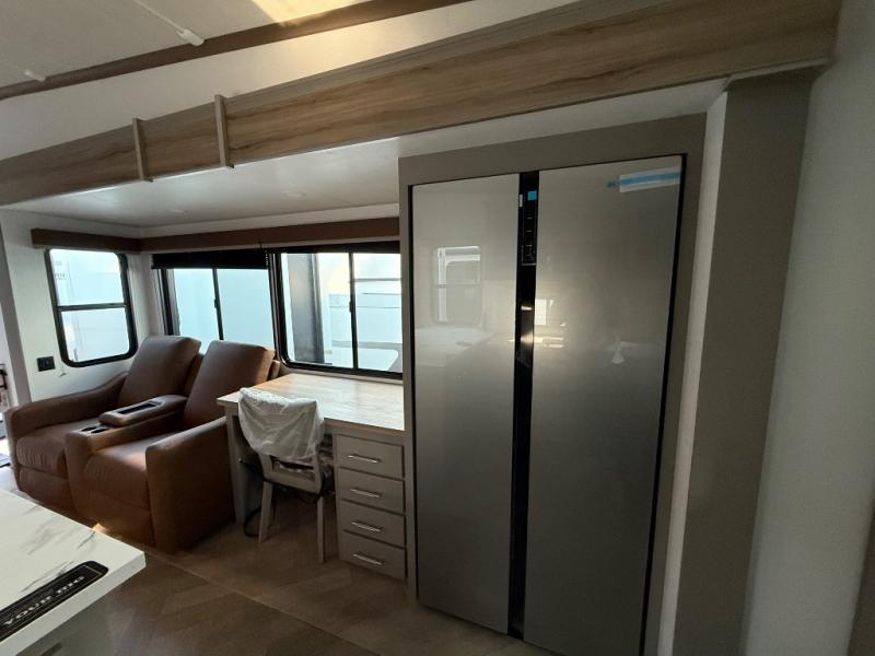 There is much to love about this fifth wheel! Starting with the front full bathroom which has a dual sink vanity for two to get ready at once and heading to the rear kitchen where you will have everything you need to prepare the best home cooked meals. There are also three bar stools at the bar top so guests can socialize with the cook. If you need to get a little work done while you're away, then you can easily get it done at the desk with chair next to the reclining theater seating and the 16 cu. ft. refrigerator for quick access to a snack break. The private bedroom has a king bed slide to lay your head on at night, and if you need an extra sleeping space then you can utilize the sofa slide too. Inside the half bathroom is a countertop with an area prepped for a washer and dryer to be added so you can enjoy clean clothes throughout your entire trip!