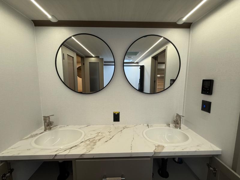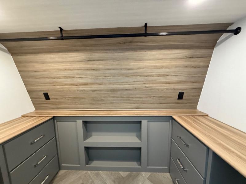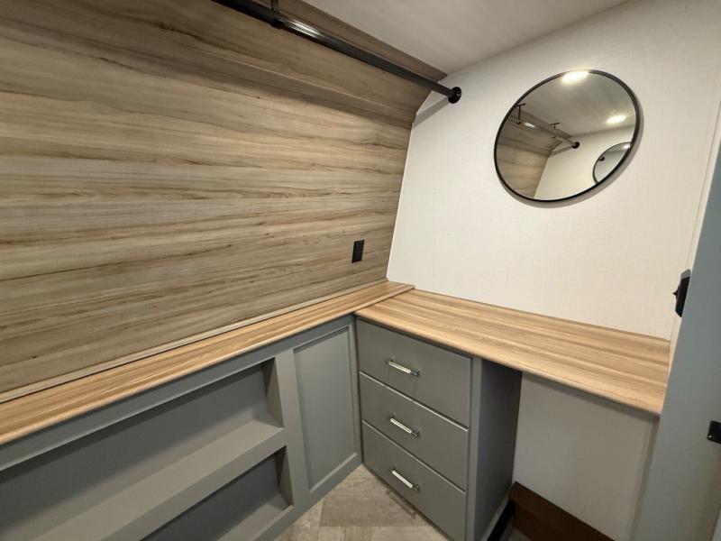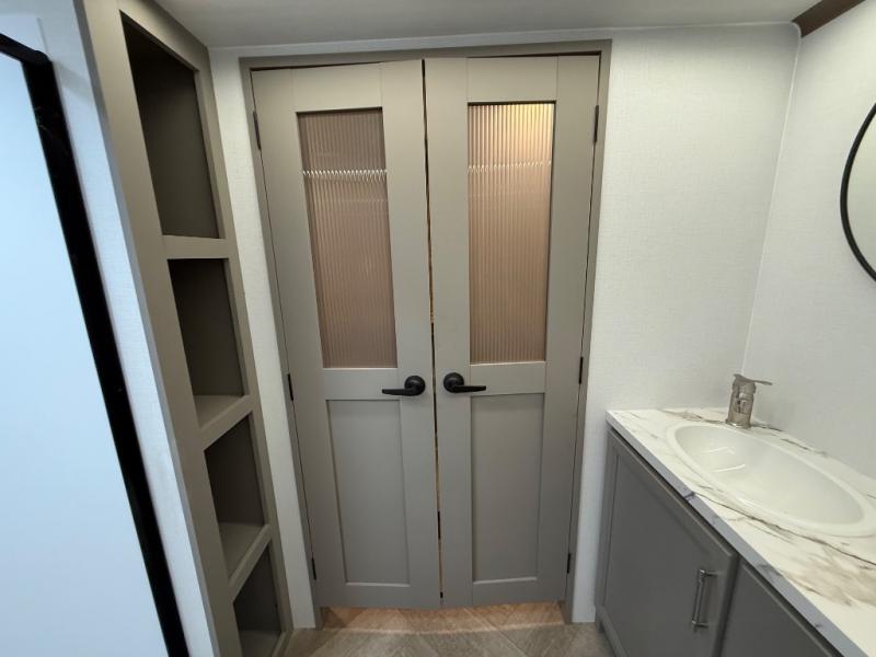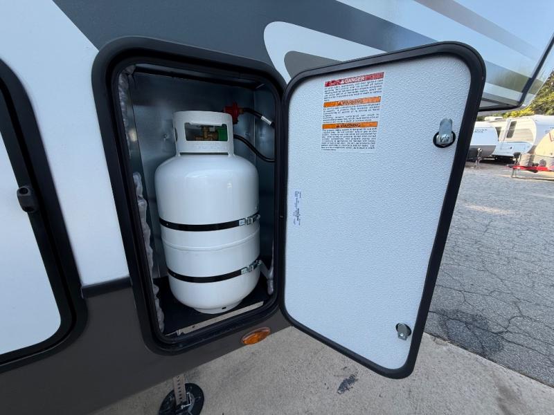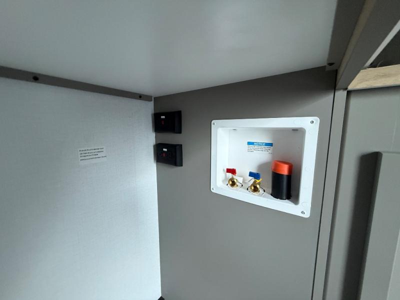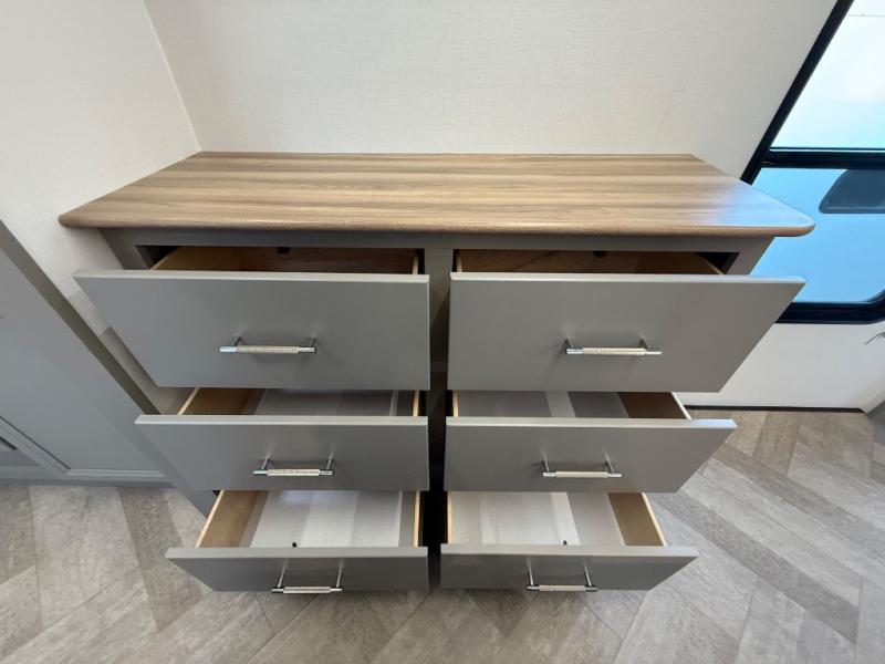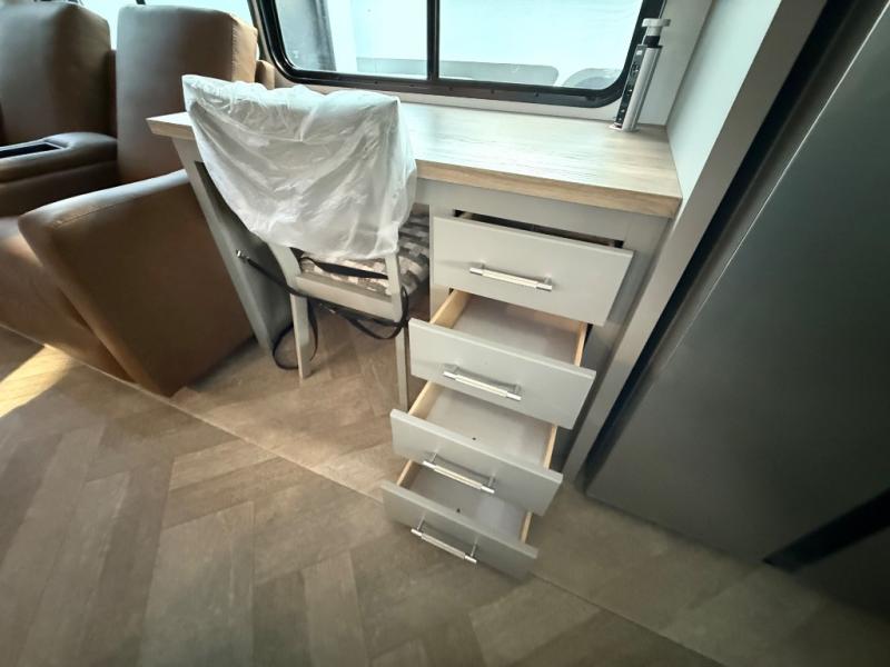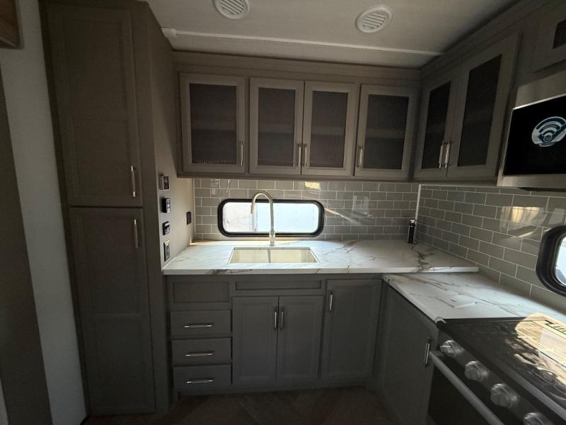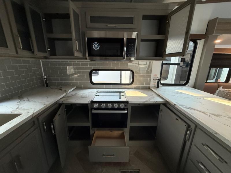 There is much to love about this fifth wheel! Starting with the front full bathroom which has a dual sink vanity for two to get ready at once and heading to the rear kitchen where you will have everything you need to prepare the best home cooked meals. There are also three bar stools at the bar top so guests can socialize with the cook. If you need to get a little work done while you're away, then you can easily get it done at the desk with chair next to the reclining theater seating and the 16 cu. ft. refrigerator for quick access to a snack break. The private bedroom has a king bed slide to lay your head on at night, and if you need an extra sleeping space then you can utilize the sofa slide too. Inside the half bathroom is a countertop with an area prepped for a washer and dryer to be added so you can enjoy clean clothes throughout your entire trip!