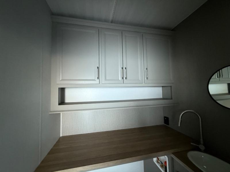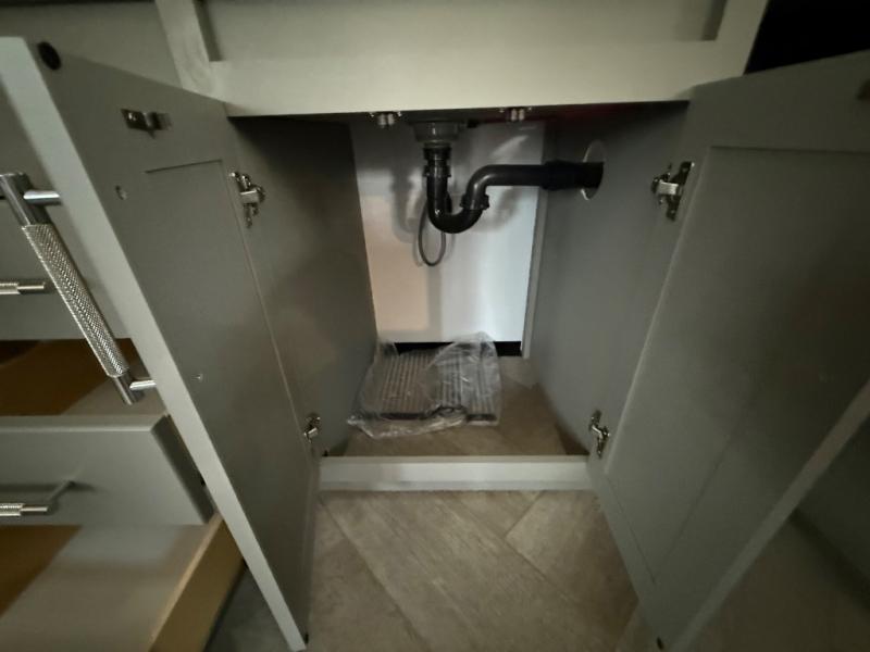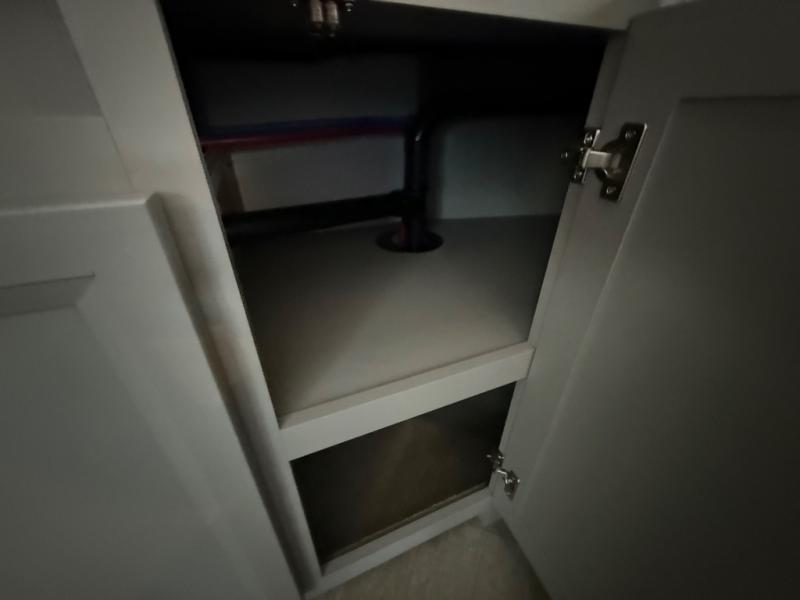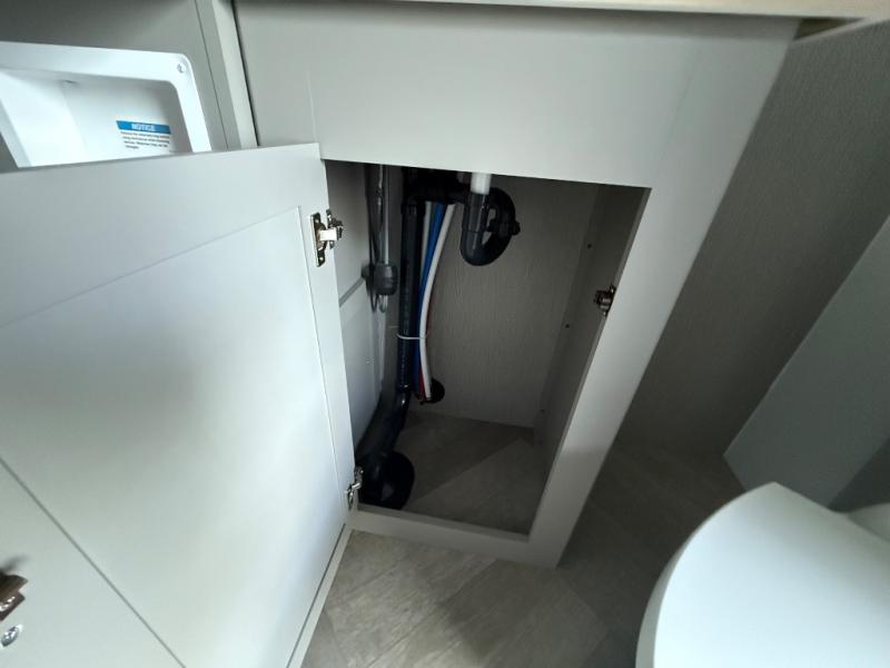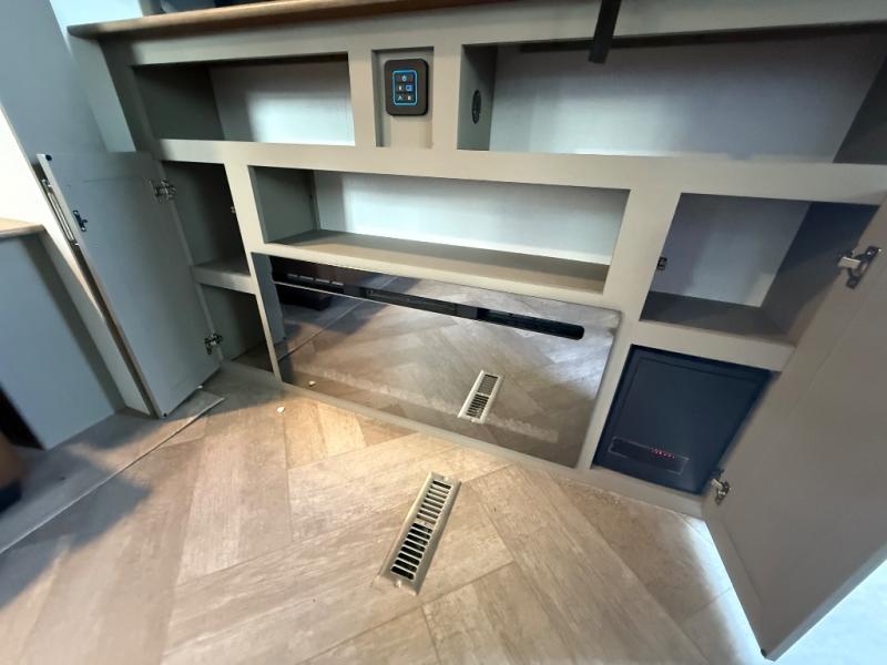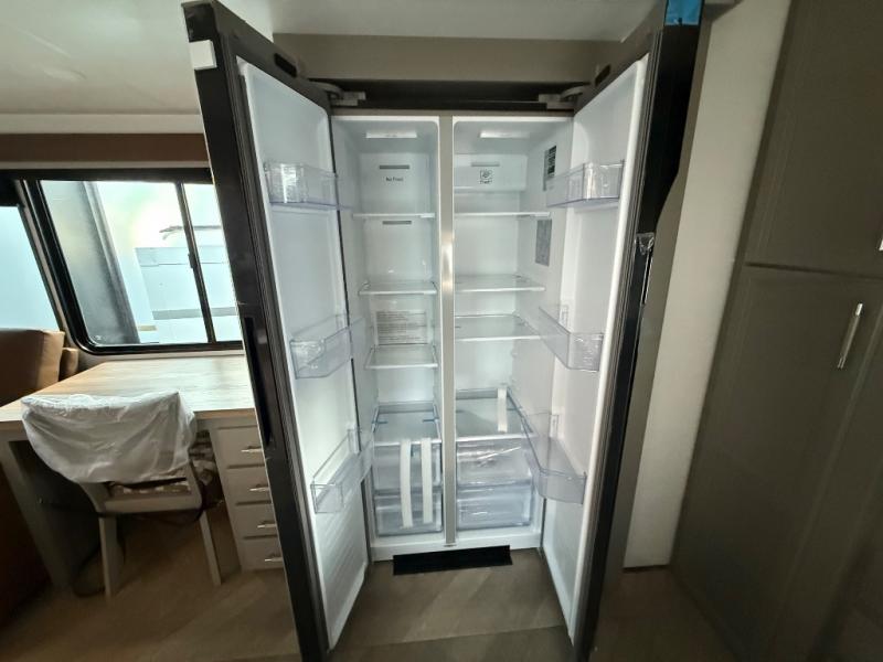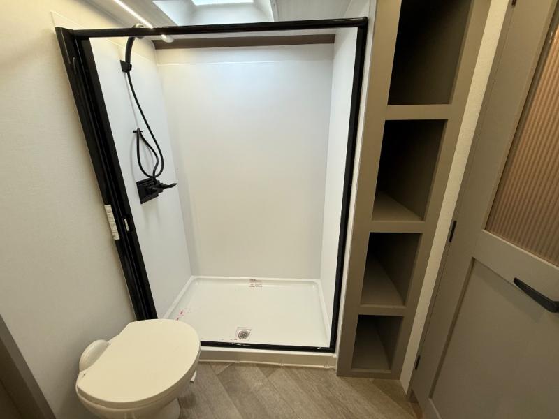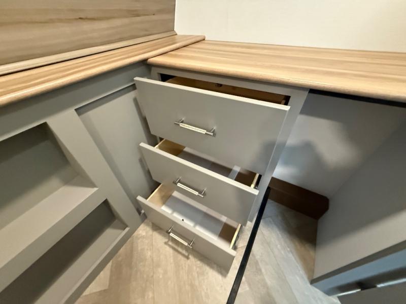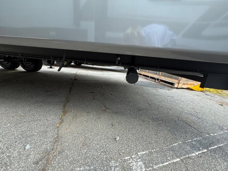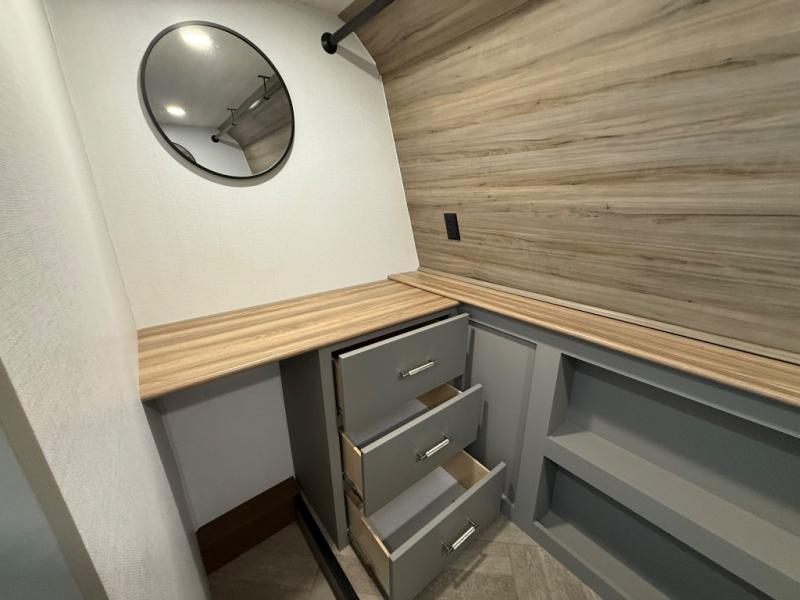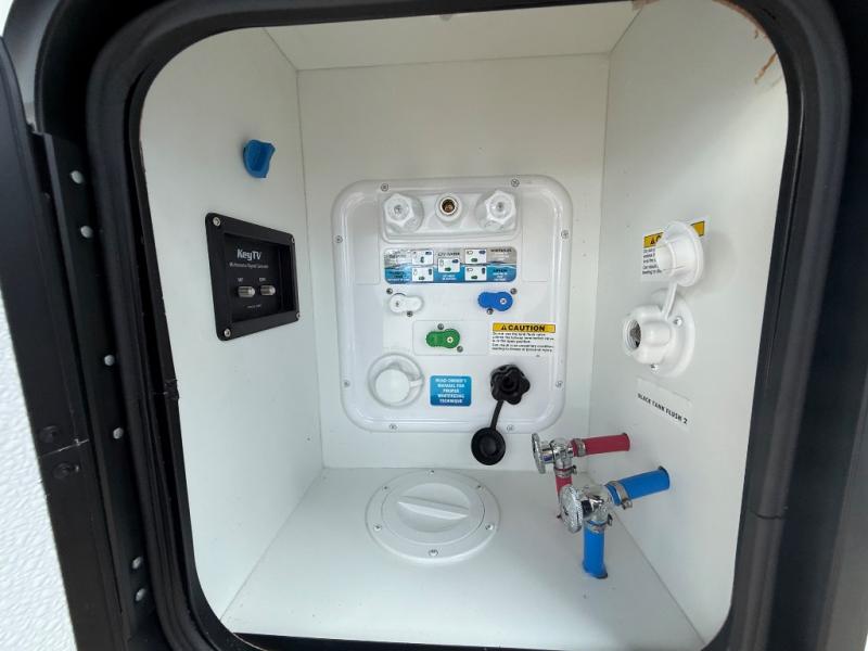 There is much to love about this fifth wheel! Starting with the front full bathroom which has a dual sink vanity for two to get ready at once and heading to the rear kitchen where you will have everything you need to prepare the best home cooked meals. There are also three bar stools at the bar top so guests can socialize with the cook. If you need to get a little work done while you're away, then you can easily get it done at the desk with chair next to the reclining theater seating and the 16 cu. ft. refrigerator for quick access to a snack break. The private bedroom has a king bed slide to lay your head on at night, and if you need an extra sleeping space then you can utilize the sofa slide too. Inside the half bathroom is a countertop with an area prepped for a washer and dryer to be added so you can enjoy clean clothes throughout your entire trip!