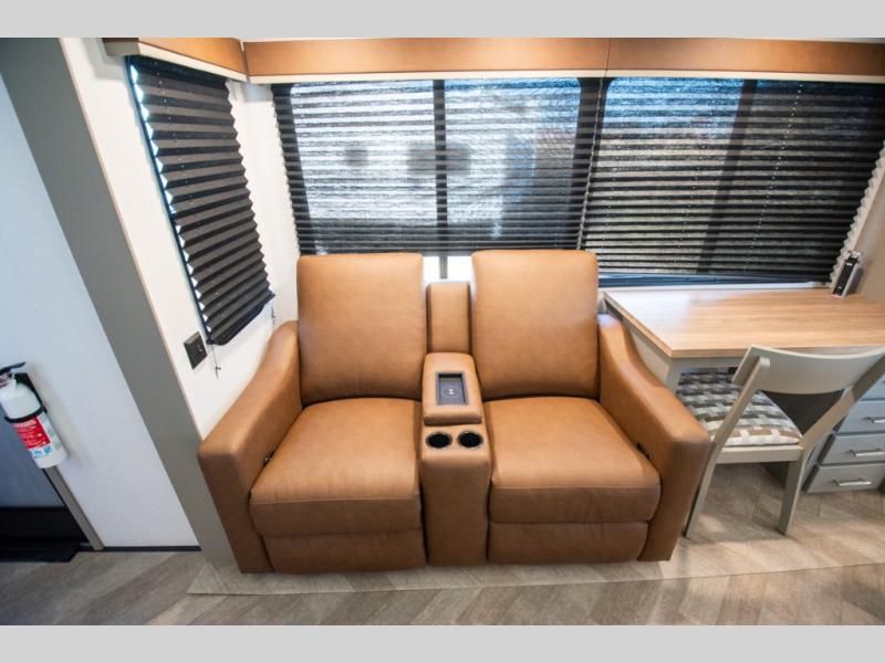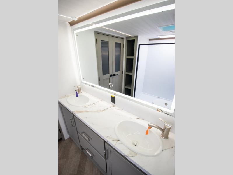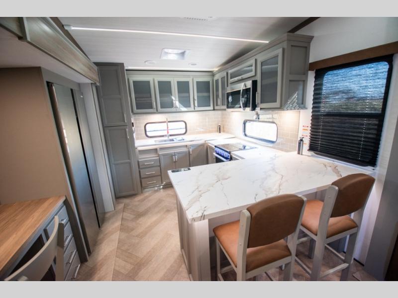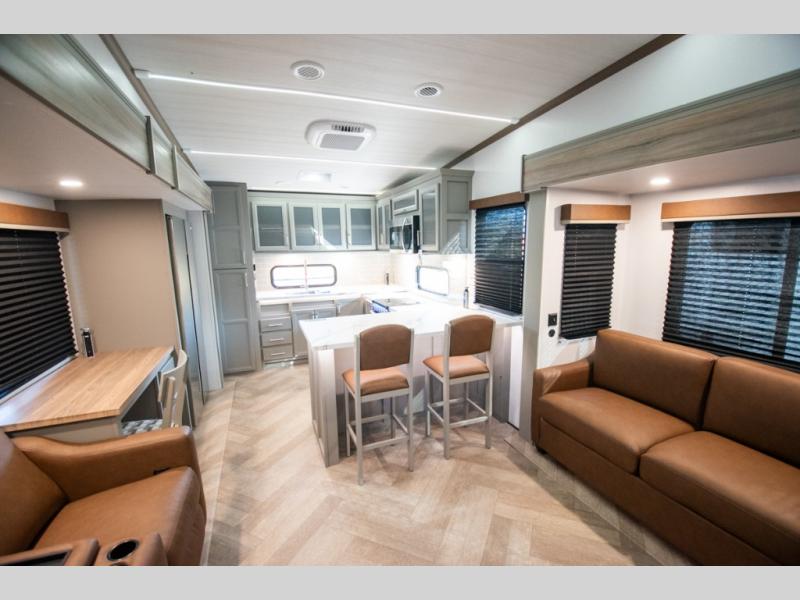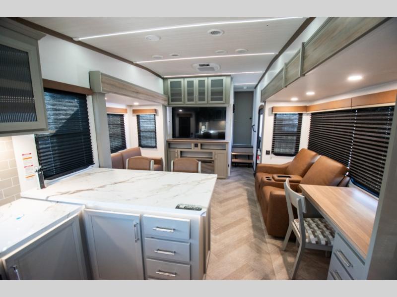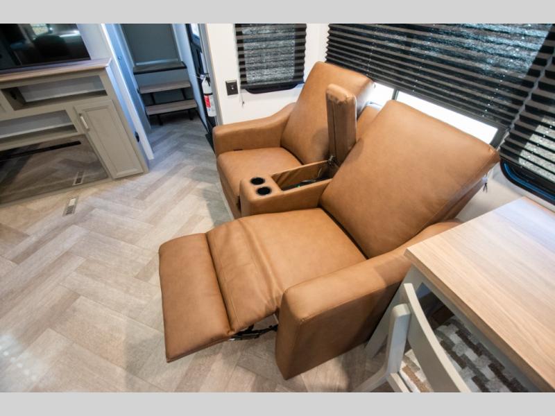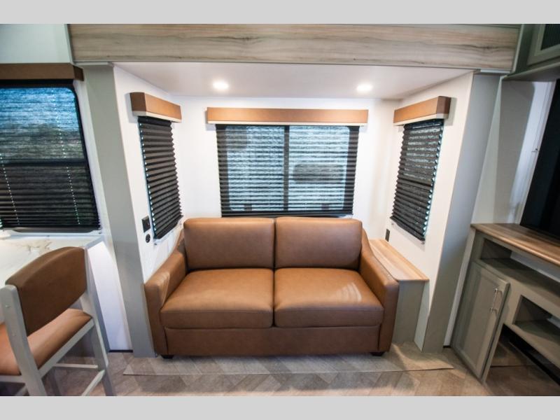 There is much to love about this fifth wheel! Starting with the front full bathroom which has a dual sink vanity for two to get ready at once and heading to the rear kitchen where you will have everything you need to prepare the best home cooked meals. There are also three bar stools at the bar top so guests can socialize with the cook. If you need to get a little work done while you're away, then you can easily get it done at the desk with chair next to the reclining theater seating and the 16 cu. ft. refrigerator for quick access to a snack break. The private bedroom has a king bed slide to lay your head on at night, and if you need an extra sleeping space then you can utilize the sofa slide too. Inside the half bathroom is a countertop with an area prepped for a washer and dryer to be added so you can enjoy clean clothes throughout your entire trip!