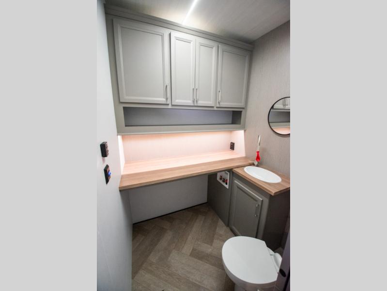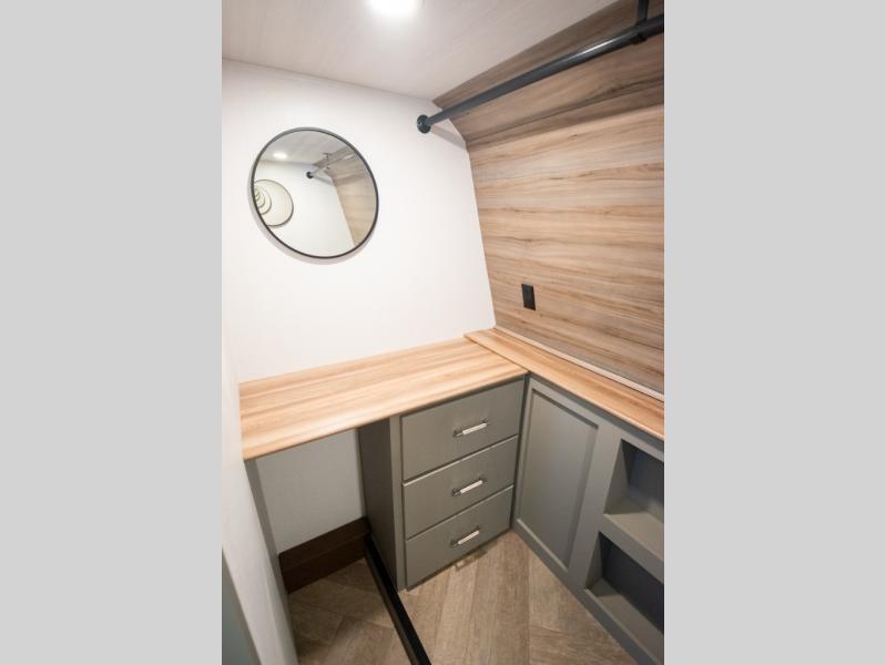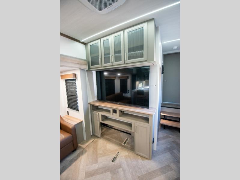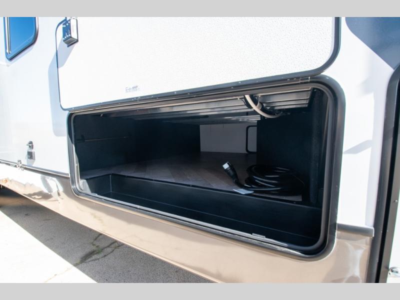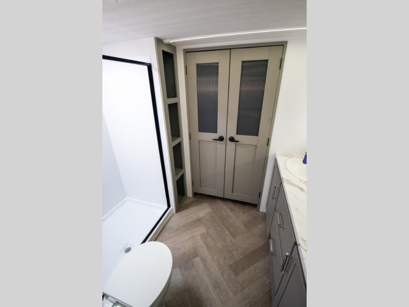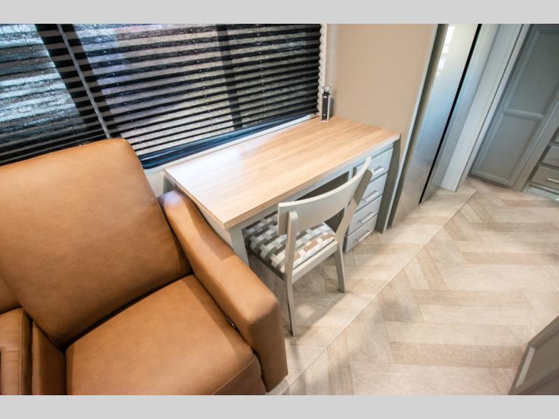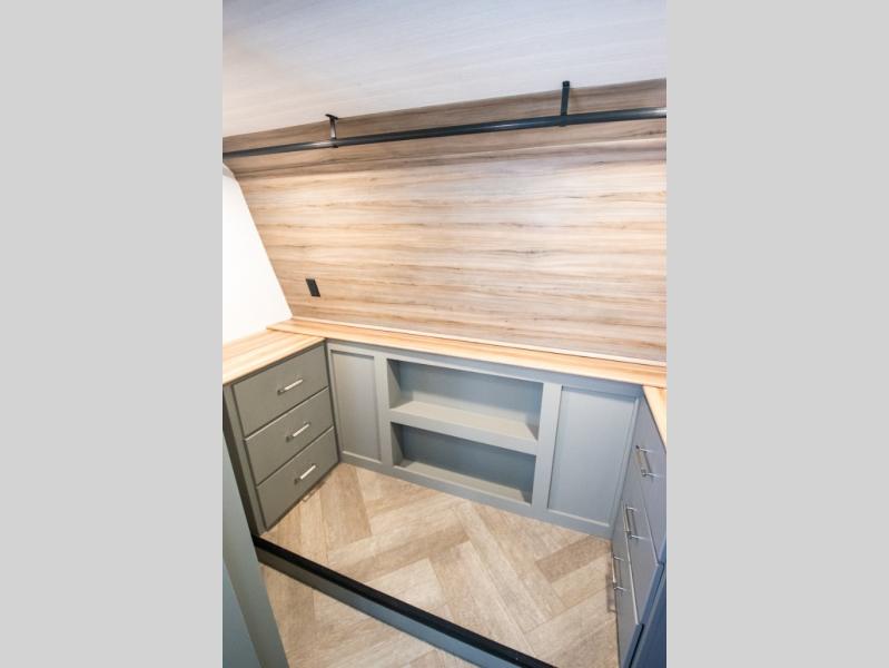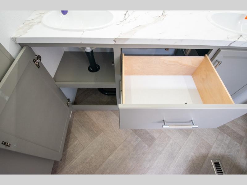 There is much to love about this fifth wheel! Starting with the front full bathroom which has a dual sink vanity for two to get ready at once and heading to the rear kitchen where you will have everything you need to prepare the best home cooked meals. There are also three bar stools at the bar top so guests can socialize with the cook. If you need to get a little work done while you're away, then you can easily get it done at the desk with chair next to the reclining theater seating and the 16 cu. ft. refrigerator for quick access to a snack break. The private bedroom has a king bed slide to lay your head on at night, and if you need an extra sleeping space then you can utilize the sofa slide too. Inside the half bathroom is a countertop with an area prepped for a washer and dryer to be added so you can enjoy clean clothes throughout your entire trip!