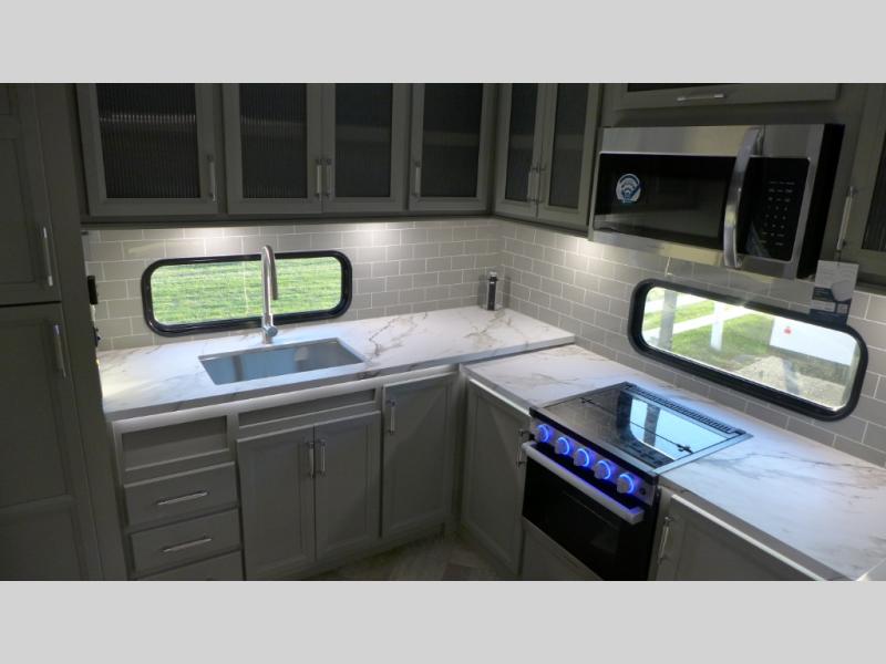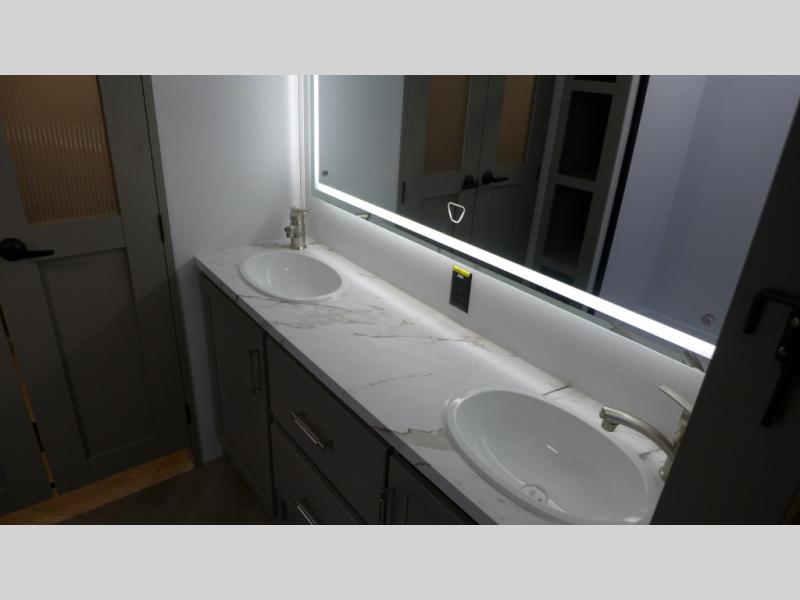 There is much to love about this fifth wheel! Starting with the front full bathroom which has a dual sink vanity for two to get ready at once and heading to the rear kitchen where you will have everything you need to prepare the best home cooked meals. There are also three bar stools at the bar top so guests can socialize with the cook. If you need to get a little work done while you're away, then you can easily get it done at the desk with chair next to the reclining theater seating and the 16 cu. ft. refrigerator for quick access to a snack break. The private bedroom has a king bed slide to lay your head on at night, and if you need an extra sleeping space then you can utilize the sofa slide too. Inside the half bathroom is a countertop with an area prepped for a washer and dryer to be added so you can enjoy clean clothes throughout your entire trip!