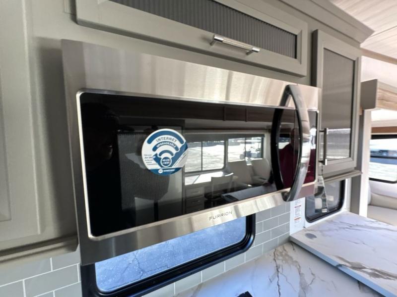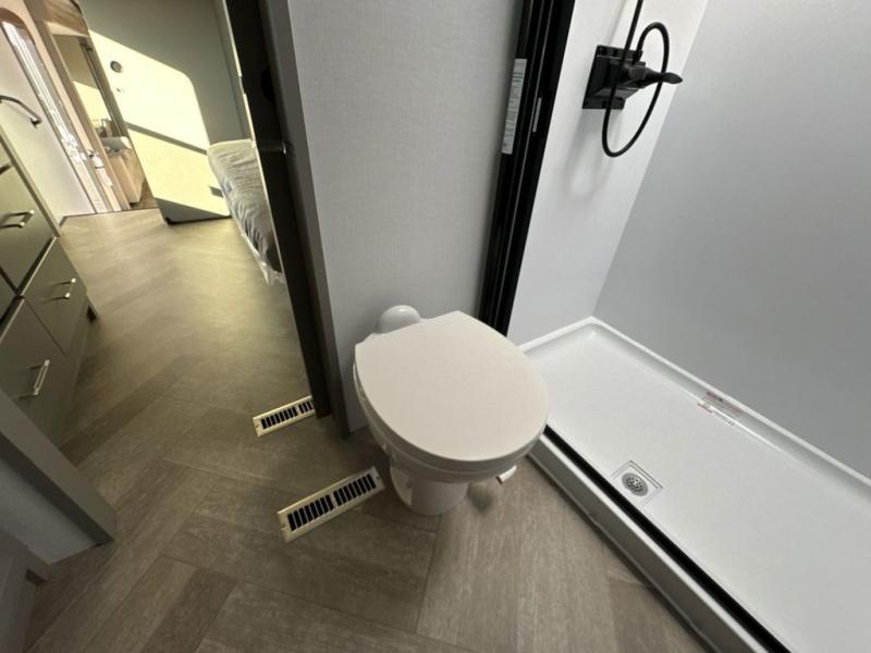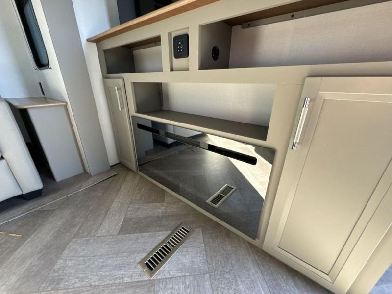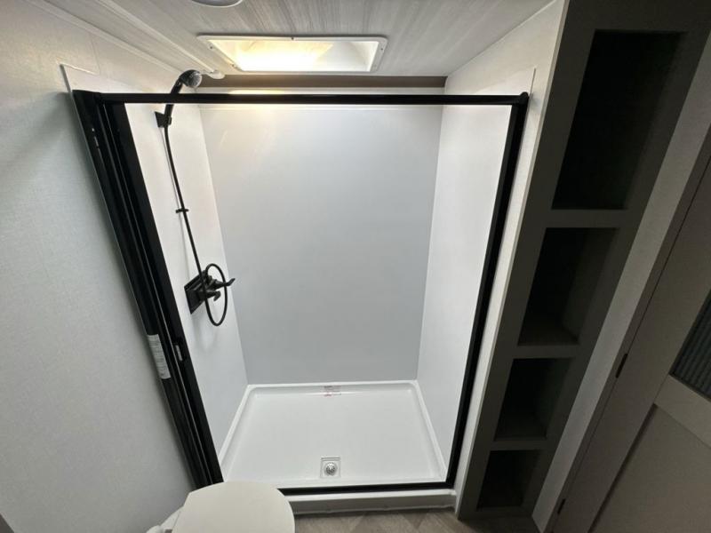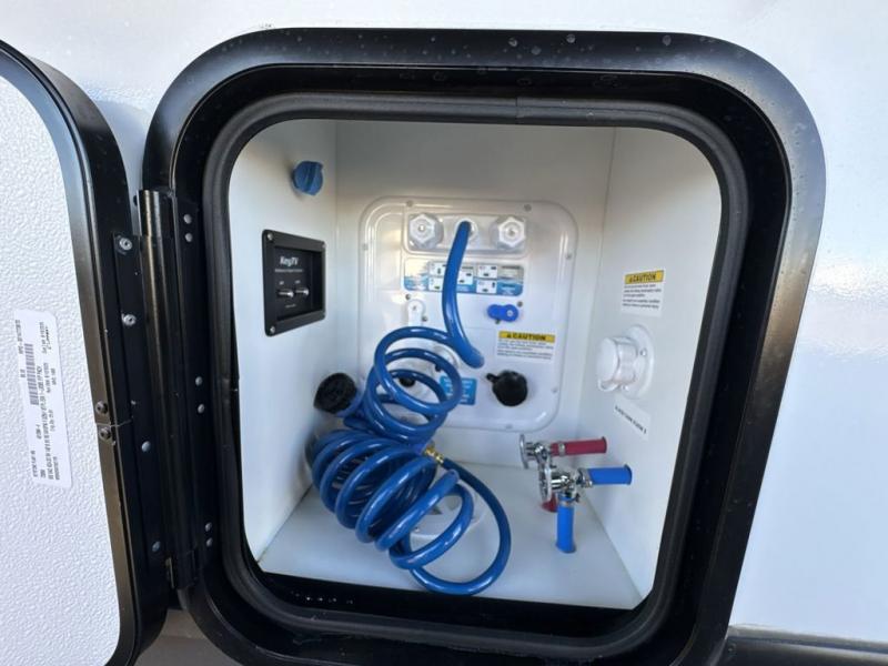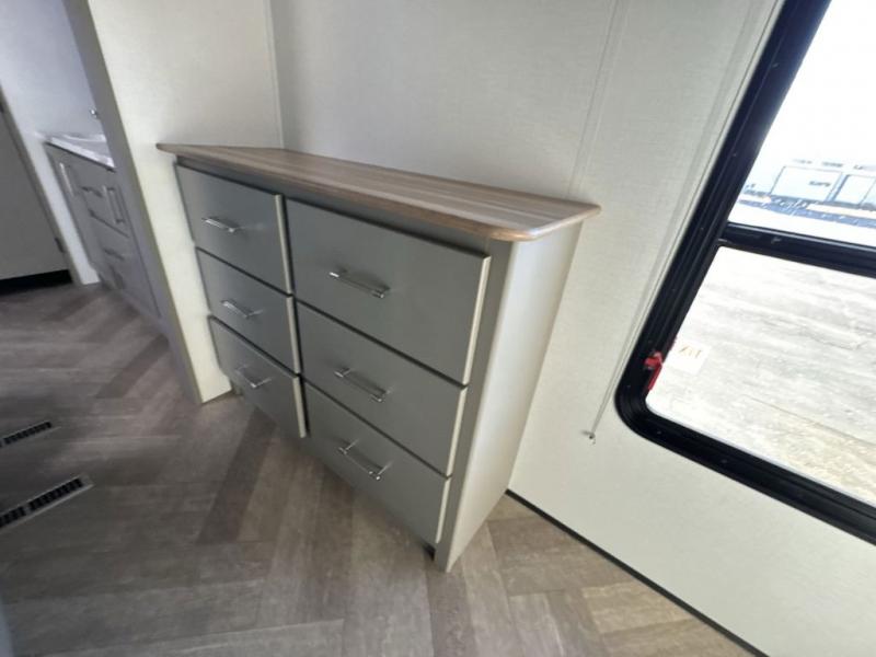The Sprinter fifth wheels by Keystone feature spacious living areas, plenty of storage, and outstanding towability. Each unit is constructed with 2" aluminum framed and laminated sidewalls, a fully walkable roof, and dual layer insulation to help extend your camping season. The heated pass-through storage includes lockable slam latch baggage doors so you can easily pack your gear, and the one-touch 4-point leveling system features return hookup memory to have you set up in no-time. Head inside to find Congoleum vinyl flooring, Thomas Payne luxury collection furniture, residential style seamless marbled countertops, and an upgraded bedspread to name a few comforts. The Sprinter also includes a Girard tankless on-demand water heater, a central command center, plus a 30k BTU furnace and two A/C units to ensure your comfort!