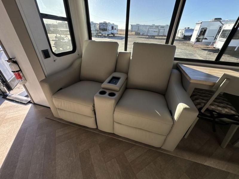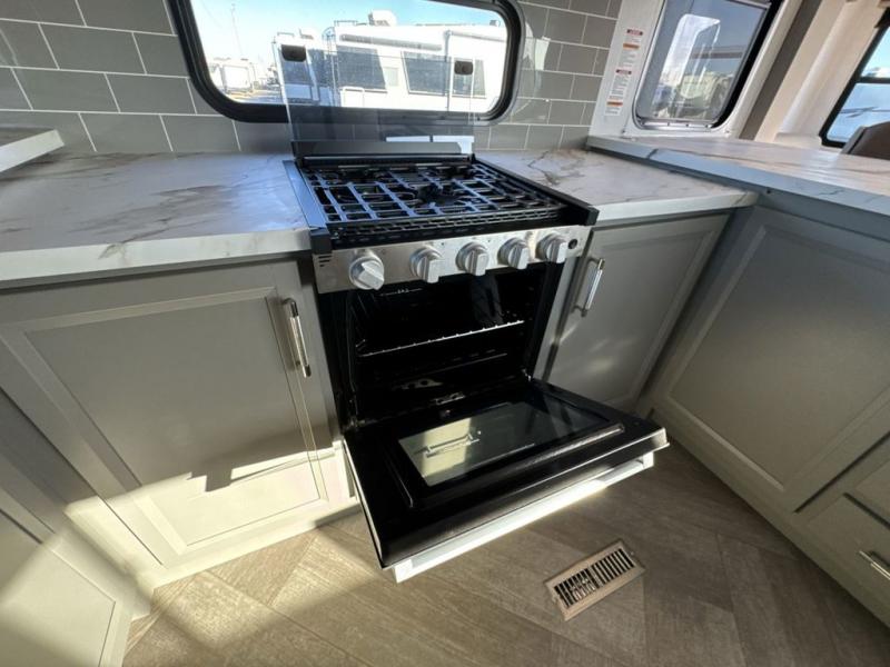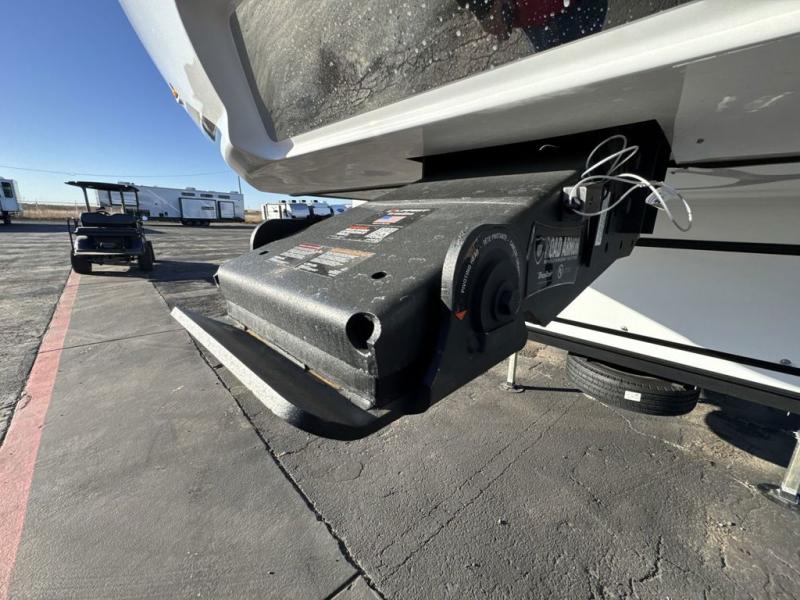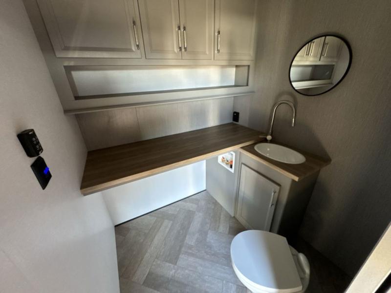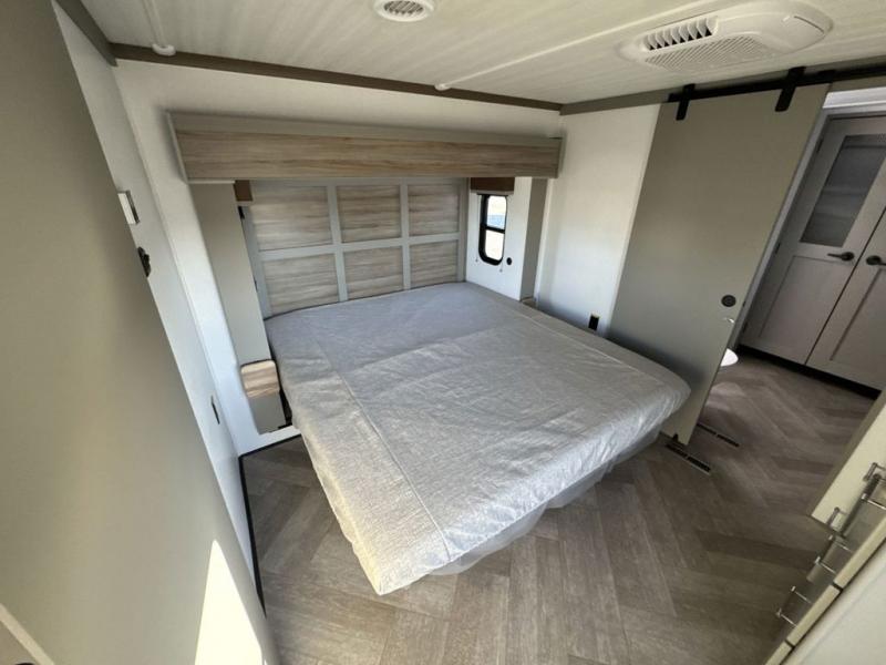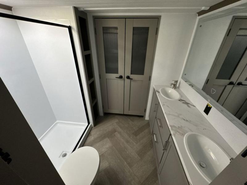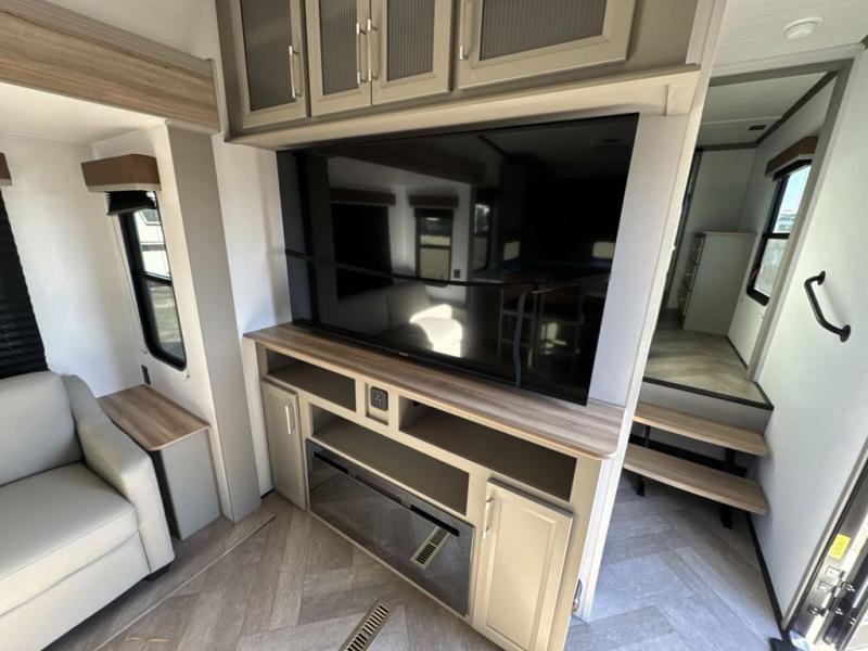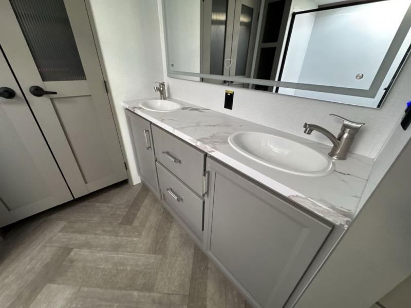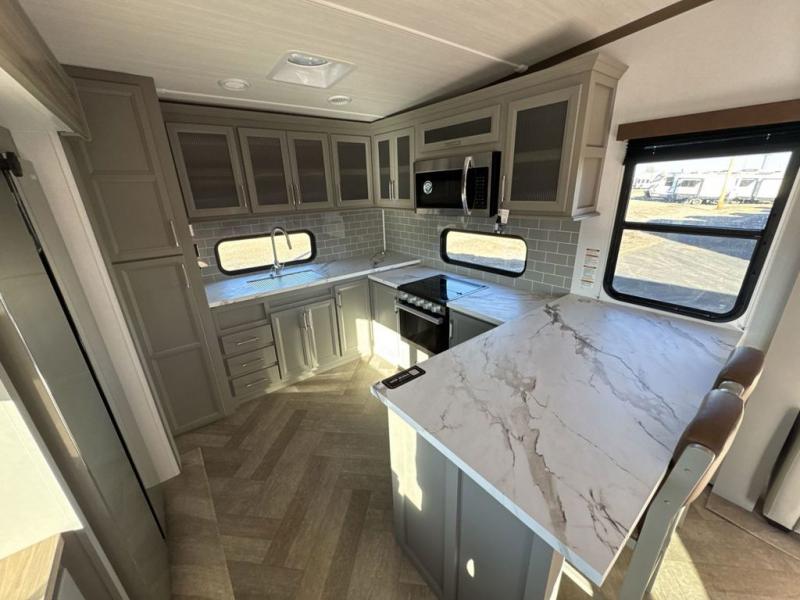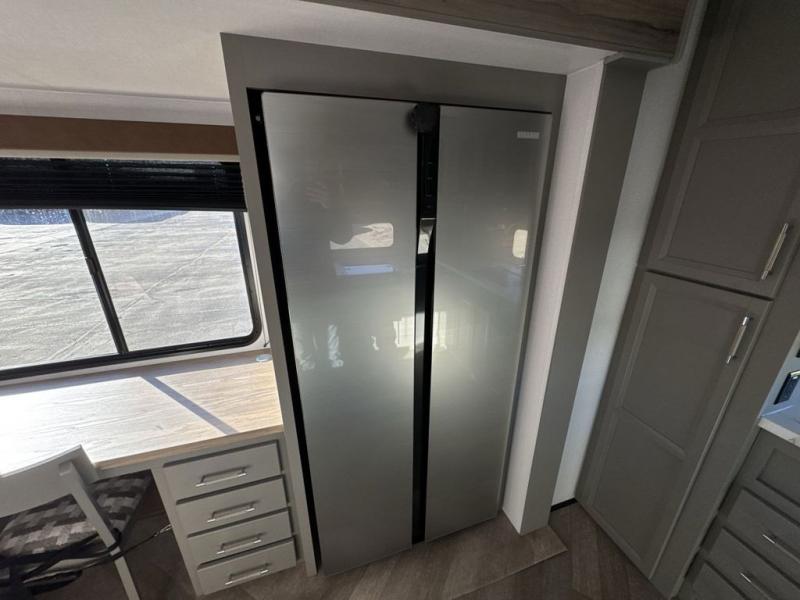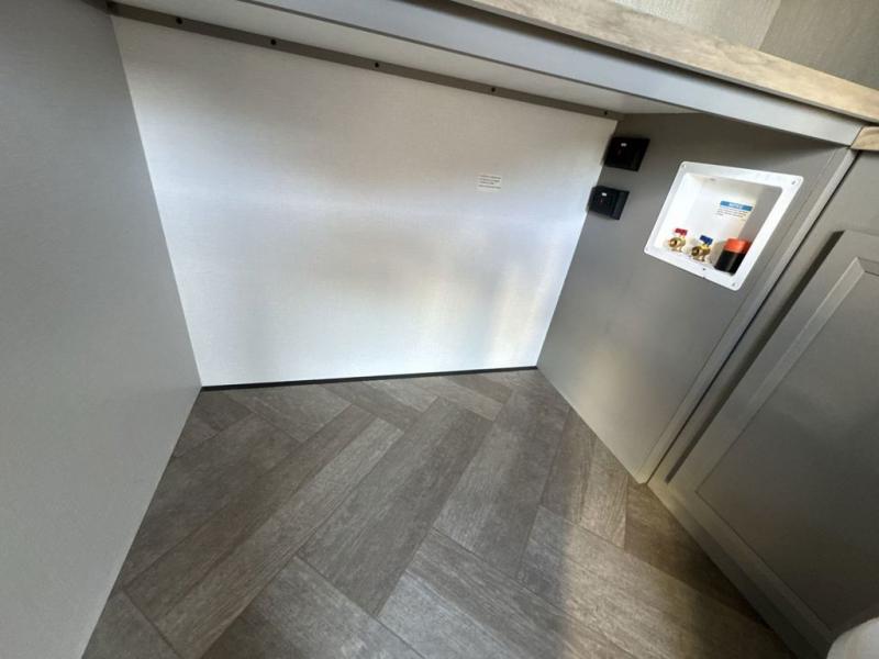 There is much to love about this fifth wheel! Starting with the front full bathroom which has a dual sink vanity for two to get ready at once and heading to the rear kitchen where you will have everything you need to prepare the best home cooked meals. There are also three bar stools at the bar top so guests can socialize with the cook. If you need to get a little work done while you're away, then you can easily get it done at the desk with chair next to the reclining theater seating and the 16 cu. ft. refrigerator for quick access to a snack break. The private bedroom has a king bed slide to lay your head on at night, and if you need an extra sleeping space then you can utilize the sofa slide too. Inside the half bathroom is a countertop with an area prepped for a washer and dryer to be added so you can enjoy clean clothes throughout your entire trip!