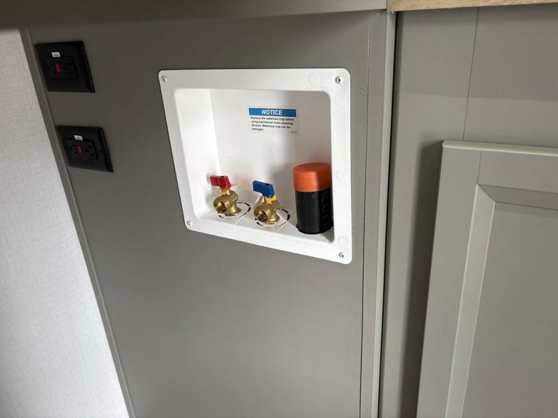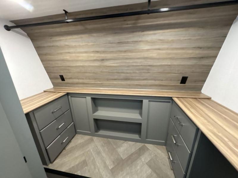 There is much to love about this fifth wheel! Starting with the front full bathroom which has a dual sink vanity for two to get ready at once and heading to the rear kitchen where you will have everything you need to prepare the best home cooked meals. There are also three bar stools at the bar top so guests can socialize with the cook. If you need to get a little work done while you're away, then you can easily get it done at the desk with chair next to the reclining theater seating and the 16 cu. ft. refrigerator for quick access to a snack break. The private bedroom has a king bed slide to lay your head on at night, and if you need an extra sleeping space then you can utilize the sofa slide too. Inside the half bathroom is a countertop with an area prepped for a washer and dryer to be added so you can enjoy clean clothes throughout your entire trip!