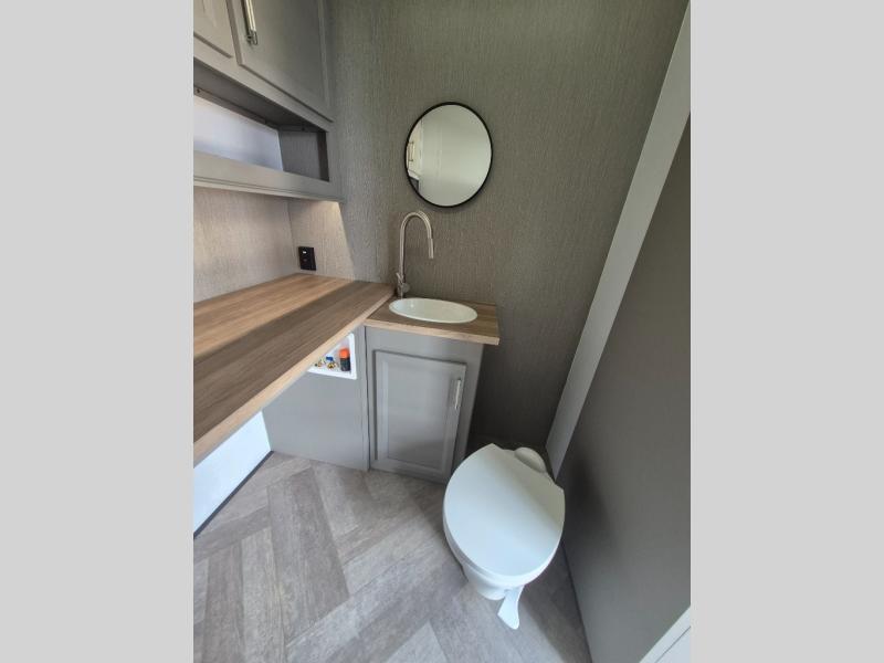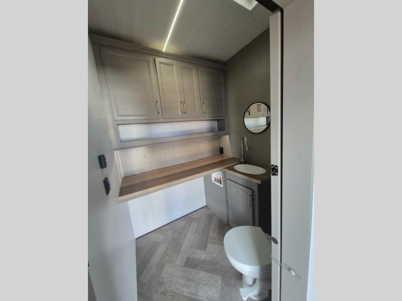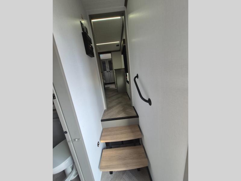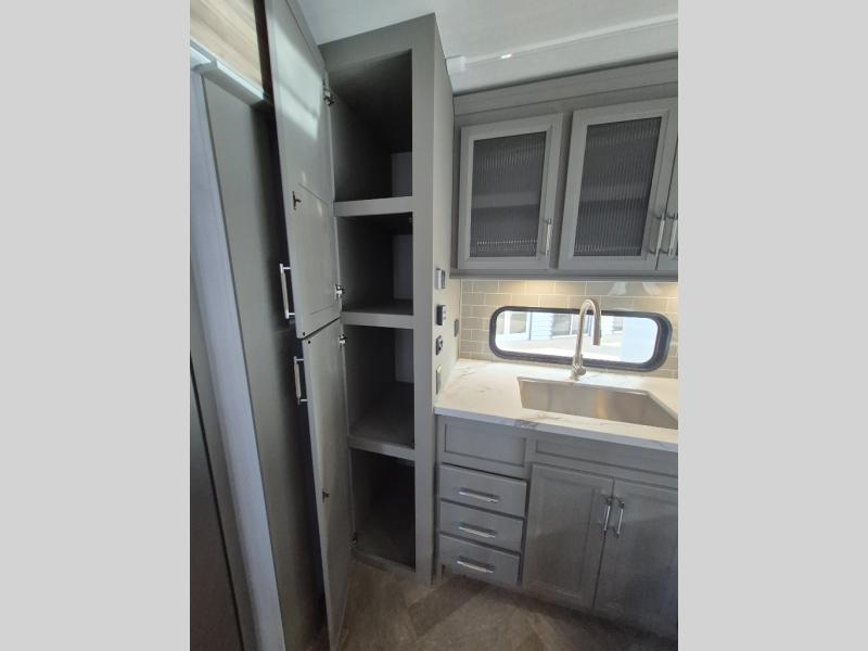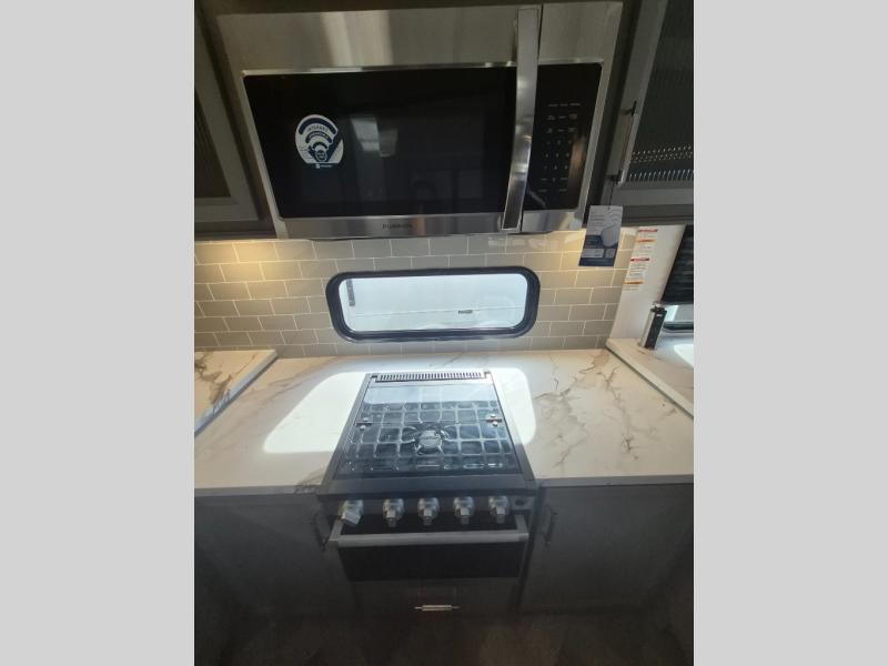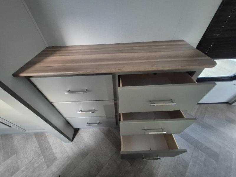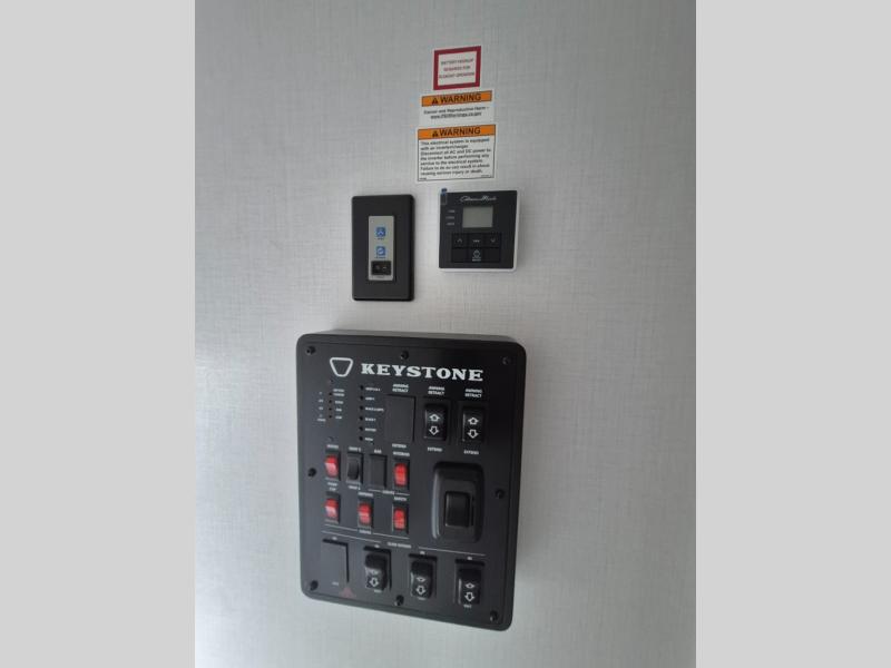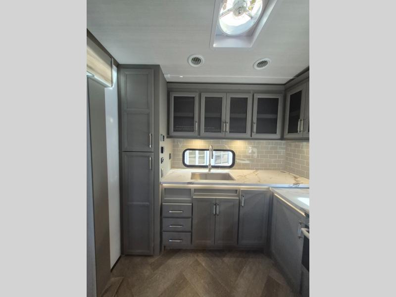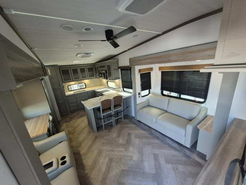 The Sprinter fifth wheels by Keystone feature spacious living areas, plenty of storage, and outstanding towability. Each unit is constructed with 2" thick double welded aluminum frame construction, a fully walkable roof and slide out roof, and dual layer insulation to help extend your camping season. The heated pass-through storage includes lockable slam latch baggage doors so you can easily pack your gear, and the one-touch 4-point leveling system features return hookup memory to have you set up in no-time. Head inside to find DynaSpan Marine Grade floor decking, Thomas Payne luxury collection furniture and residential style seamless marbled countertops to name a few comforts. The Sprinter also includes a Suburban tankless on-demand water heater, black out aluminum wheels, plus a 30k BTU furnace to ensure your comfort!