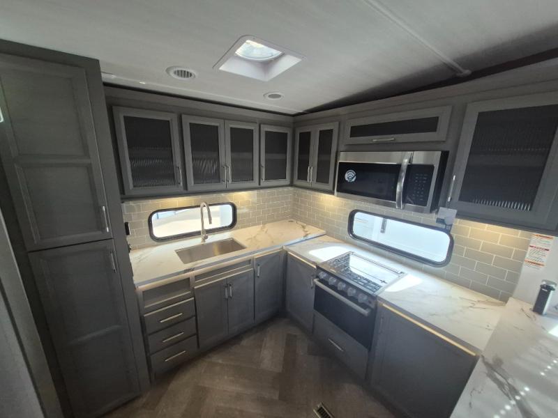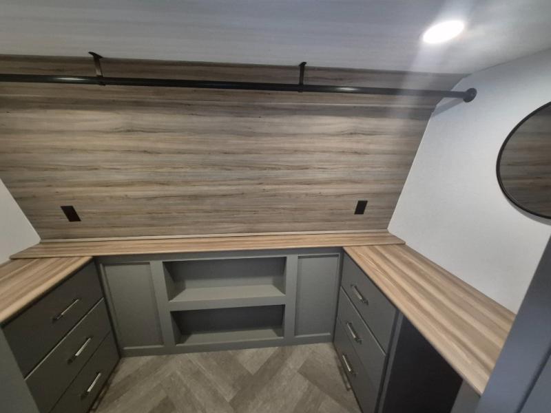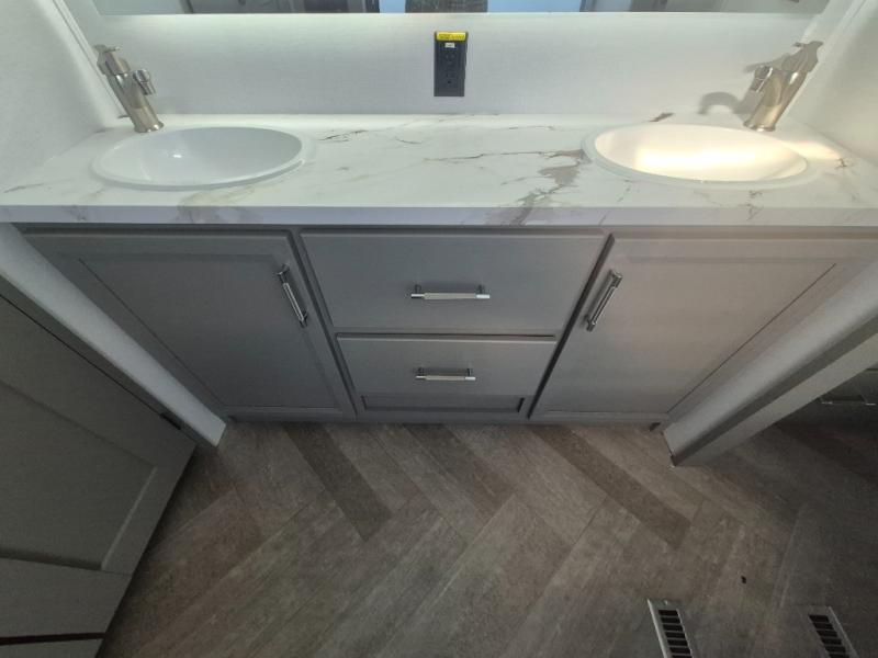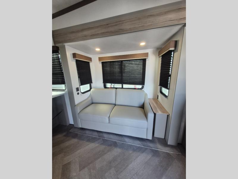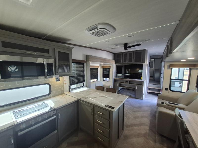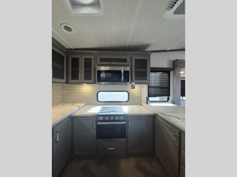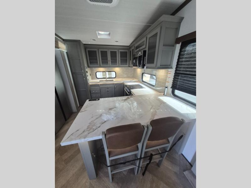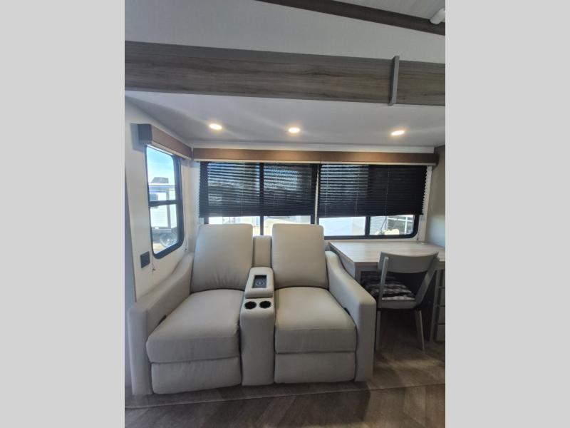 There is much to love about this fifth wheel! Starting with the front full bathroom which has a dual sink vanity for two to get ready at once and heading to the rear kitchen where you will have everything you need to prepare the best home cooked meals. There are also two bar stools at the bar top so guests can socialize with the cook. If you need to get a little work done while you're away, then you can easily get it done at the desk with chair next to the reclining theater seating and the 16 cu. ft. refrigerator for quick access to a snack break. The private bedroom has a king bed slide to lay your head on at night, and if you need an extra sleeping space then you can utilize the sofa slide too. Inside the half bathroom is a countertop with an area prepped for a washer and dryer to be added so you can enjoy clean clothes throughout your entire trip!