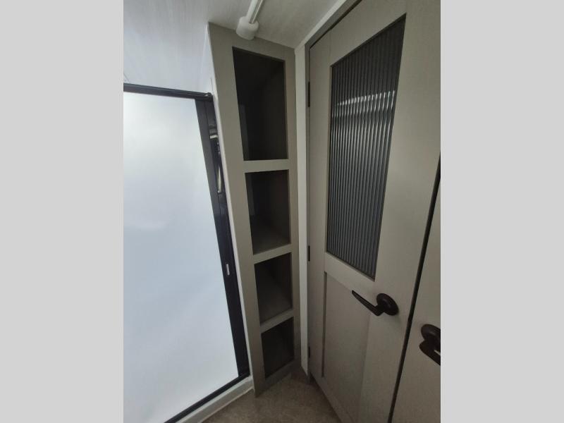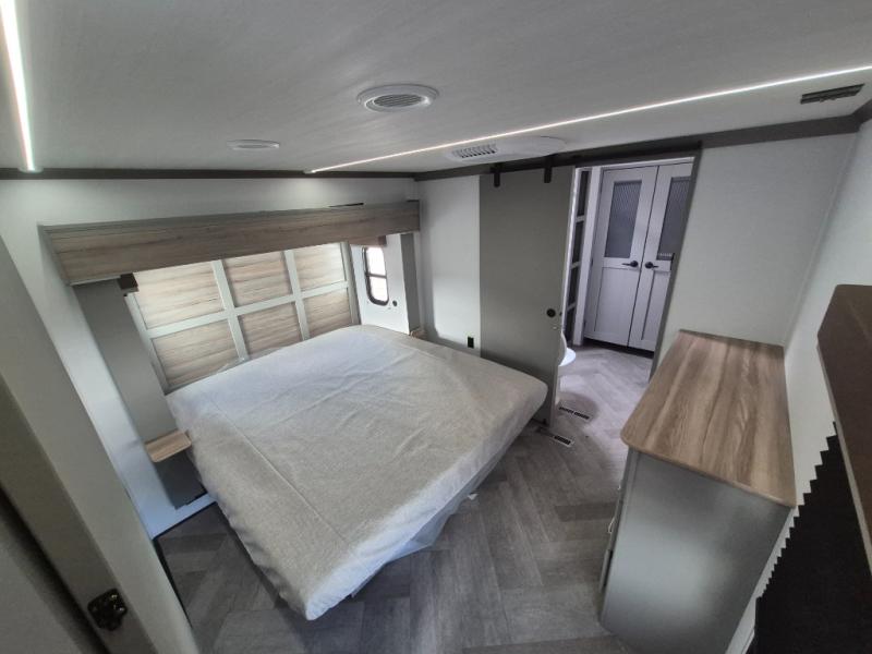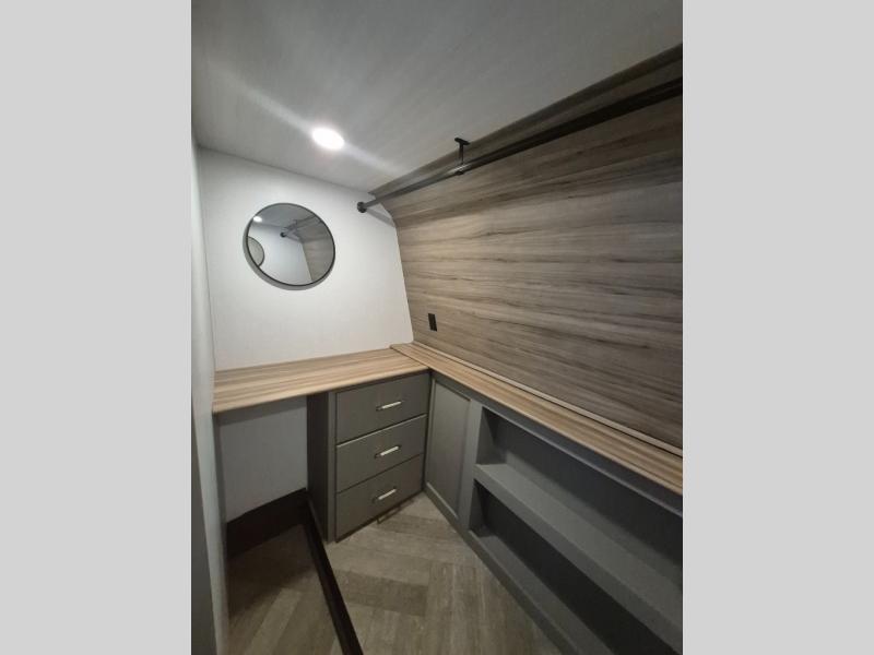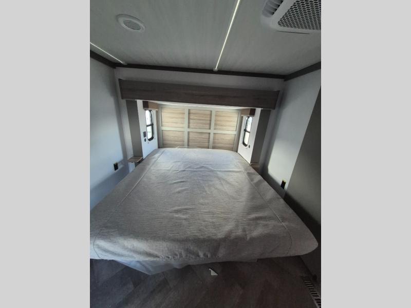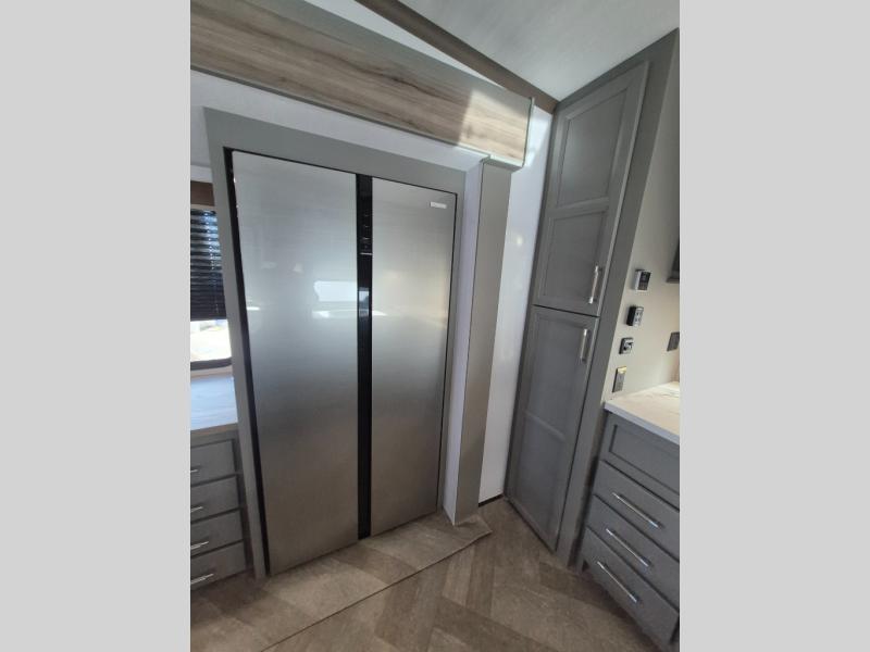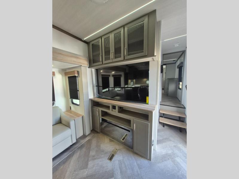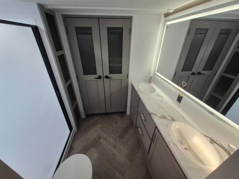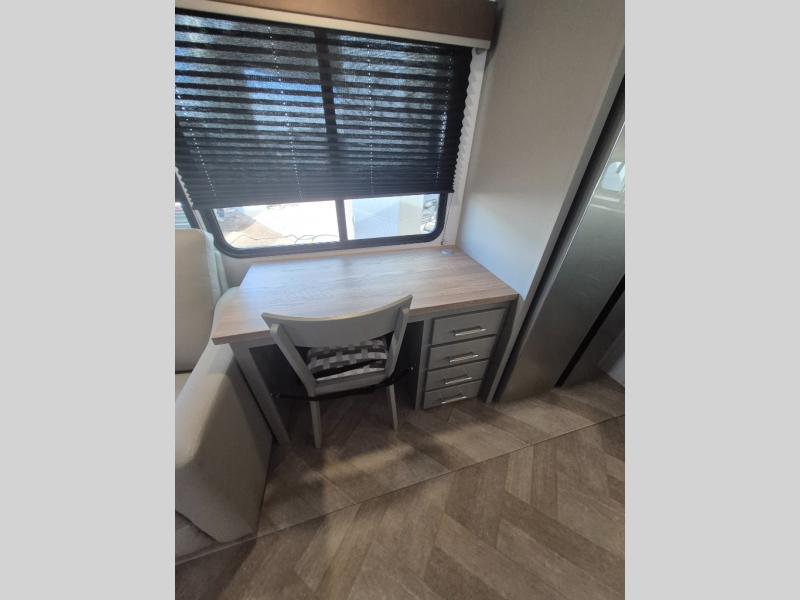 There is much to love about this fifth wheel! Starting with the front full bathroom which has a dual sink vanity for two to get ready at once and heading to the rear kitchen where you will have everything you need to prepare the best home cooked meals. There are also two bar stools at the bar top so guests can socialize with the cook. If you need to get a little work done while you're away, then you can easily get it done at the desk with chair next to the reclining theater seating and the 16 cu. ft. refrigerator for quick access to a snack break. The private bedroom has a king bed slide to lay your head on at night, and if you need an extra sleeping space then you can utilize the sofa slide too. Inside the half bathroom is a countertop with an area prepped for a washer and dryer to be added so you can enjoy clean clothes throughout your entire trip!
