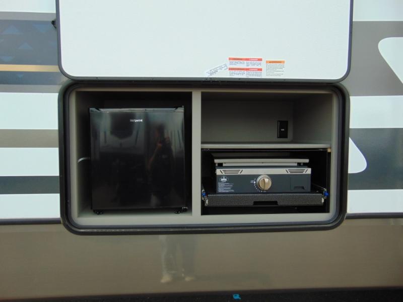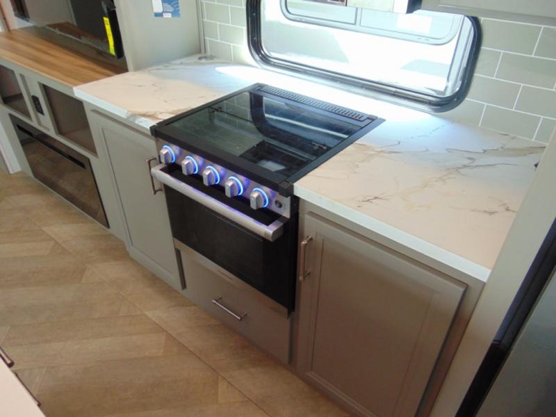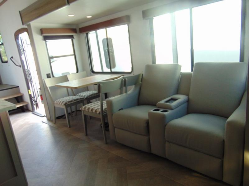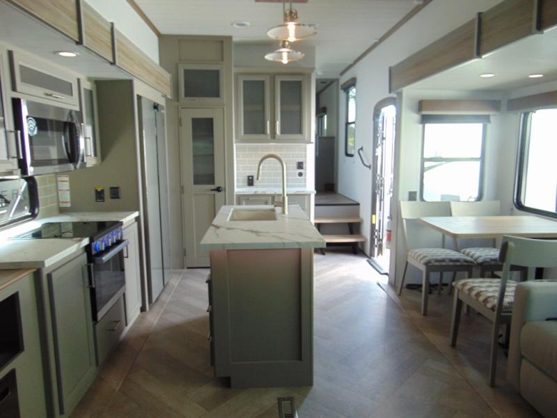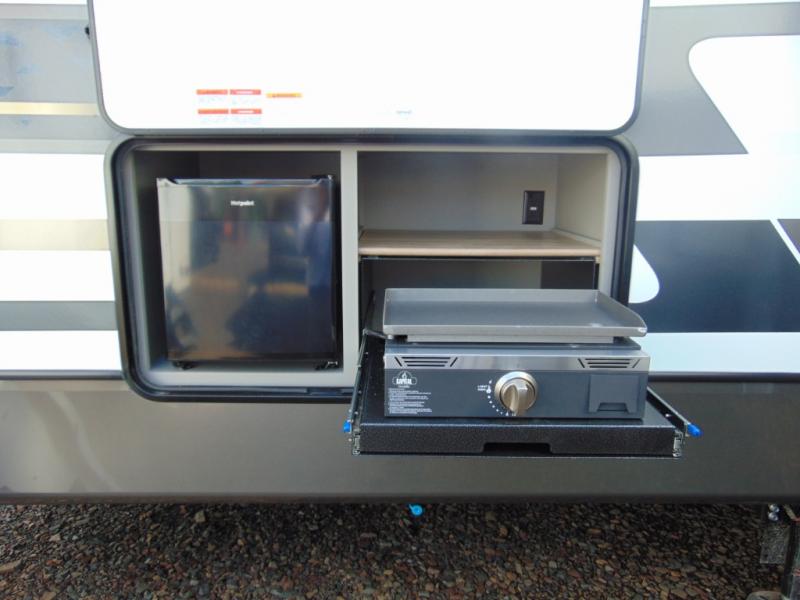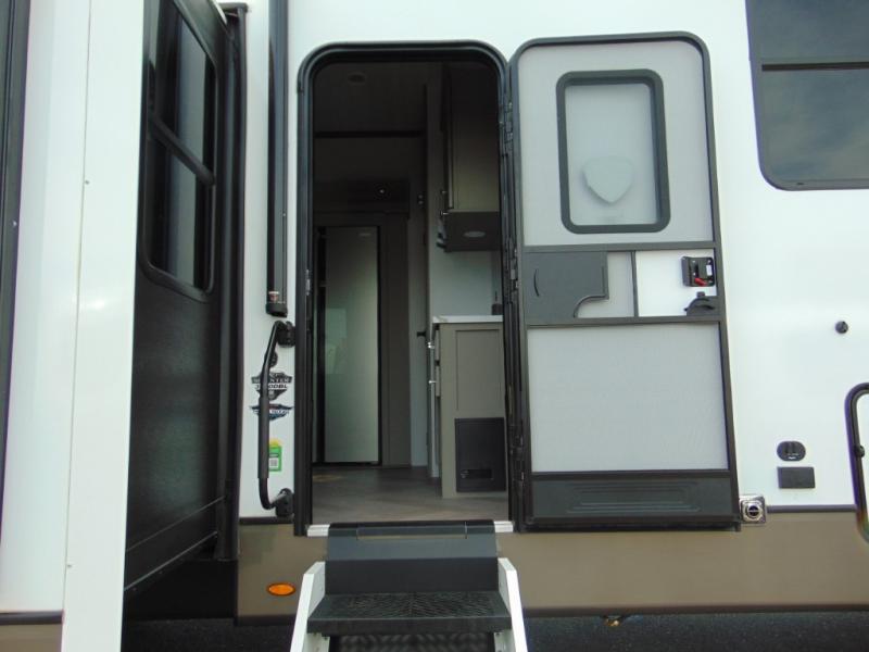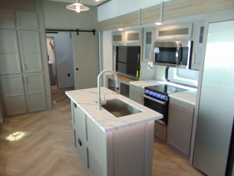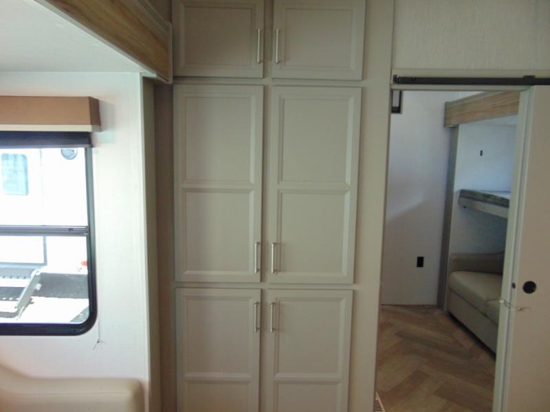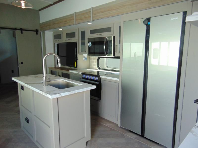 A great family bunkhouse fifth wheel featuring quad slides that really open this entire unit up to provide spacious living throughout. A booth dinette or optional free standing dinette is great for meals, and full reclining theater seating with massage, lights, and USB connectivity make movie night a real treat! The kids will love the rear bunkhouse with a separate bath and private entry for easy access when outside. There is even a loft area above for storage, so they can bring a few friends along as well. The kitchen has all of the features needed to allow you to cook and entertain when you want with a three burner range including a glass top, a 16 cu. ft. 12 volt refrigerator, pantry, hutch for dishes and things, plus a solid surface countertop on the center island that houses your sink. In the bedroom, a king bed slides out to offer more floor space to move about, plus you will find ample storage in the front wardrobe which has also been prepped for a washer and dryer if you choose to add. You can also add a TV in the bedroom since it has been prepped for one as well. And let's not forget the outside two burner cooktop and refrigerator!