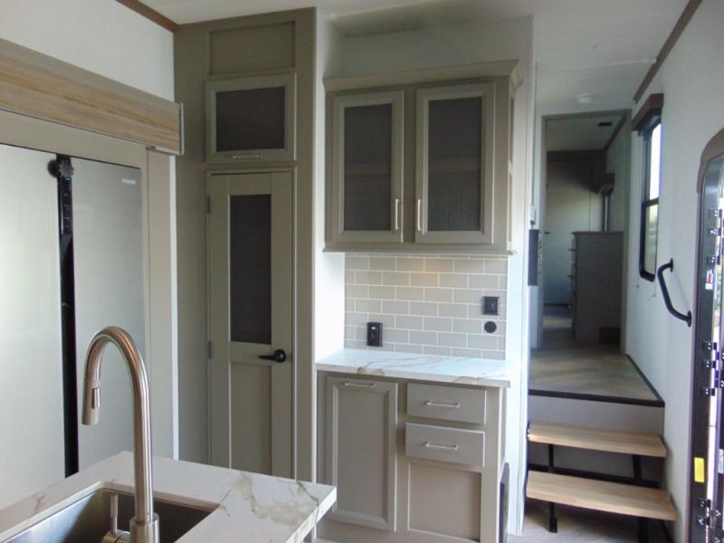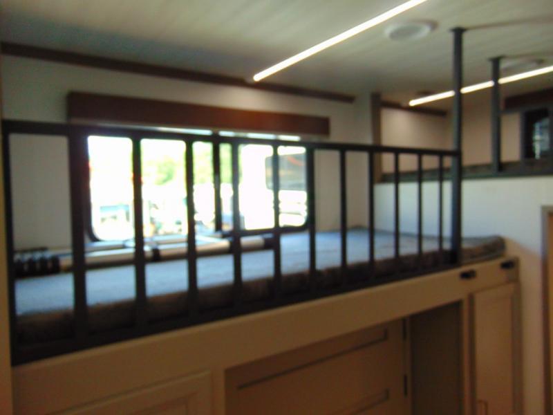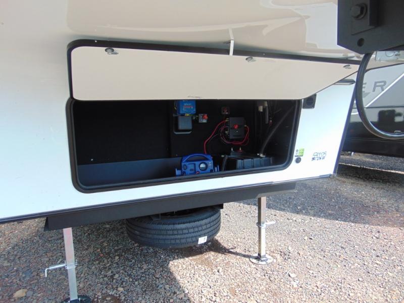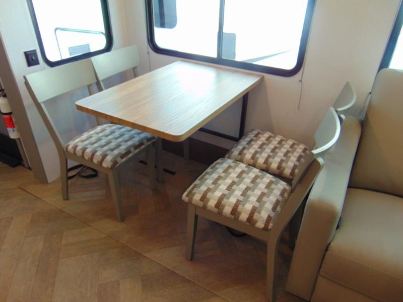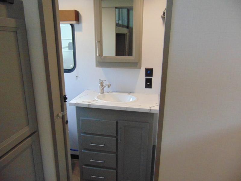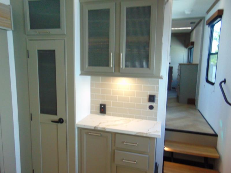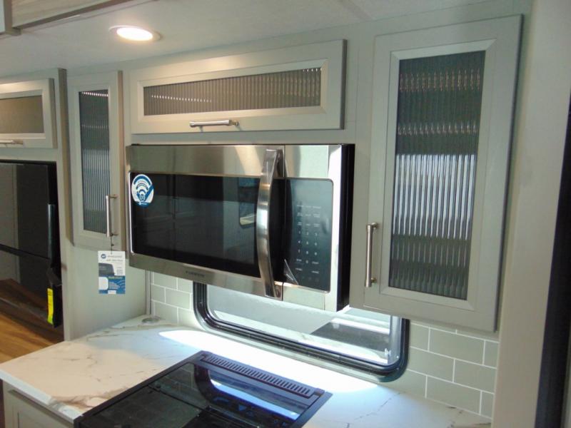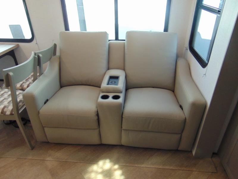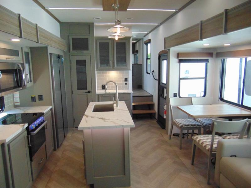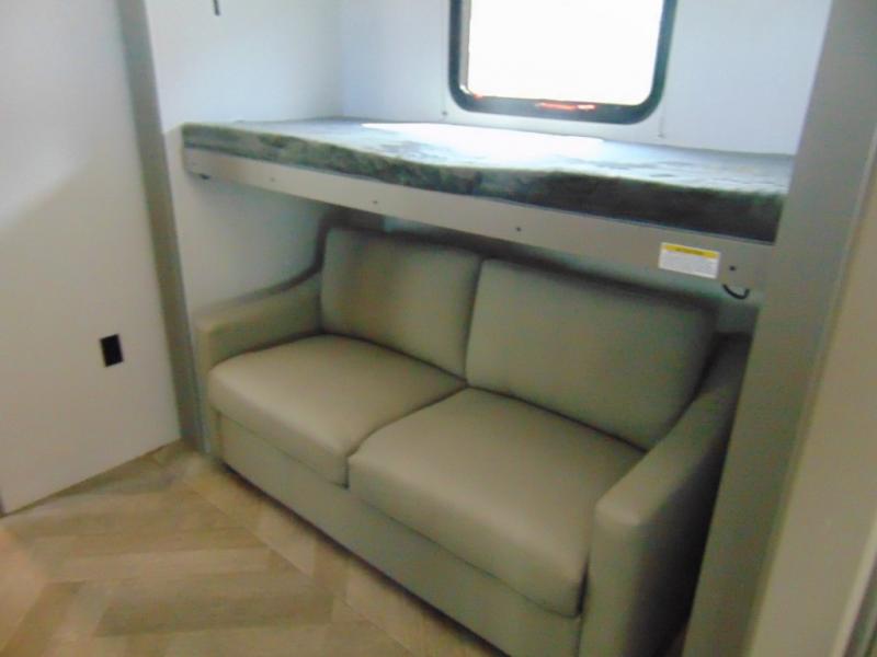 A great family bunkhouse fifth wheel featuring quad slides that really open this entire unit up to provide spacious living throughout. A booth dinette or optional free standing dinette is great for meals, and full reclining theater seating with massage, lights, and USB connectivity make movie night a real treat! The kids will love the rear bunkhouse with a separate bath and private entry for easy access when outside. There is even a loft area above for storage, so they can bring a few friends along as well. The kitchen has all of the features needed to allow you to cook and entertain when you want with a three burner range including a glass top, a 16 cu. ft. 12 volt refrigerator, pantry, hutch for dishes and things, plus a solid surface countertop on the center island that houses your sink. In the bedroom, a king bed slides out to offer more floor space to move about, plus you will find ample storage in the front wardrobe which has also been prepped for a washer and dryer if you choose to add. You can also add a TV in the bedroom since it has been prepped for one as well. And let's not forget the outside two burner cooktop and refrigerator!