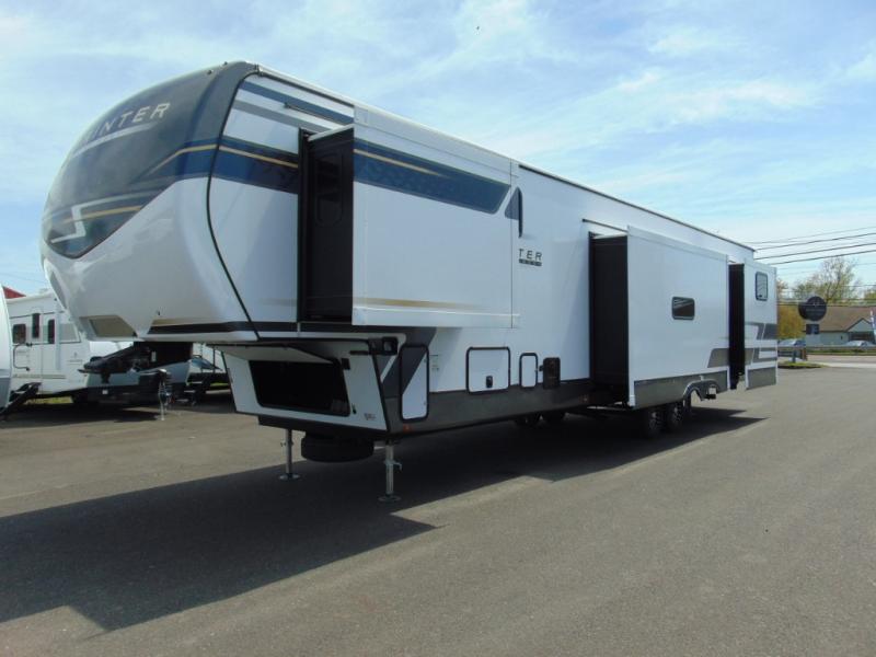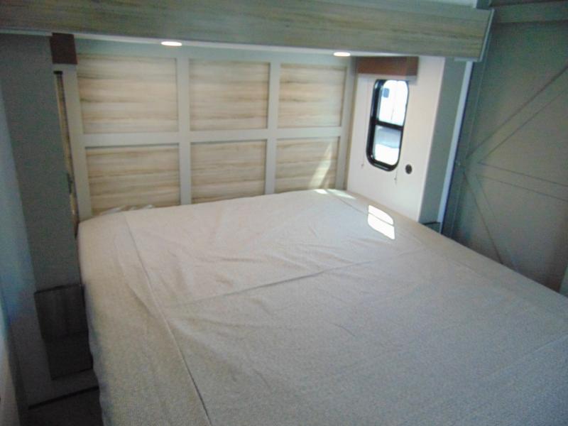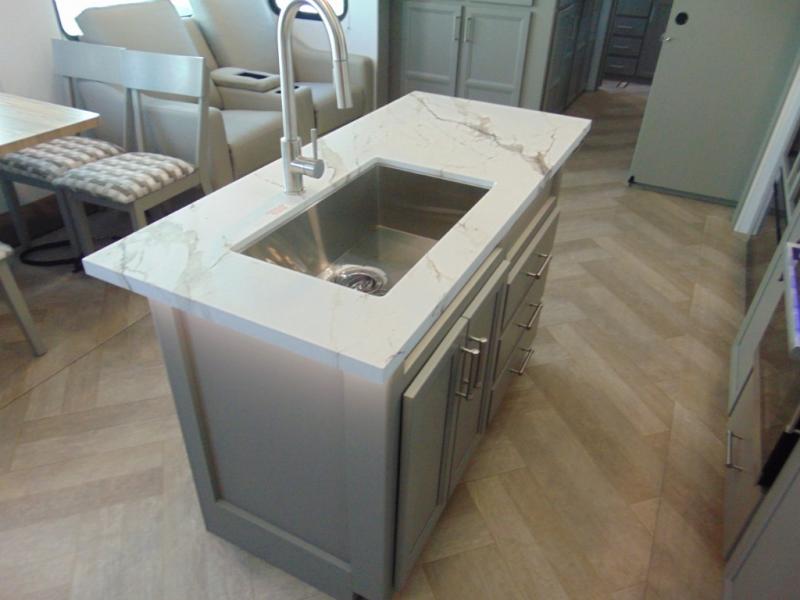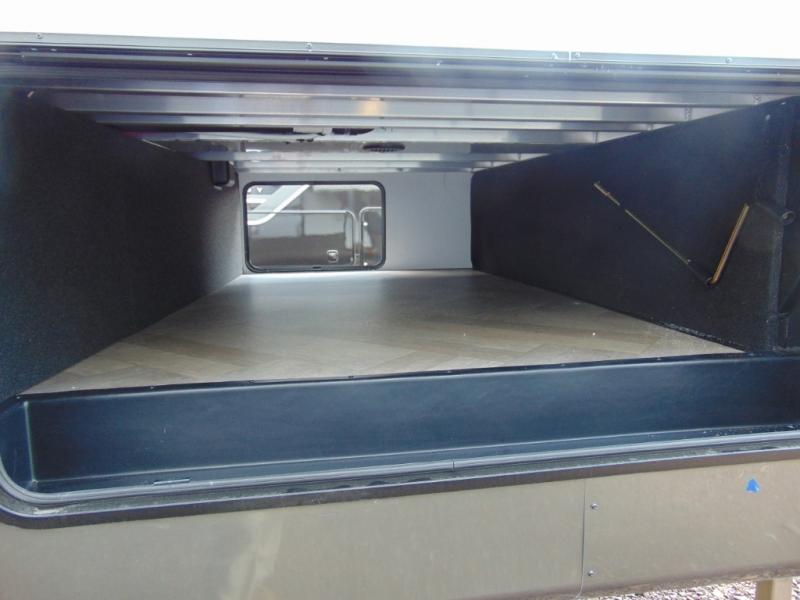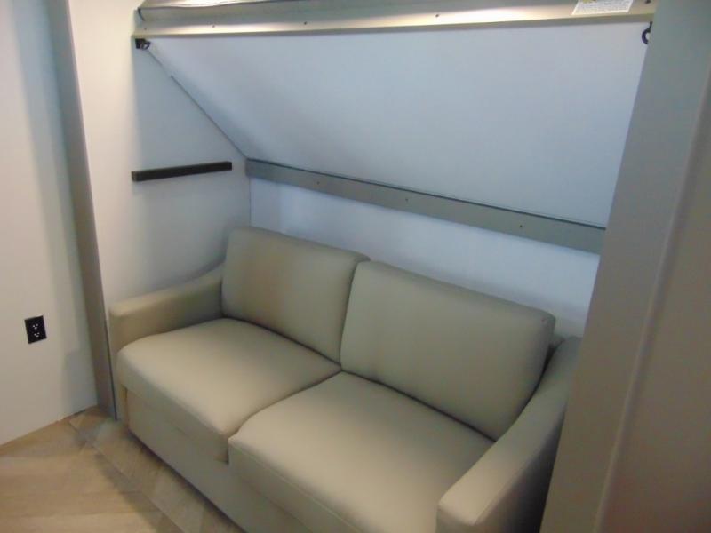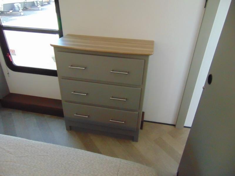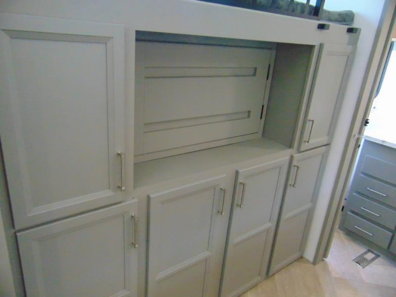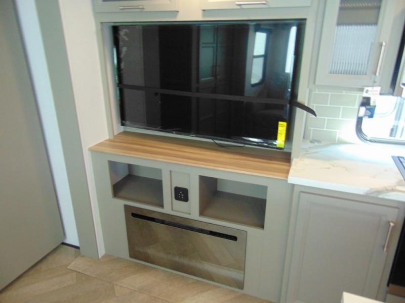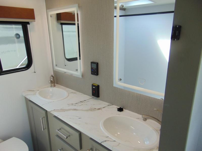 A great family bunkhouse fifth wheel featuring quad slides that really open this entire unit up to provide spacious living throughout. A booth dinette or optional free standing dinette is great for meals, and full reclining theater seating with massage, lights, and USB connectivity make movie night a real treat! The kids will love the rear bunkhouse with a separate bath and private entry for easy access when outside. There is even a loft area above for storage, so they can bring a few friends along as well. The kitchen has all of the features needed to allow you to cook and entertain when you want with a three burner range including a glass top, a 16 cu. ft. 12 volt refrigerator, pantry, hutch for dishes and things, plus a solid surface countertop on the center island that houses your sink. In the bedroom, a king bed slides out to offer more floor space to move about, plus you will find ample storage in the front wardrobe which has also been prepped for a washer and dryer if you choose to add. You can also add a TV in the bedroom since it has been prepped for one as well. And let's not forget the outside two burner cooktop and refrigerator!