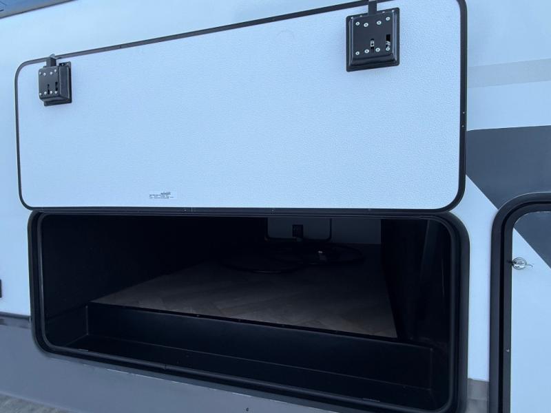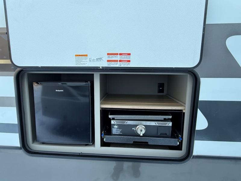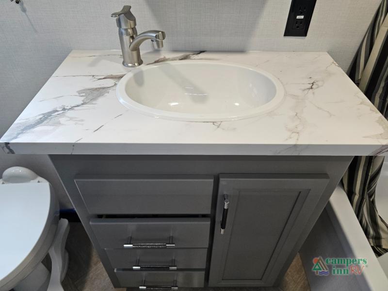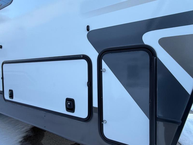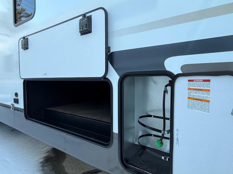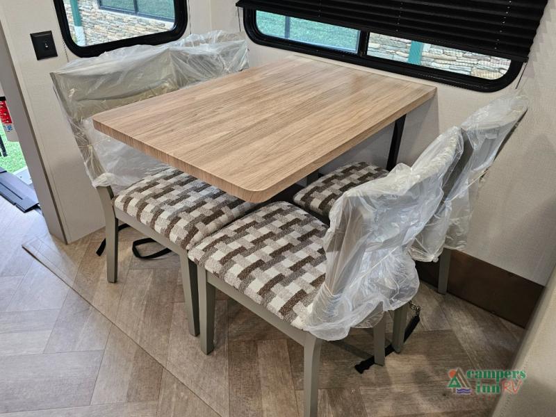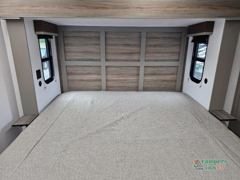 The Sprinter fifth wheels by Keystone feature spacious living areas, plenty of storage, and outstanding towability. Each unit is constructed with 2" aluminum framed and laminated sidewalls, a fully walkable roof, and dual layer insulation to help extend your camping season. The heated pass-through storage includes lockable slam latch baggage doors so you can easily pack your gear, and the one-touch 4-point leveling system features return hookup memory to have you set up in no-time. Head inside to find Congoleum vinyl flooring, Thomas Payne luxury collection furniture, residential style seamless marbled countertops, and an upgraded bedspread to name a few comforts. The Sprinter also includes a Girard tankless on-demand water heater, a central command center, plus a 30k BTU furnace and two A/C units to ensure your comfort!