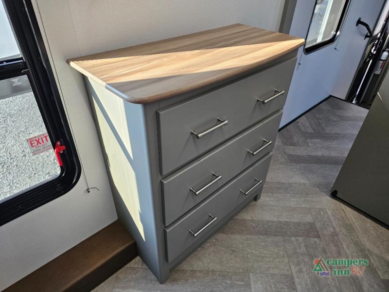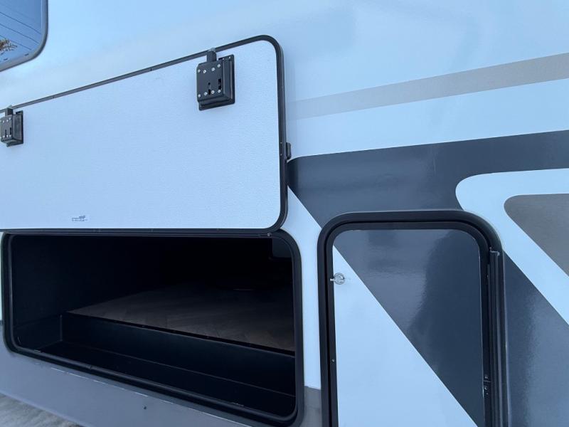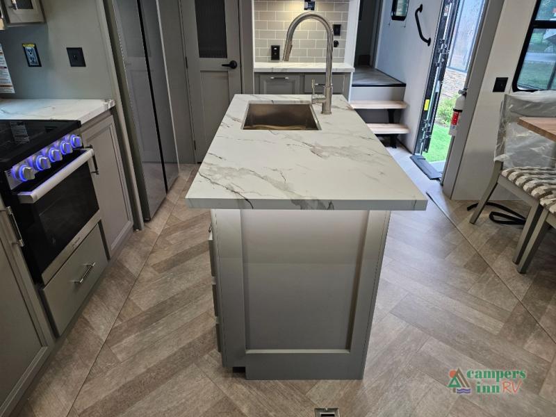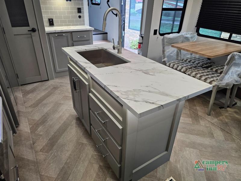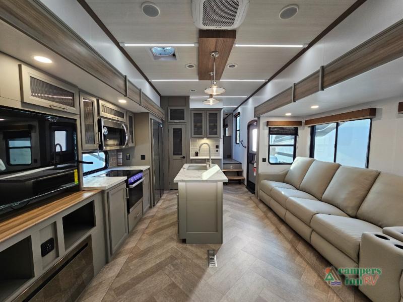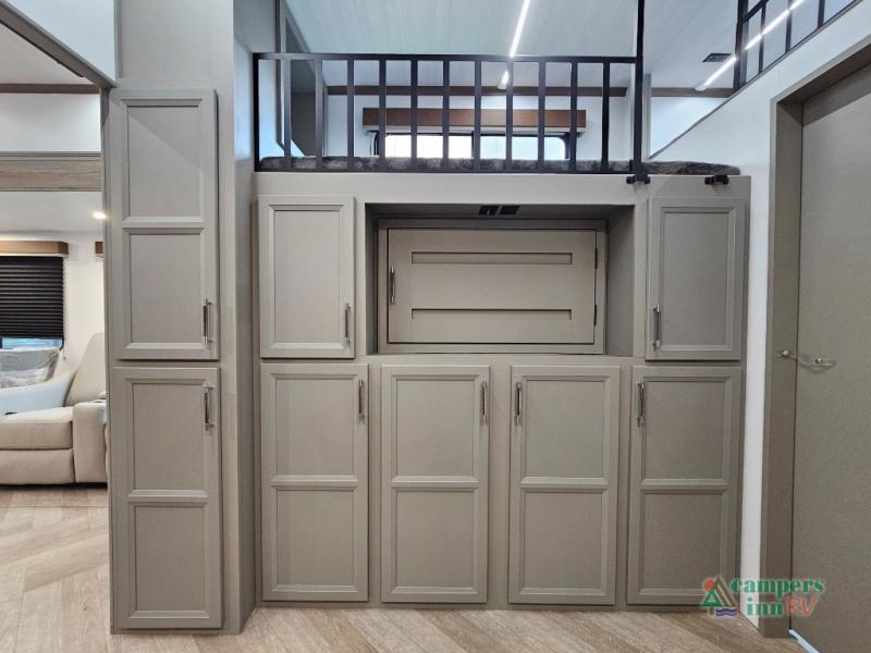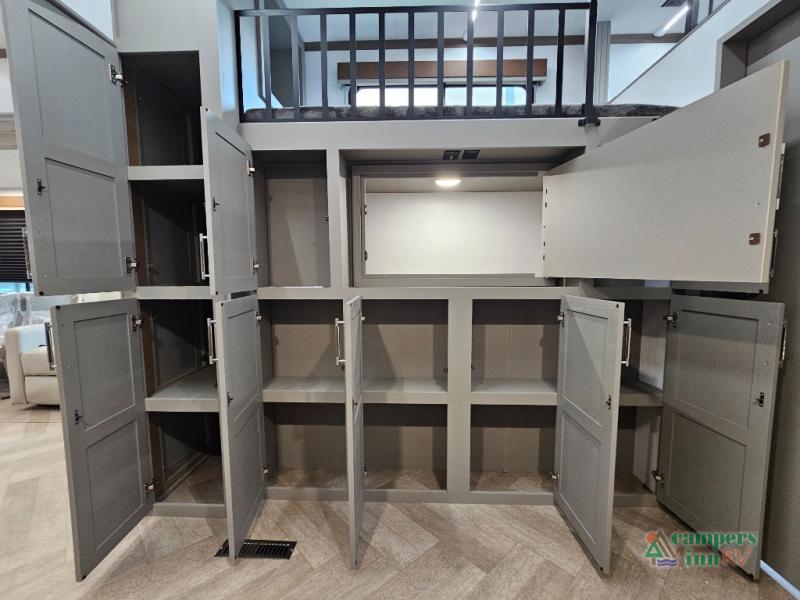 A great family bunkhouse fifth wheel featuring quad slides that really open this entire unit up to provide spacious living throughout. A booth dinette or optional free standing dinette is great for meals, and full reclining theater seating with massage, lights, and USB connectivity make movie night a real treat! The kids will love the rear bunkhouse with a separate bath and private entry for easy access when outside. There is even a loft area above for storage, so they can bring a few friends along as well. The kitchen has all of the features needed to allow you to cook and entertain when you want with a three burner range including a glass top, a 16 cu. ft. 12 volt refrigerator, pantry, hutch for dishes and things, plus a solid surface countertop on the center island that houses your sink. In the bedroom, a king bed slides out to offer more floor space to move about, plus you will find ample storage in the front wardrobe which has also been prepped for a washer and dryer if you choose to add. You can also add a TV in the bedroom since it has been prepped for one as well. And let's not forget the outside two burner cooktop and refrigerator!