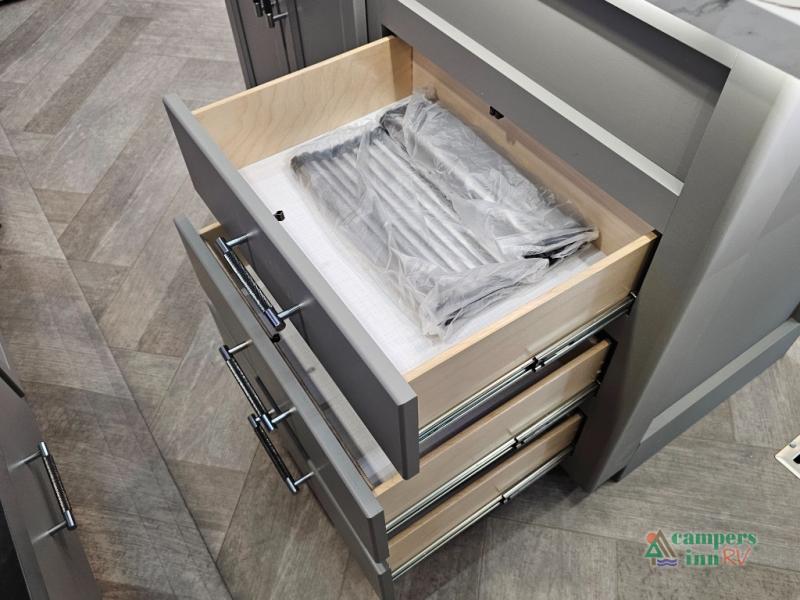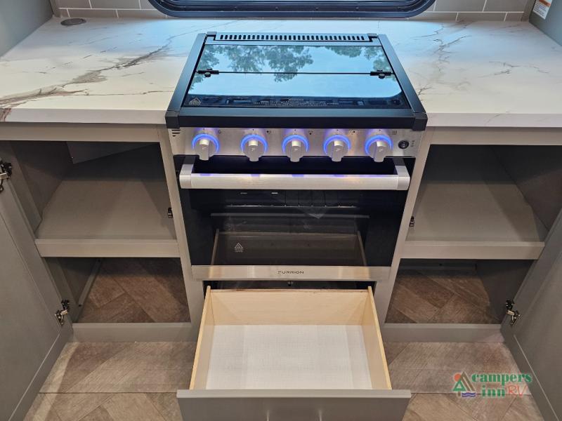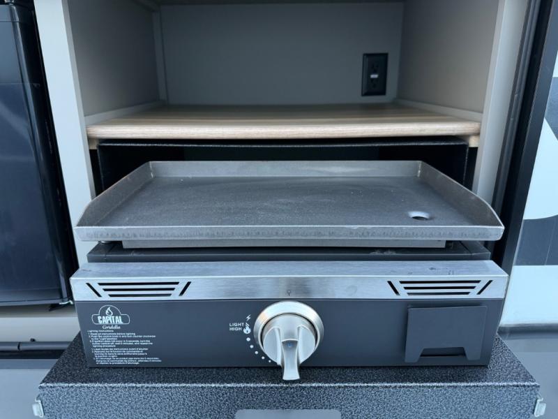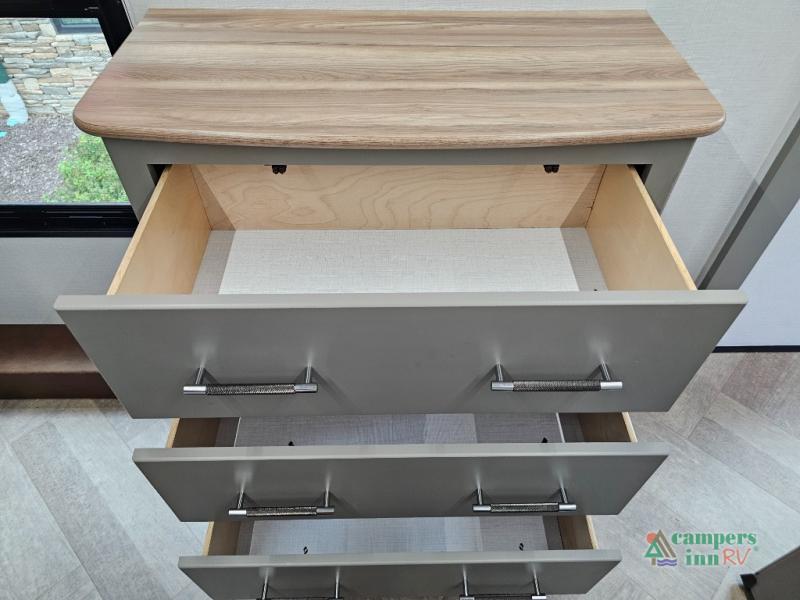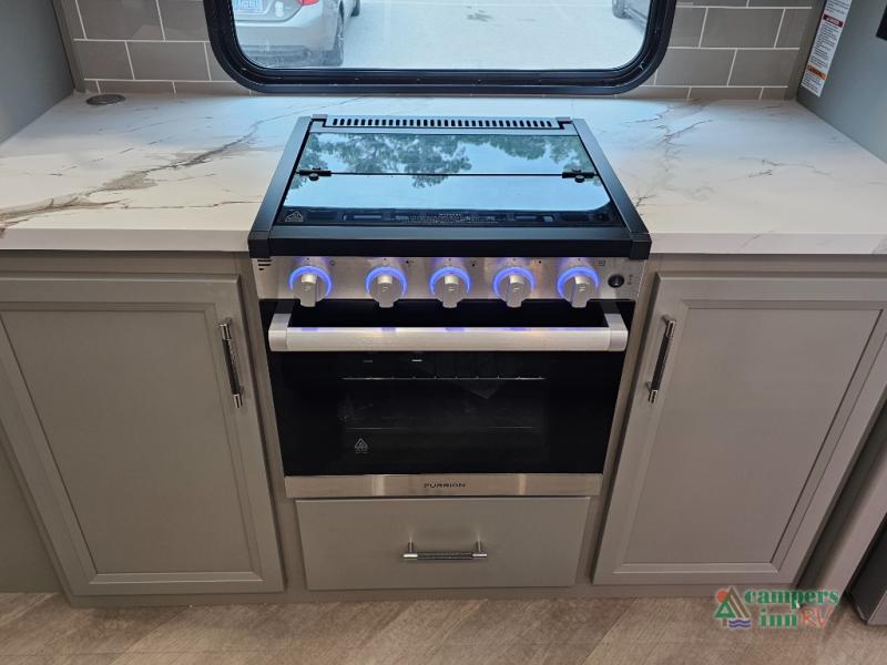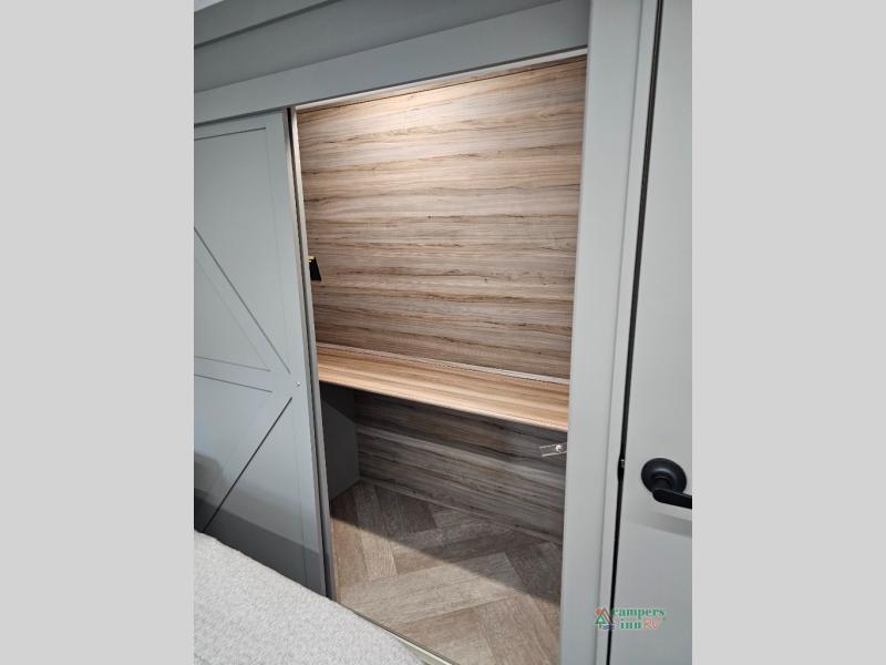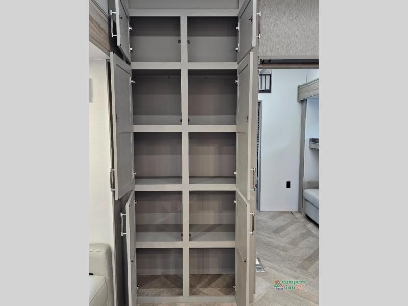 A great family bunkhouse fifth wheel featuring quad slides that really open this entire unit up to provide spacious living throughout. A booth dinette or optional free standing dinette is great for meals, and full reclining theater seating with massage, lights, and USB connectivity make movie night a real treat! The kids will love the rear bunkhouse with a separate bath and private entry for easy access when outside. There is even a loft area above for storage, so they can bring a few friends along as well. The kitchen has all of the features needed to allow you to cook and entertain when you want with a three burner range including a glass top, a 16 cu. ft. 12 volt refrigerator, pantry, hutch for dishes and things, plus a solid surface countertop on the center island that houses your sink. In the bedroom, a king bed slides out to offer more floor space to move about, plus you will find ample storage in the front wardrobe which has also been prepped for a washer and dryer if you choose to add. You can also add a TV in the bedroom since it has been prepped for one as well. And let's not forget the outside two burner cooktop and refrigerator!