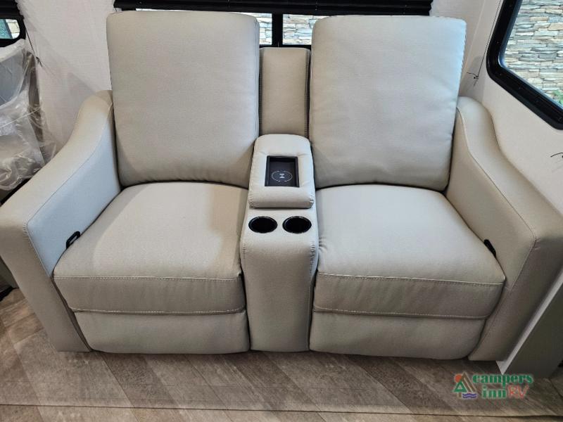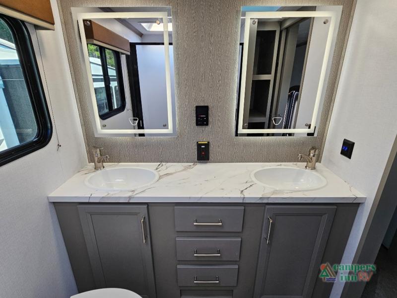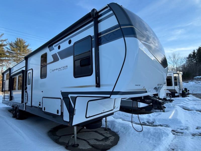 The Sprinter 3900DBL is a grand, family-focused fifth-wheel with four slides offering expansive living space. It comfortably sleeps up to 9–10 with a front master suite featuring a king slide, a rear bunkhouse with two bunks and a loft, and—unusually—two full bathrooms for added convenience. Highlights include a massive kitchen island with solid-surface counter, 16?cu?ft 12-volt fridge, washer/dryer prep, theater-style seating with massage and USB ports, electric fireplace, and plenty of storage throughout. It features exterior conveniences like dual-entry doors, premium outdoor kitchen, three awnings, auto-leveling, Girard tankless water heater, and dual A/Cs—making it ideal for multi-family road trips and long stays