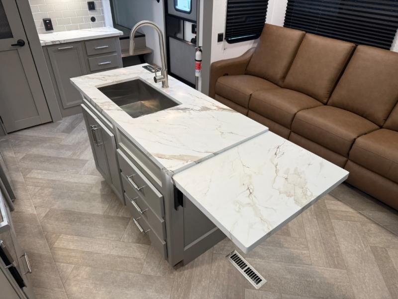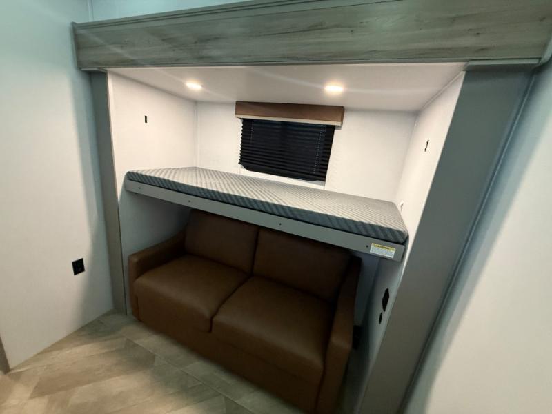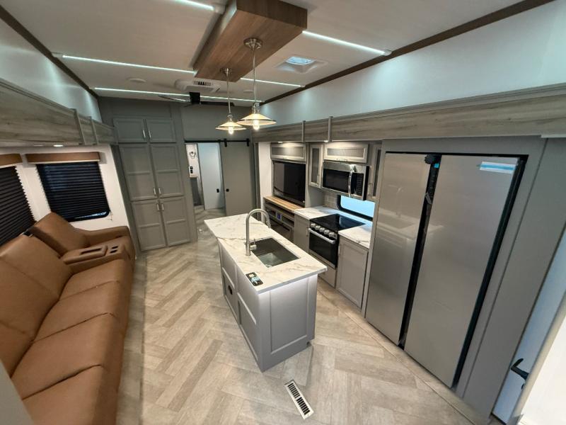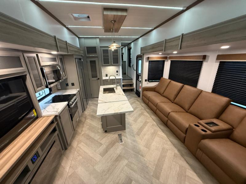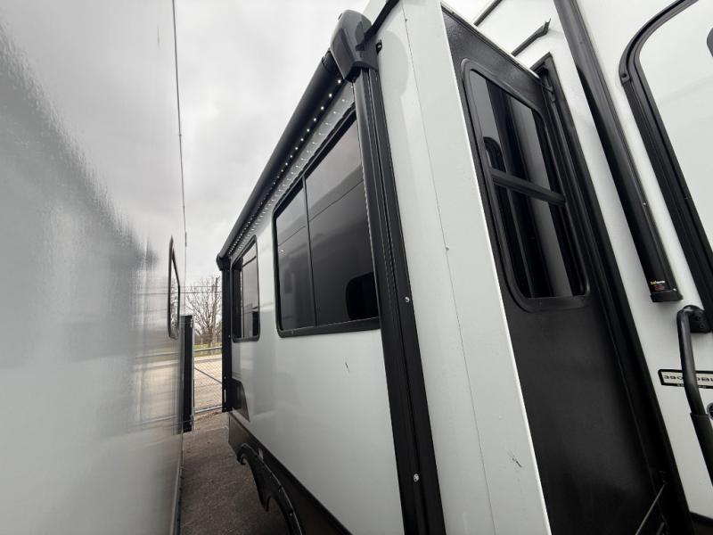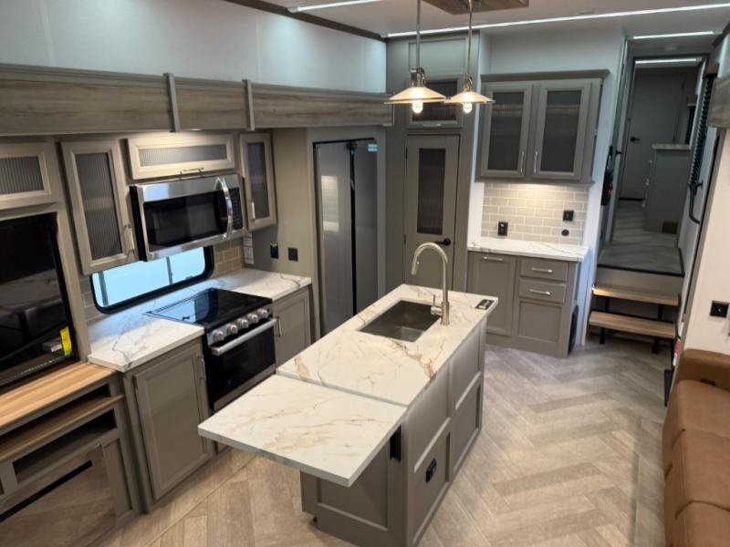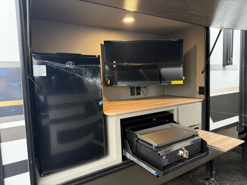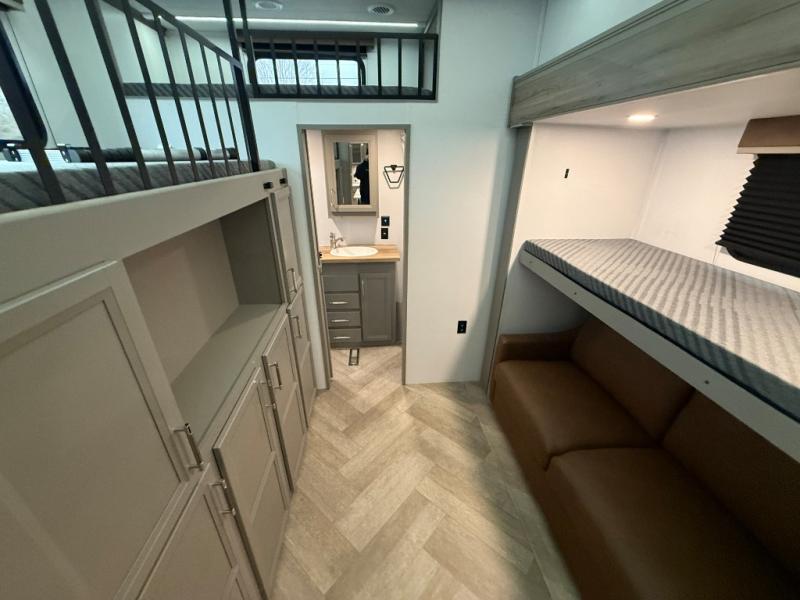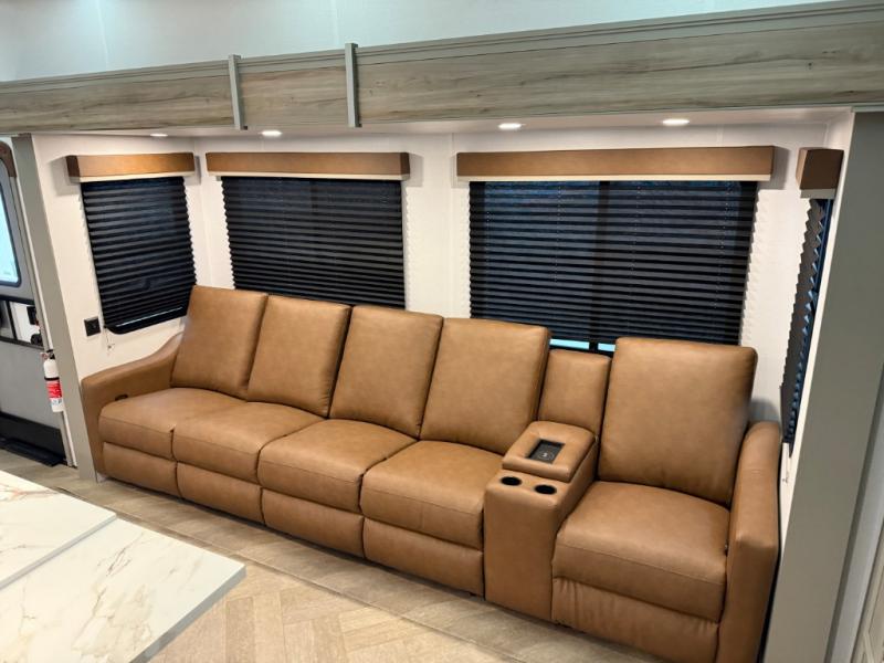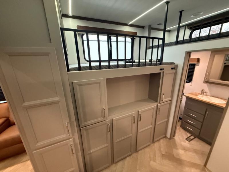 A great family bunkhouse fifth wheel featuring quad slides that really open this entire unit up to provide spacious living throughout. A booth dinette or optional free standing dinette is great for meals, and full reclining theater seating with massage, lights, and USB connectivity make movie night a real treat! The kids will love the rear bunkhouse with a separate bath and private entry for easy access when outside. There is even a loft area above for storage, so they can bring a few friends along as well. The kitchen has all of the features needed to allow you to cook and entertain when you want with a three burner range including a glass top, a 16 cu. ft. 12 volt refrigerator, pantry, hutch for dishes and things, plus a solid surface countertop on the center island that houses your sink. In the bedroom, a king bed slides out to offer more floor space to move about, plus you will find ample storage in the front wardrobe which has also been prepped for a washer and dryer if you choose to add. You can also add a TV in the bedroom since it has been prepped for one as well. And let's not forget the outside two burner cooktop and refrigerator!