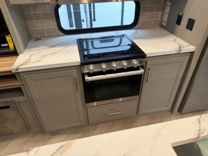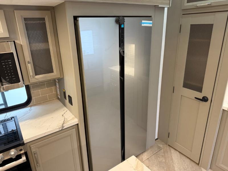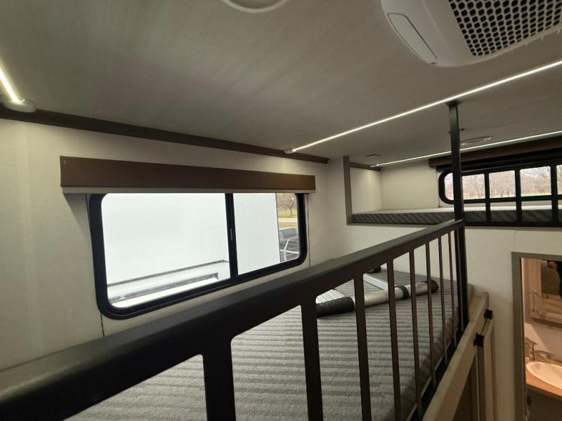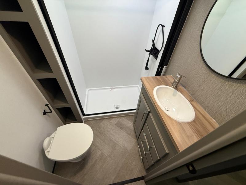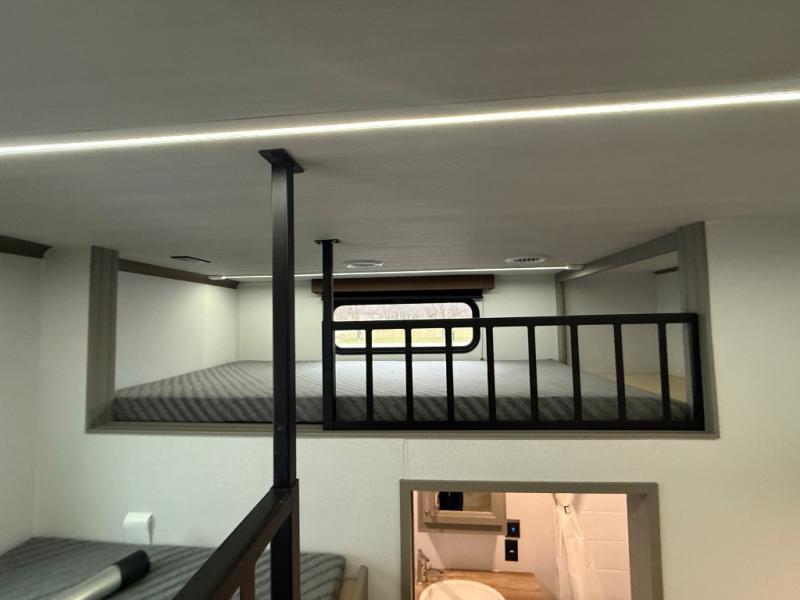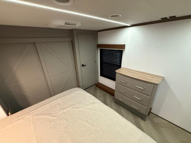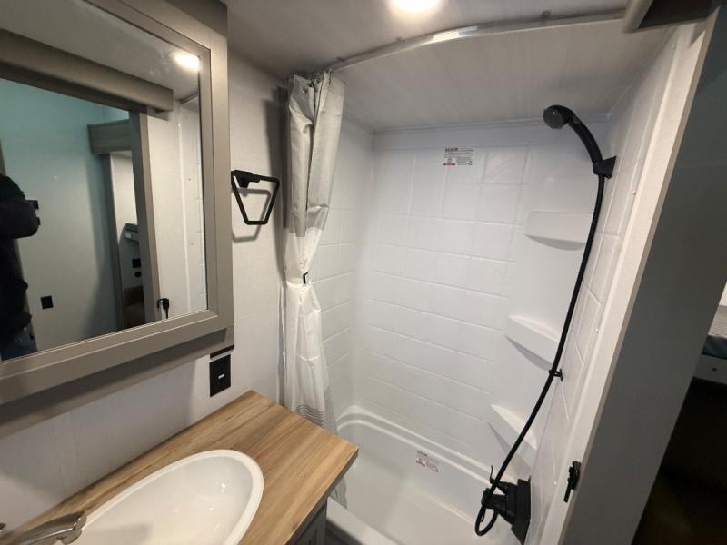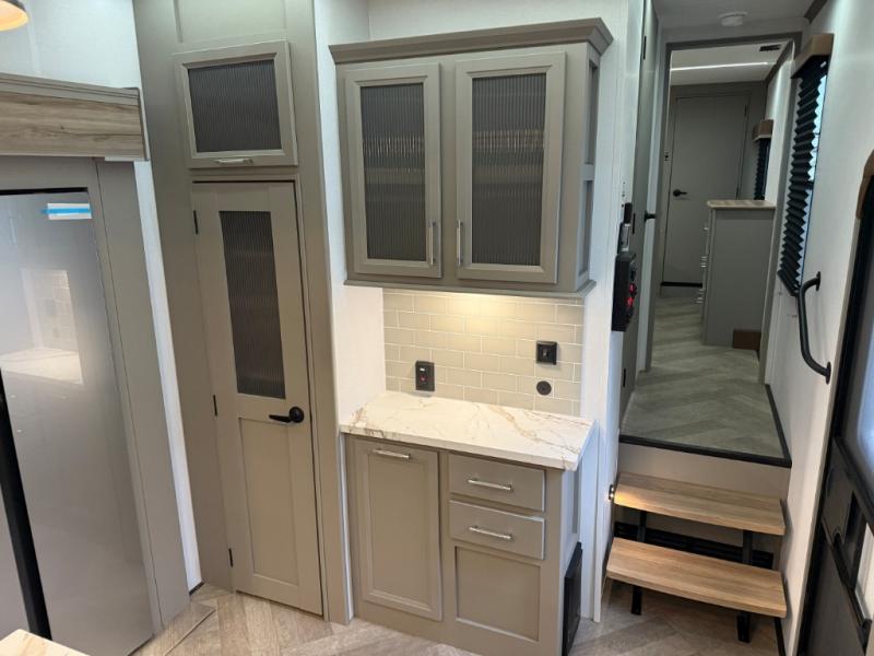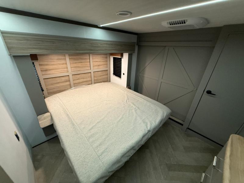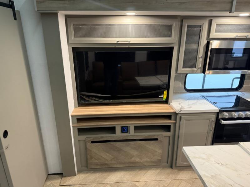 A great family bunkhouse fifth wheel featuring quad slides that really open this entire unit up to provide spacious living throughout. A booth dinette or optional free standing dinette is great for meals, and full reclining theater seating with massage, lights, and USB connectivity make movie night a real treat! The kids will love the rear bunkhouse with a separate bath and private entry for easy access when outside. There is even a loft area above for storage, so they can bring a few friends along as well. The kitchen has all of the features needed to allow you to cook and entertain when you want with a three burner range including a glass top, a 16 cu. ft. 12 volt refrigerator, pantry, hutch for dishes and things, plus a solid surface countertop on the center island that houses your sink. In the bedroom, a king bed slides out to offer more floor space to move about, plus you will find ample storage in the front wardrobe which has also been prepped for a washer and dryer if you choose to add. You can also add a TV in the bedroom since it has been prepped for one as well. And let's not forget the outside two burner cooktop and refrigerator!