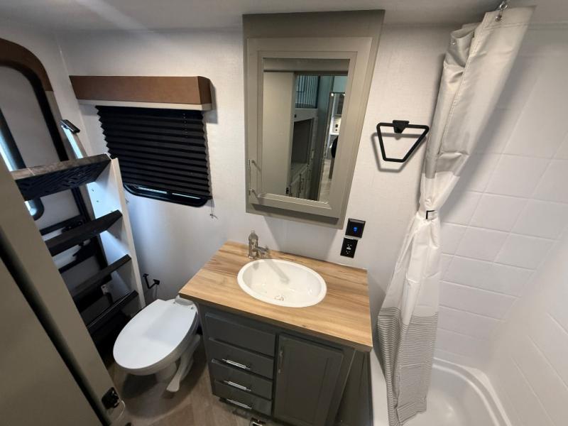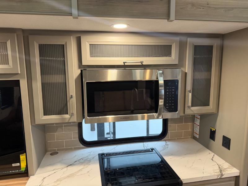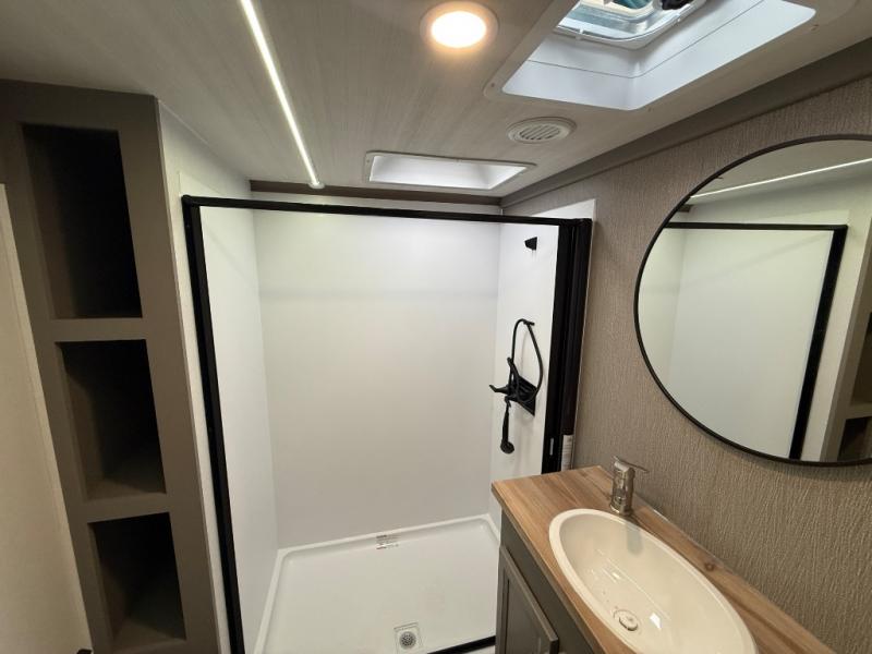 The Sprinter fifth wheels by Keystone feature spacious living areas, plenty of storage, and outstanding towability. Each unit is constructed with 2" aluminum framed and laminated sidewalls, a fully walkable roof, and dual layer insulation to help extend your camping season. The heated pass-through storage includes lockable slam latch baggage doors so you can easily pack your gear, and the one-touch 4-point leveling system features return hookup memory to have you set up in no-time. Head inside to find Congoleum vinyl flooring, Thomas Payne luxury collection furniture, residential style seamless marbled countertops, and an upgraded bedspread to name a few comforts. The Sprinter also includes a Girard tankless on-demand water heater, a central command center, plus a 30k BTU furnace and two A/C units to ensure your comfort!