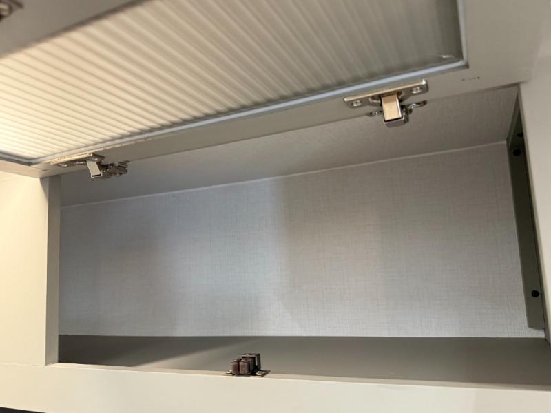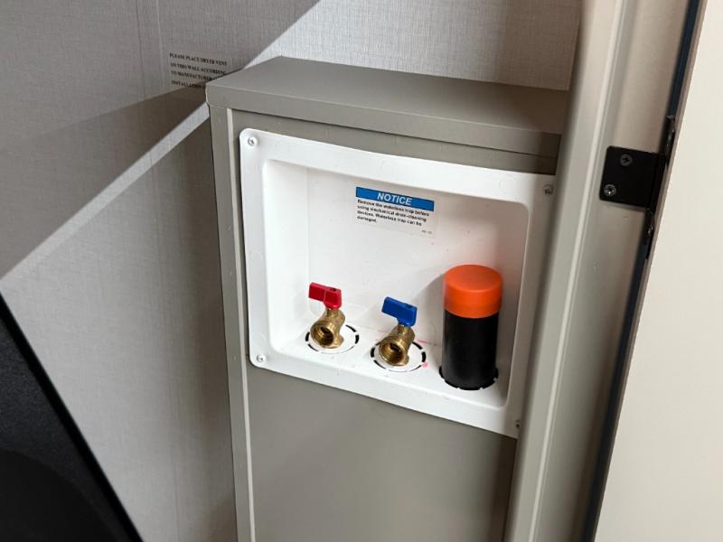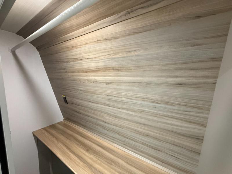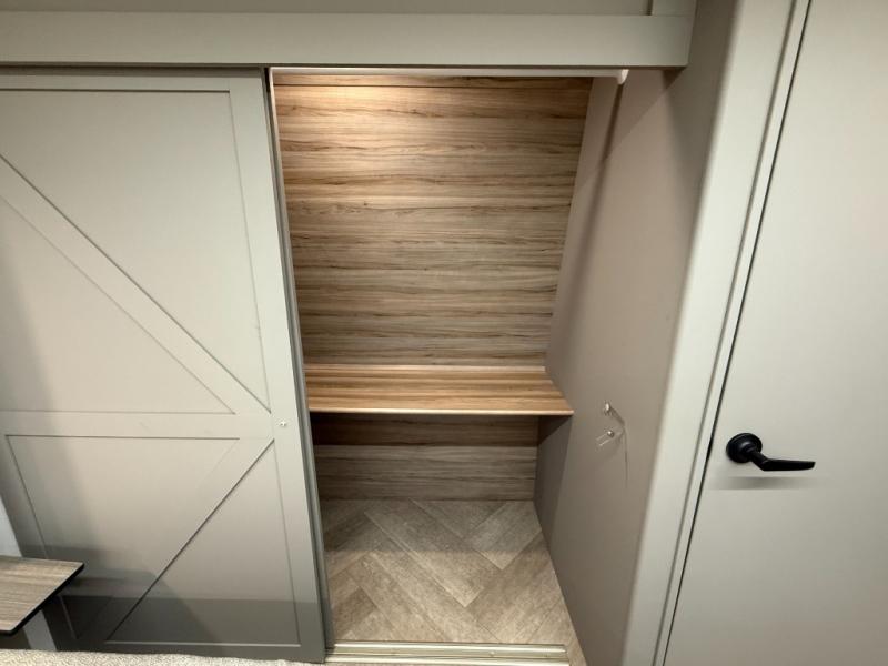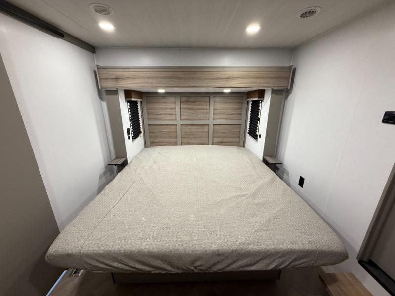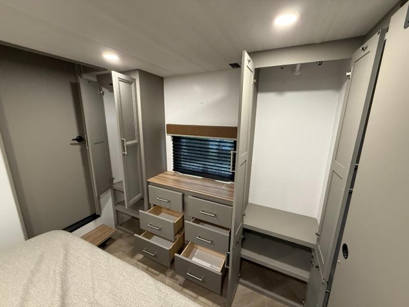 Front Suite: King bed in slide out, storage underneath, wardrobe, optional washer/dryer prep