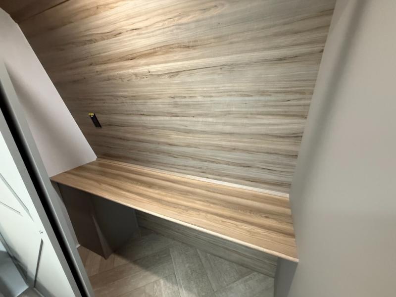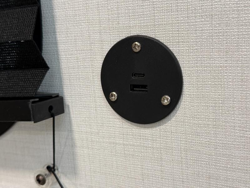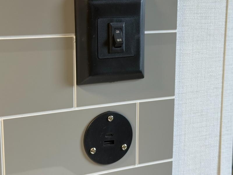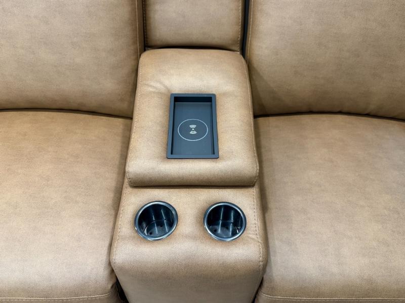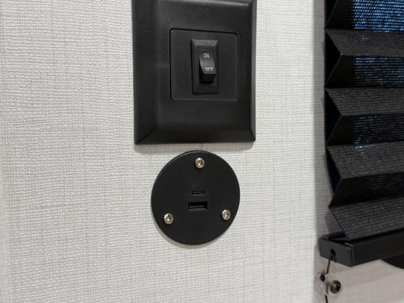 Interior Touches: Vinyl marine-grade flooring, Thomas Payne furniture, USB charging, LED fireplace, Wi-Fi/4G prep, unified color-coded wiring