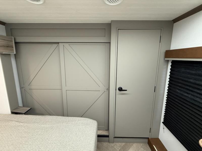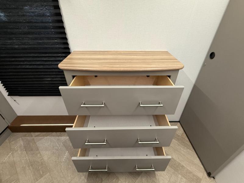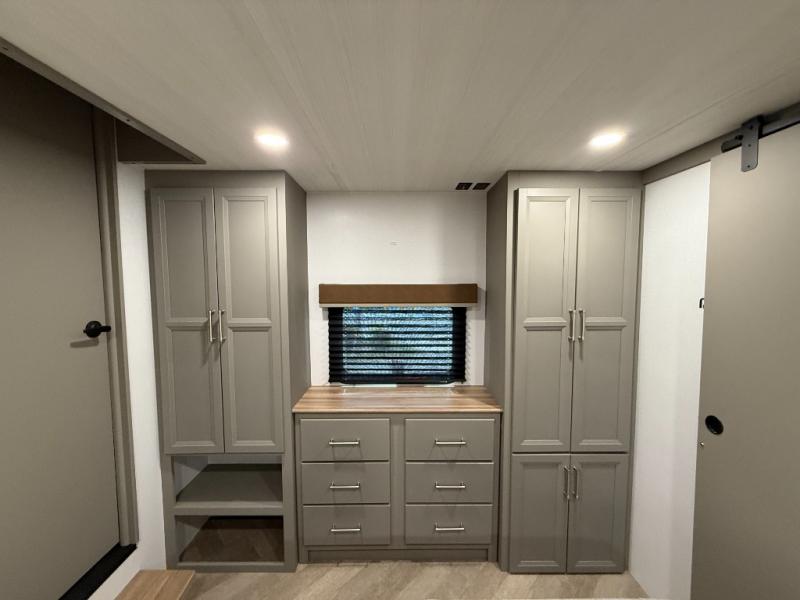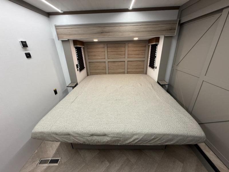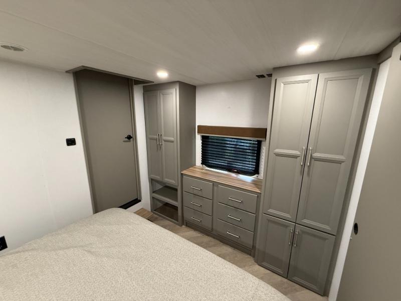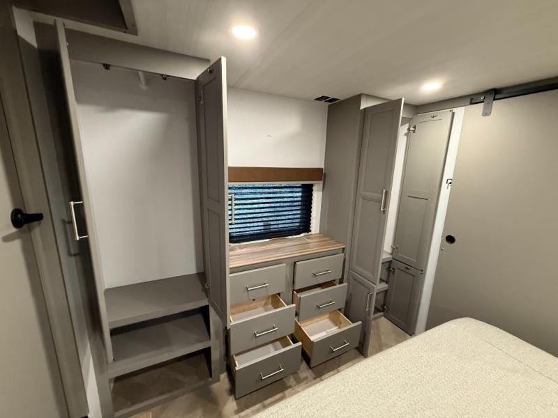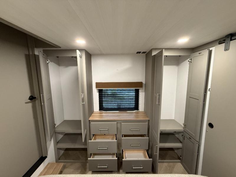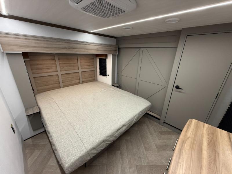 Rear Suite: Second king bed slide out, dual wardrobes, dresser, full bathroom with dual-entry doors
