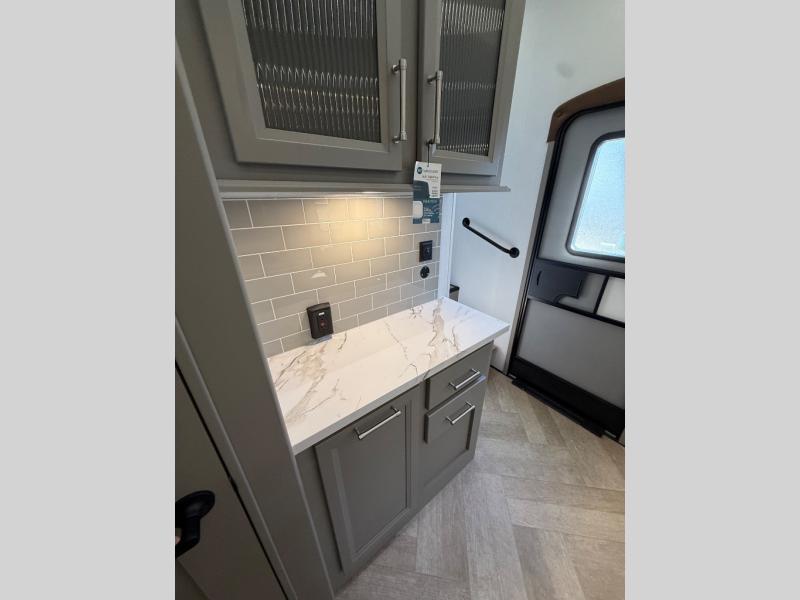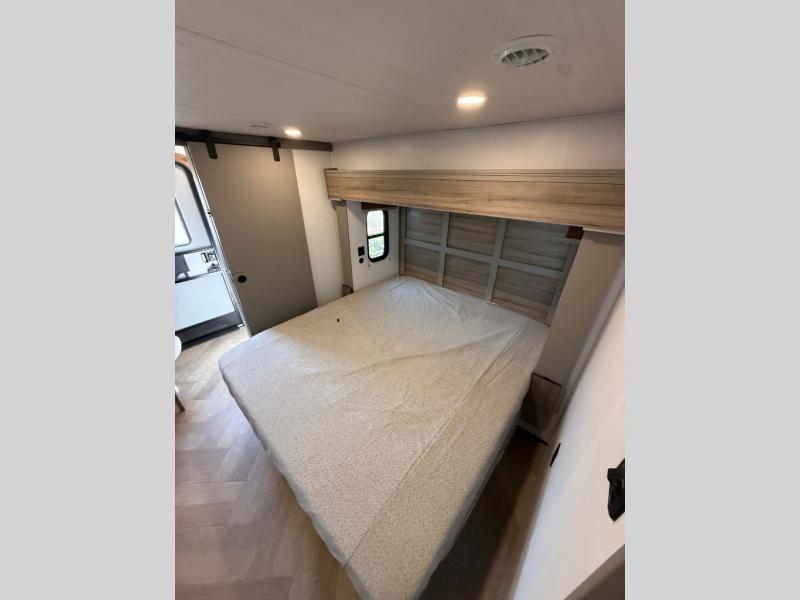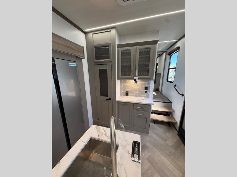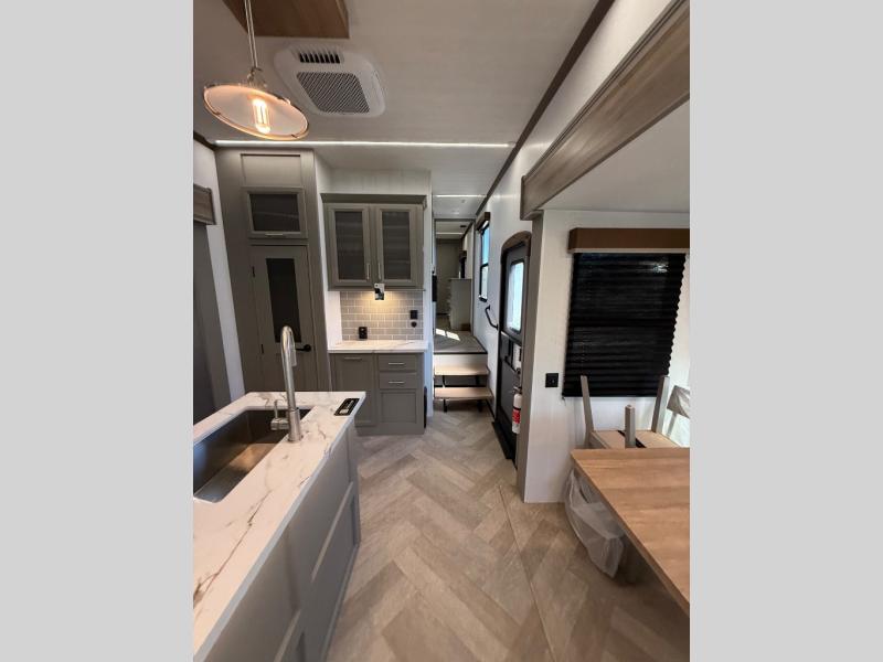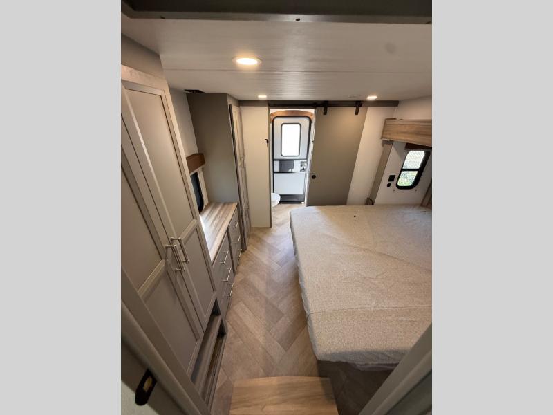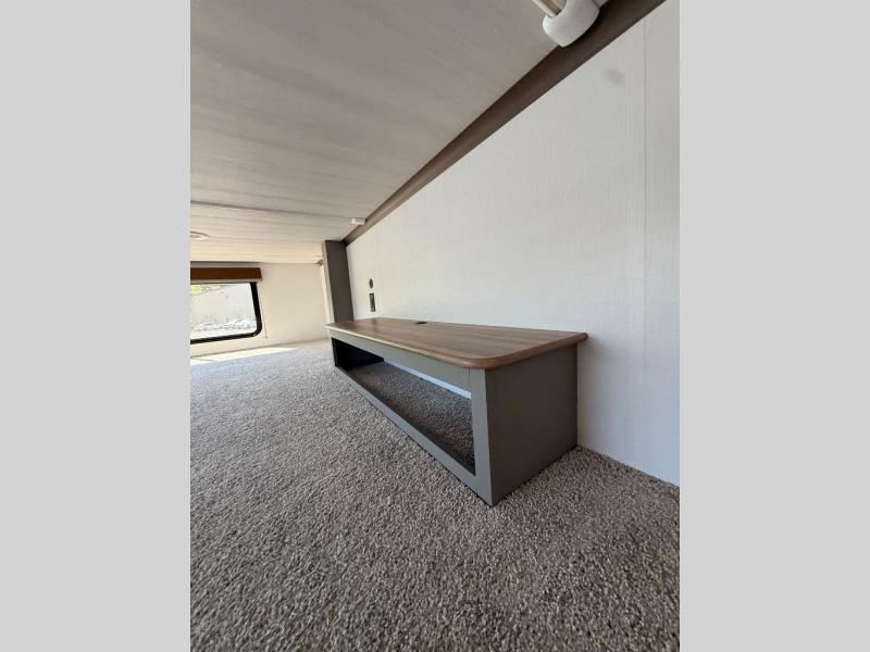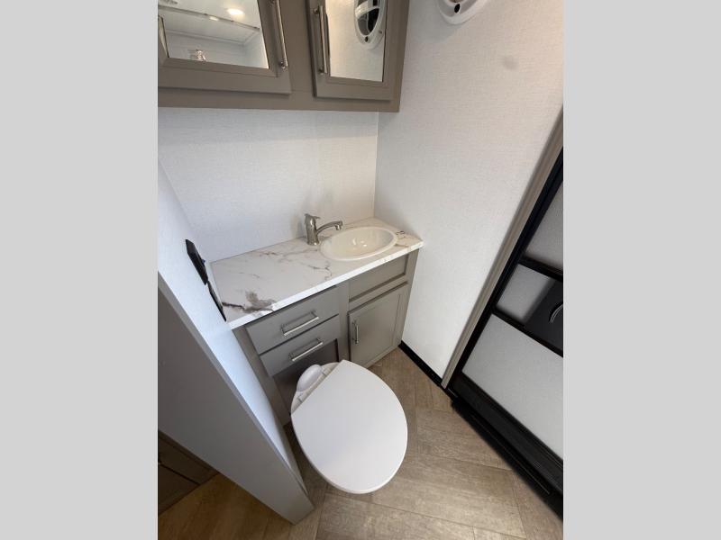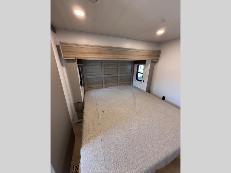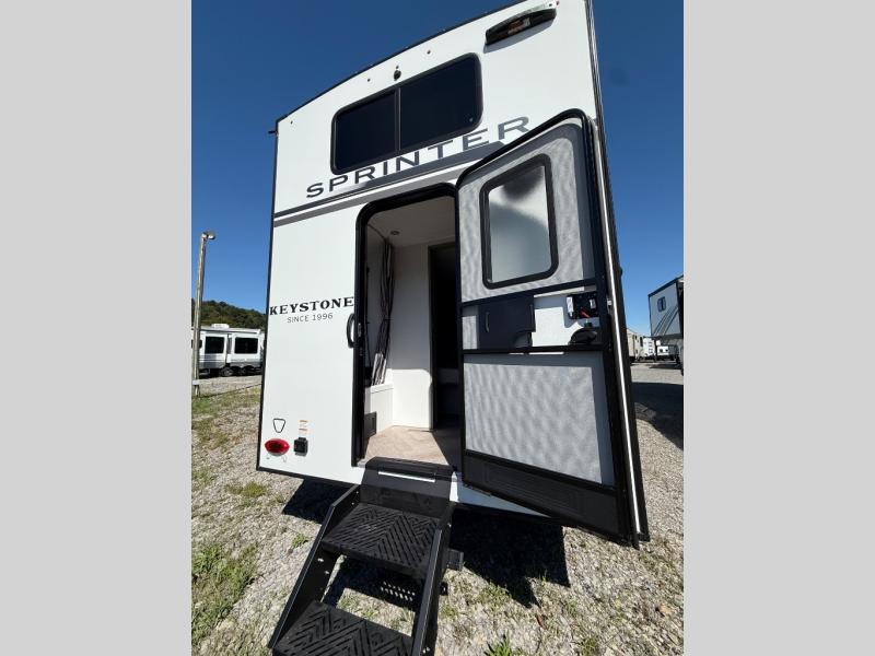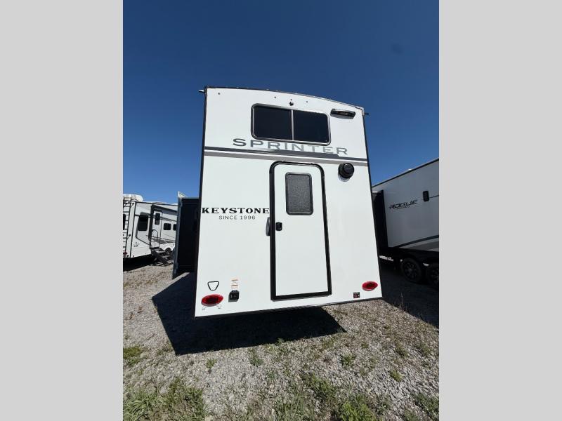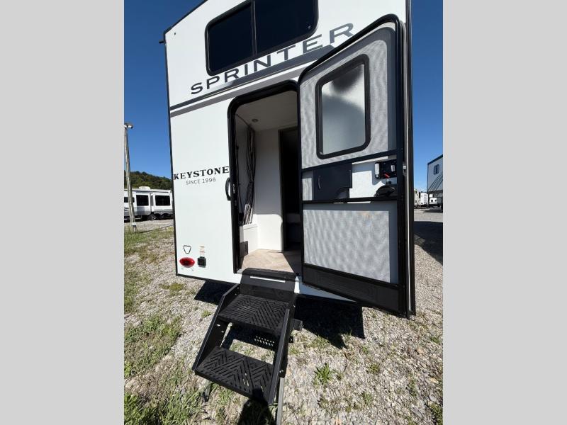 The Sprinter fifth wheels by Keystone feature spacious living areas, plenty of storage, and outstanding towability. Each unit is constructed with 2" aluminum framed and laminated sidewalls, a fully walkable roof, and dual layer insulation to help extend your camping season. The heated pass-through storage includes lockable slam latch baggage doors so you can easily pack your gear, and the one-touch 4-point leveling system features return hookup memory to have you set up in no-time. Head inside to find Congoleum vinyl flooring, Thomas Payne luxury collection furniture, residential style seamless marbled countertops, and an upgraded bedspread to name a few comforts. The Sprinter also includes a Girard tankless on-demand water heater, a central command center, plus a 30k BTU furnace and two A/C units to ensure your comfort!