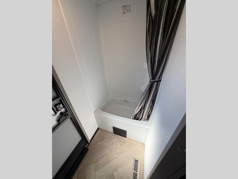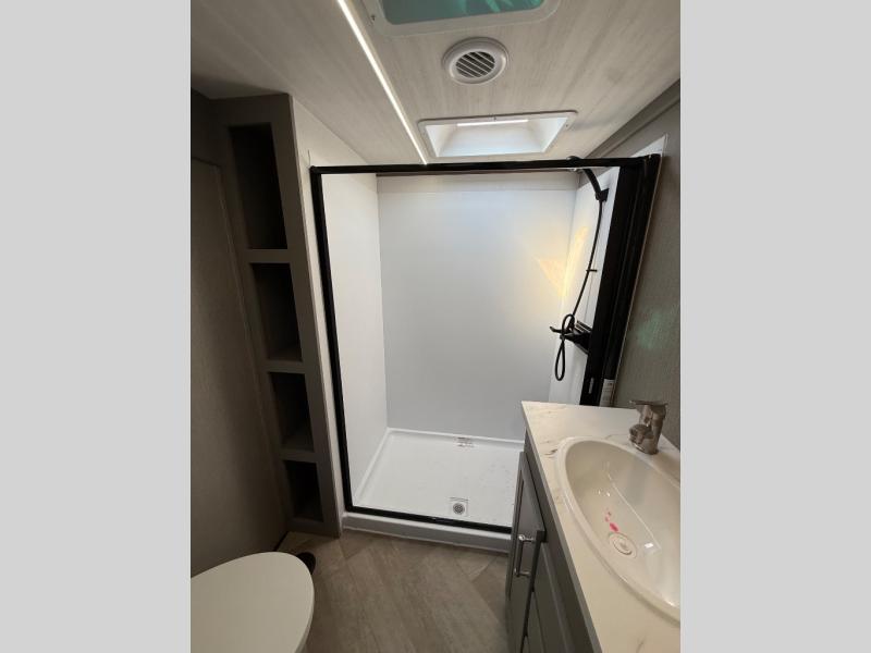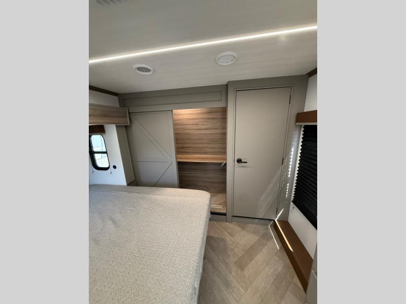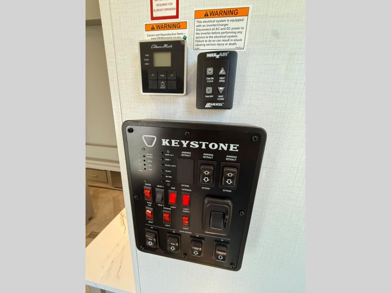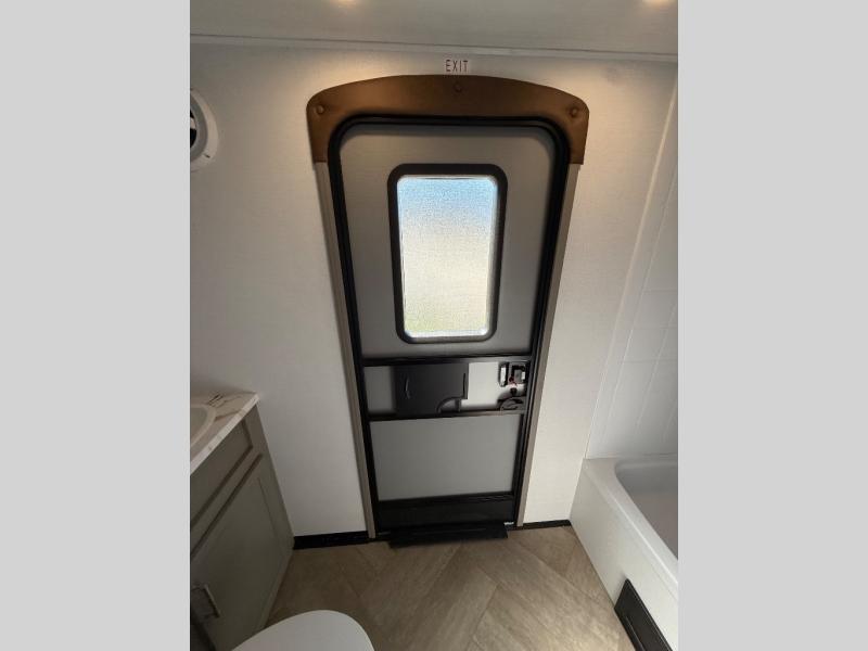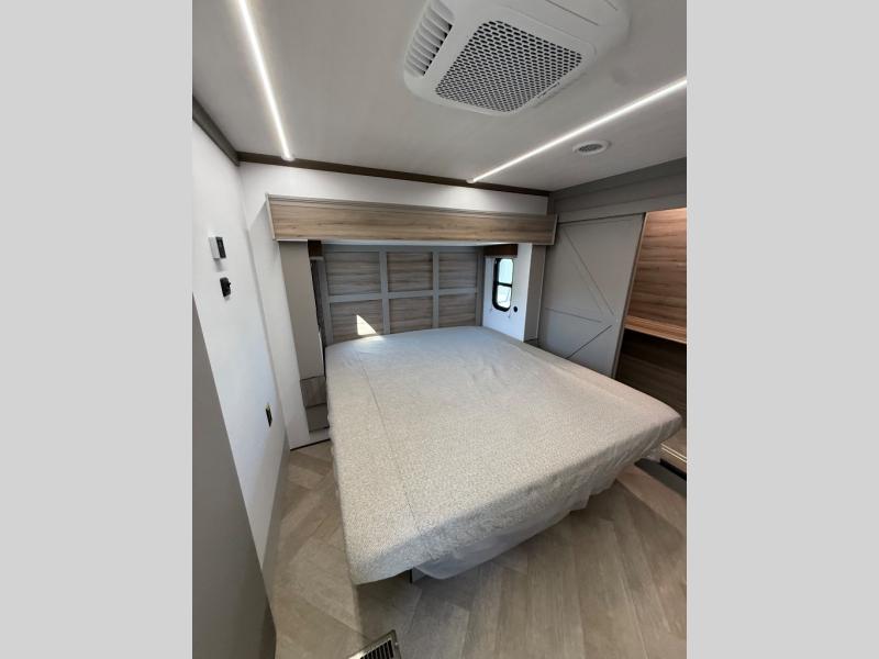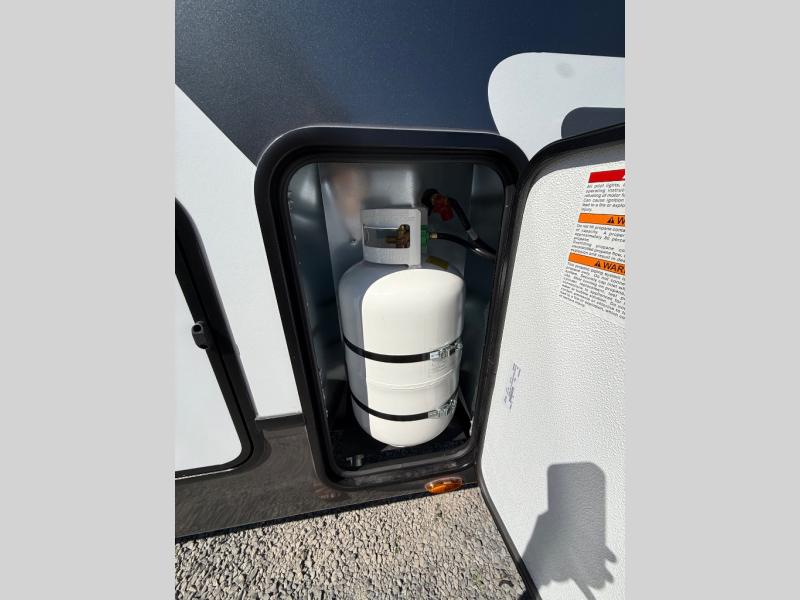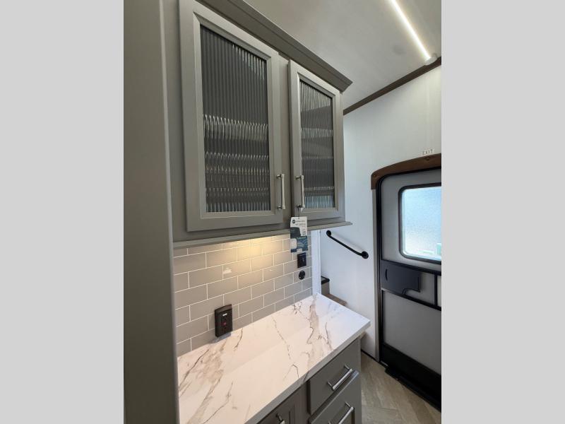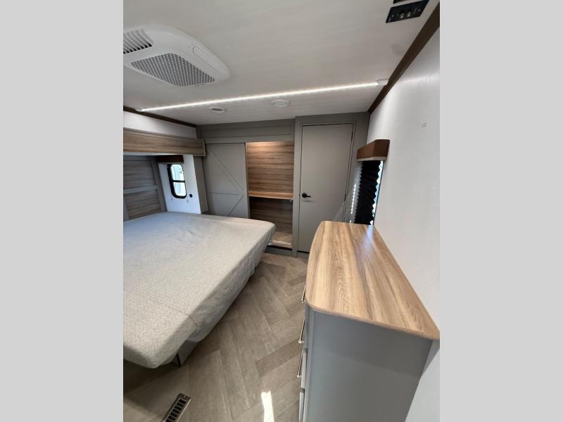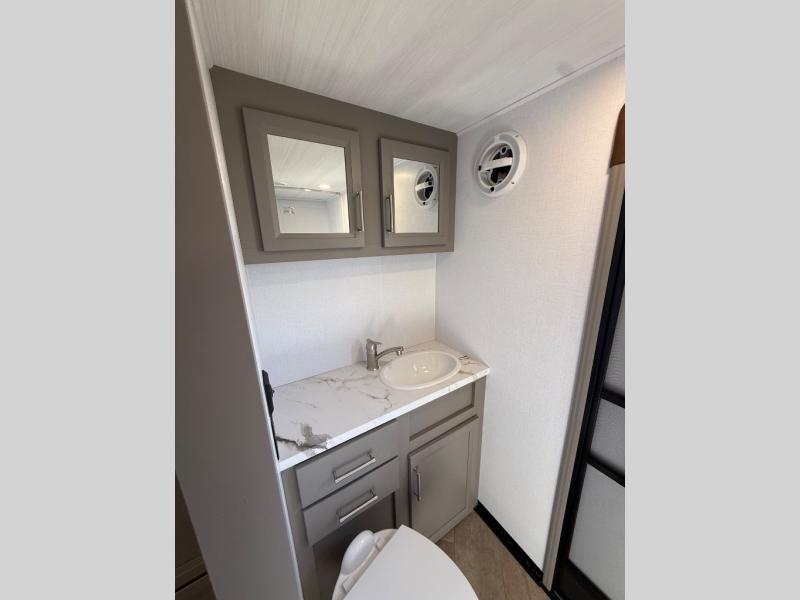 The Sprinter fifth wheels by Keystone feature spacious living areas, plenty of storage, and outstanding towability. Each unit is constructed with 2" aluminum framed and laminated sidewalls, a fully walkable roof, and dual layer insulation to help extend your camping season. The heated pass-through storage includes lockable slam latch baggage doors so you can easily pack your gear, and the one-touch 4-point leveling system features return hookup memory to have you set up in no-time. Head inside to find Congoleum vinyl flooring, Thomas Payne luxury collection furniture, residential style seamless marbled countertops, and an upgraded bedspread to name a few comforts. The Sprinter also includes a Girard tankless on-demand water heater, a central command center, plus a 30k BTU furnace and two A/C units to ensure your comfort!
